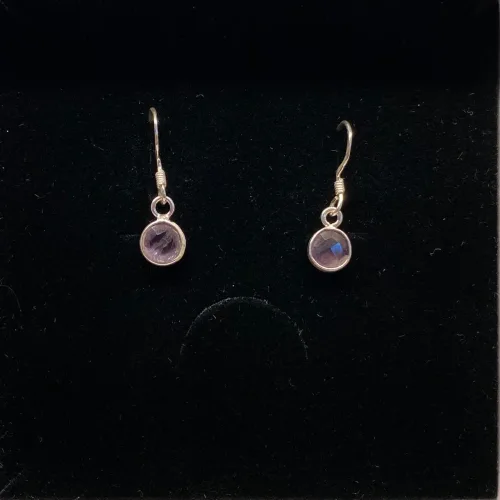 Sølv ørenringe med lille rund Ametyst, der er facetslebet.