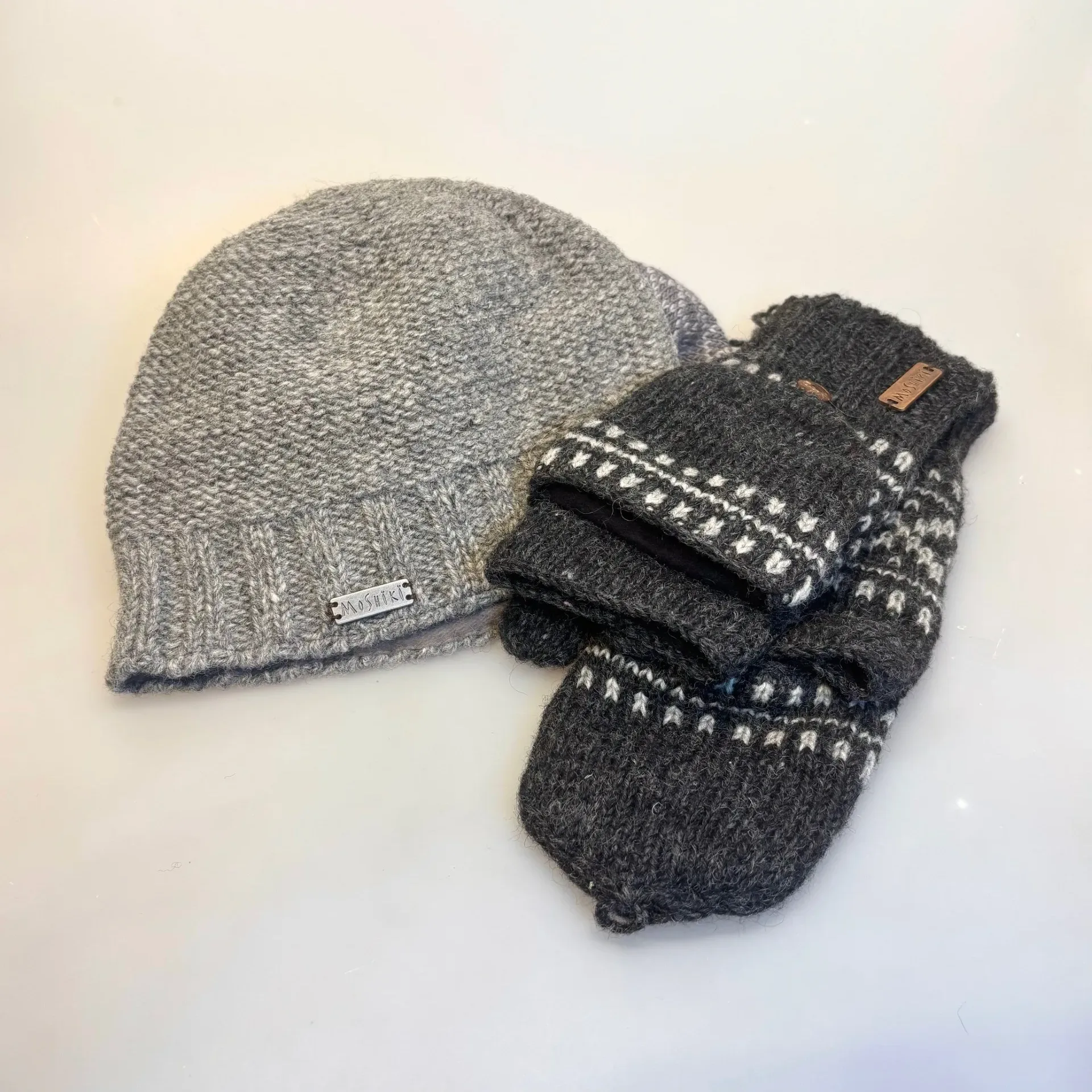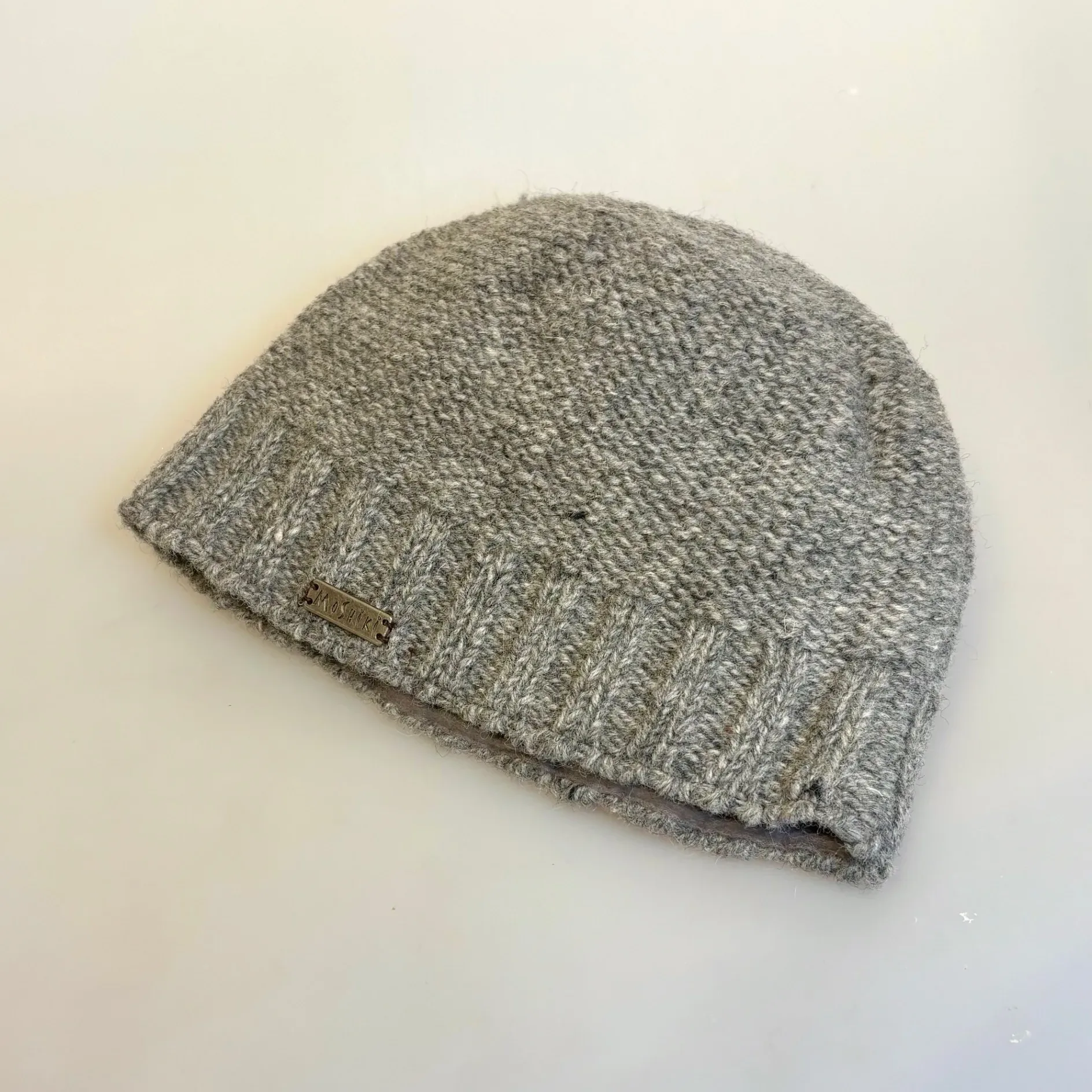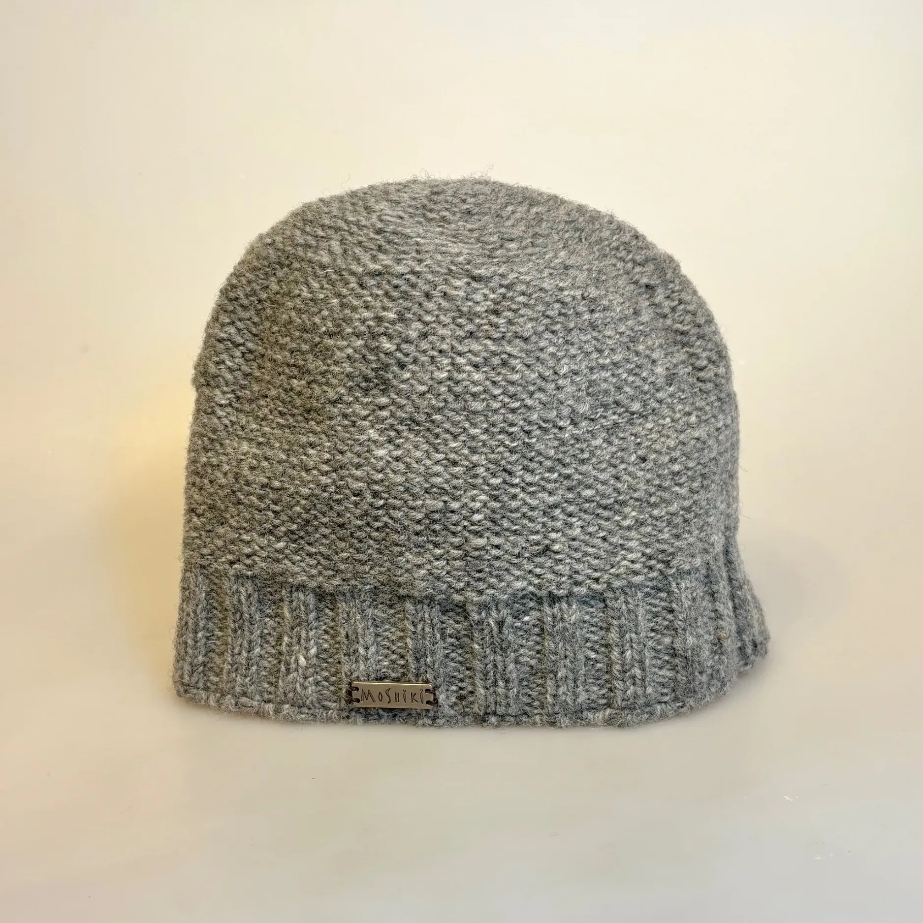 Lækker ulden hue strikket i kraftig uld. Strikhuen fremstår ensfarvet grå.  Ved nærmere studie kan man se, at den håndstrikkede hue har et fint farvespil. Modellen er helt klassisk, en enkel beanie model. Huens puld er glatstrikket og nederst har den en bred ribkant,