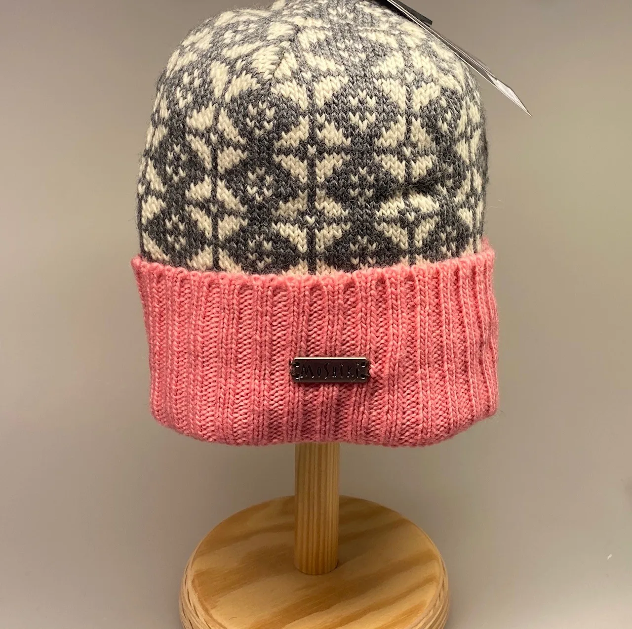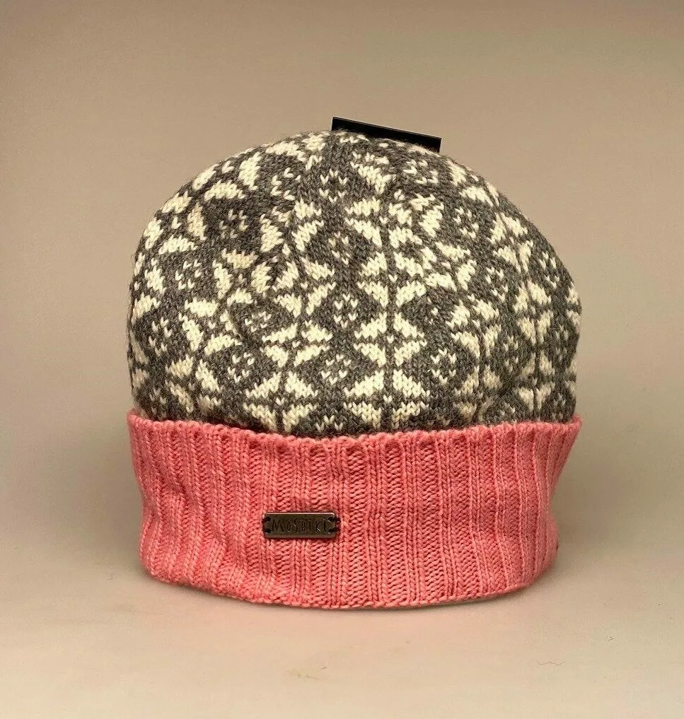 Smart ulden hue i ren blød merinould. Huen er glatstrikket med det smukkeste og elegante mønster af geometriske figurer i grå og elfenbenshvid. Mønsteret er enkelt og stiligt i en diskret. Den brede opbukkede ribkant er ensfarvet rosa – en delikat klar rosa.