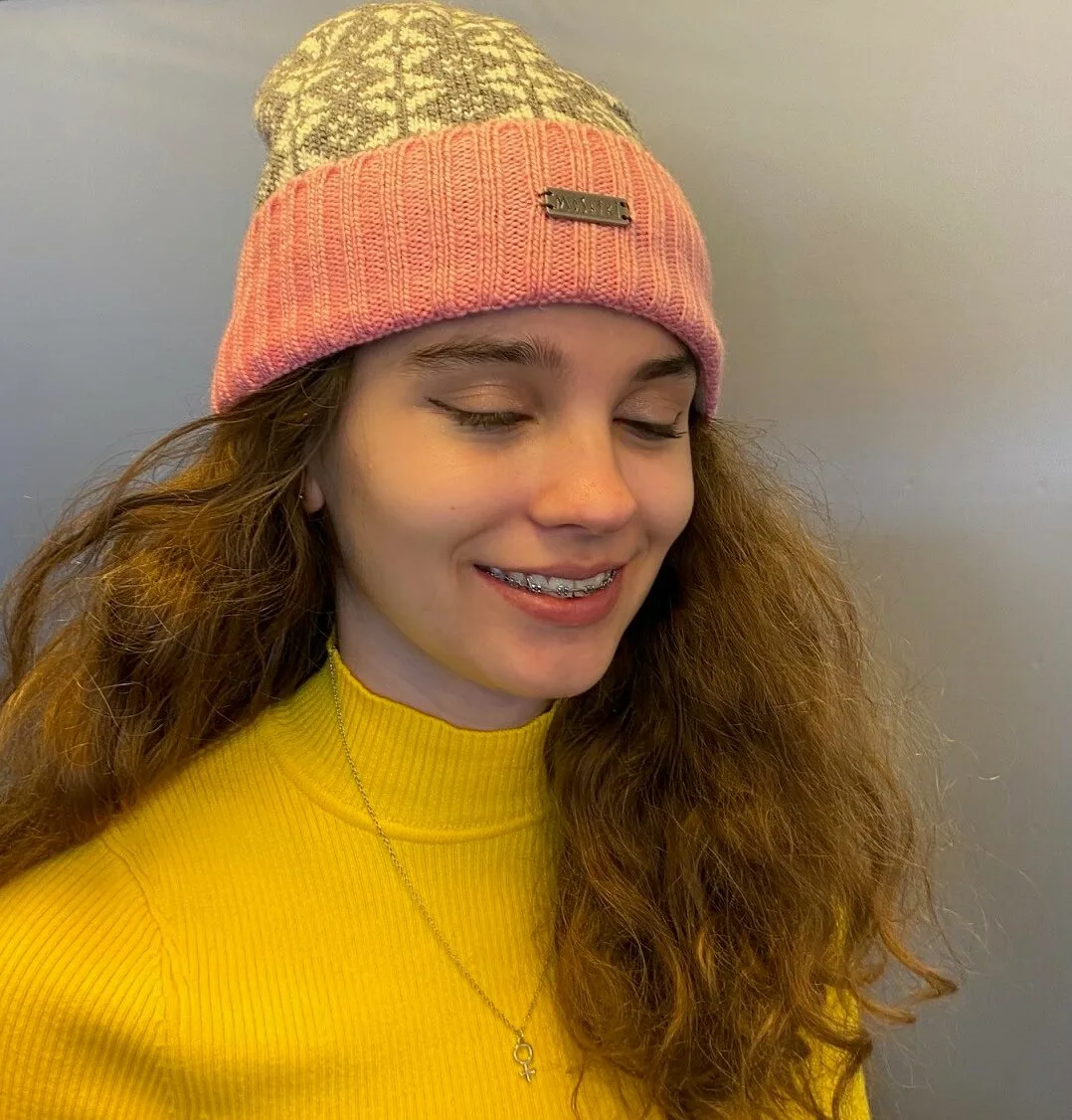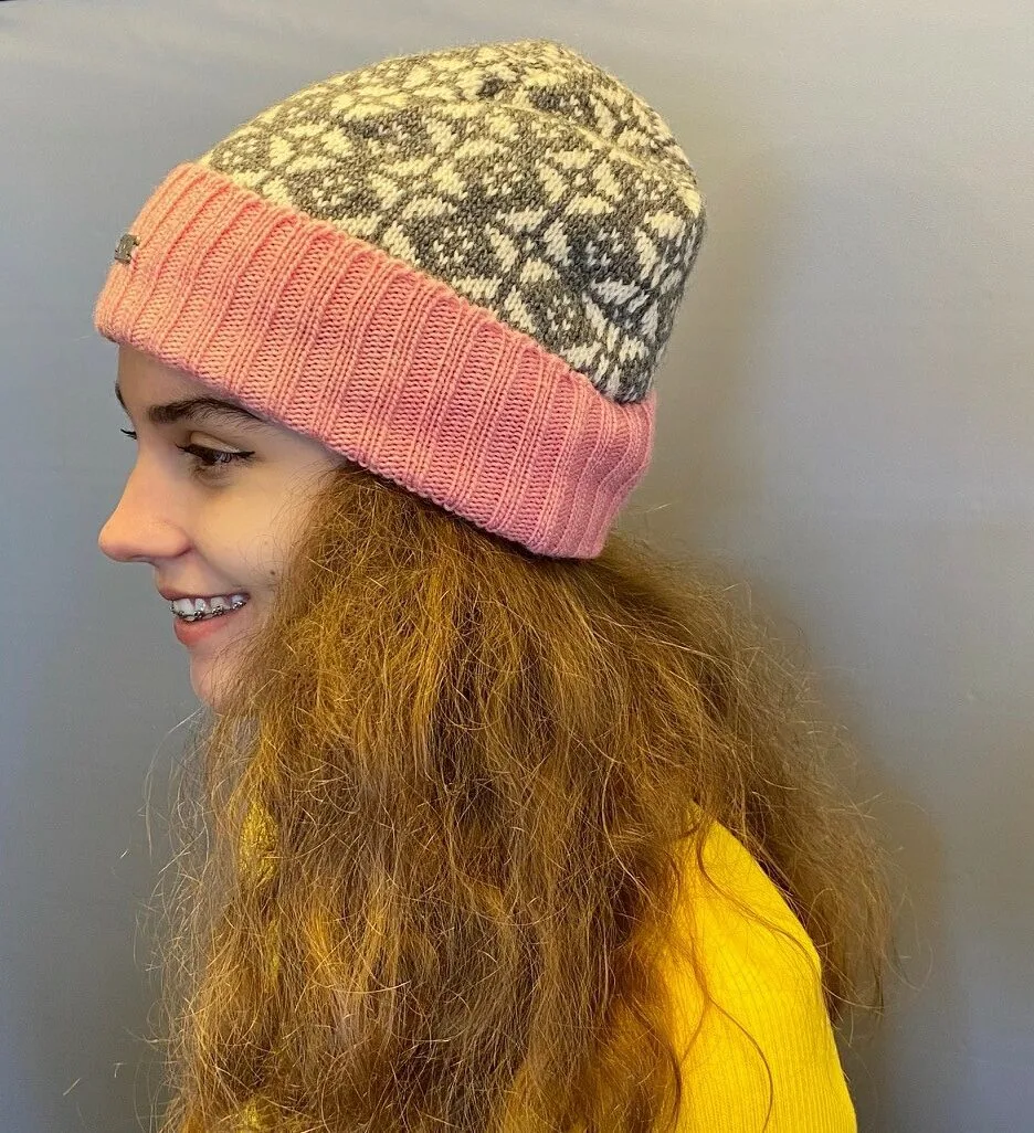 Strikket Hue Uld med Foer og Ombuk – Grå/Natur med Rosa