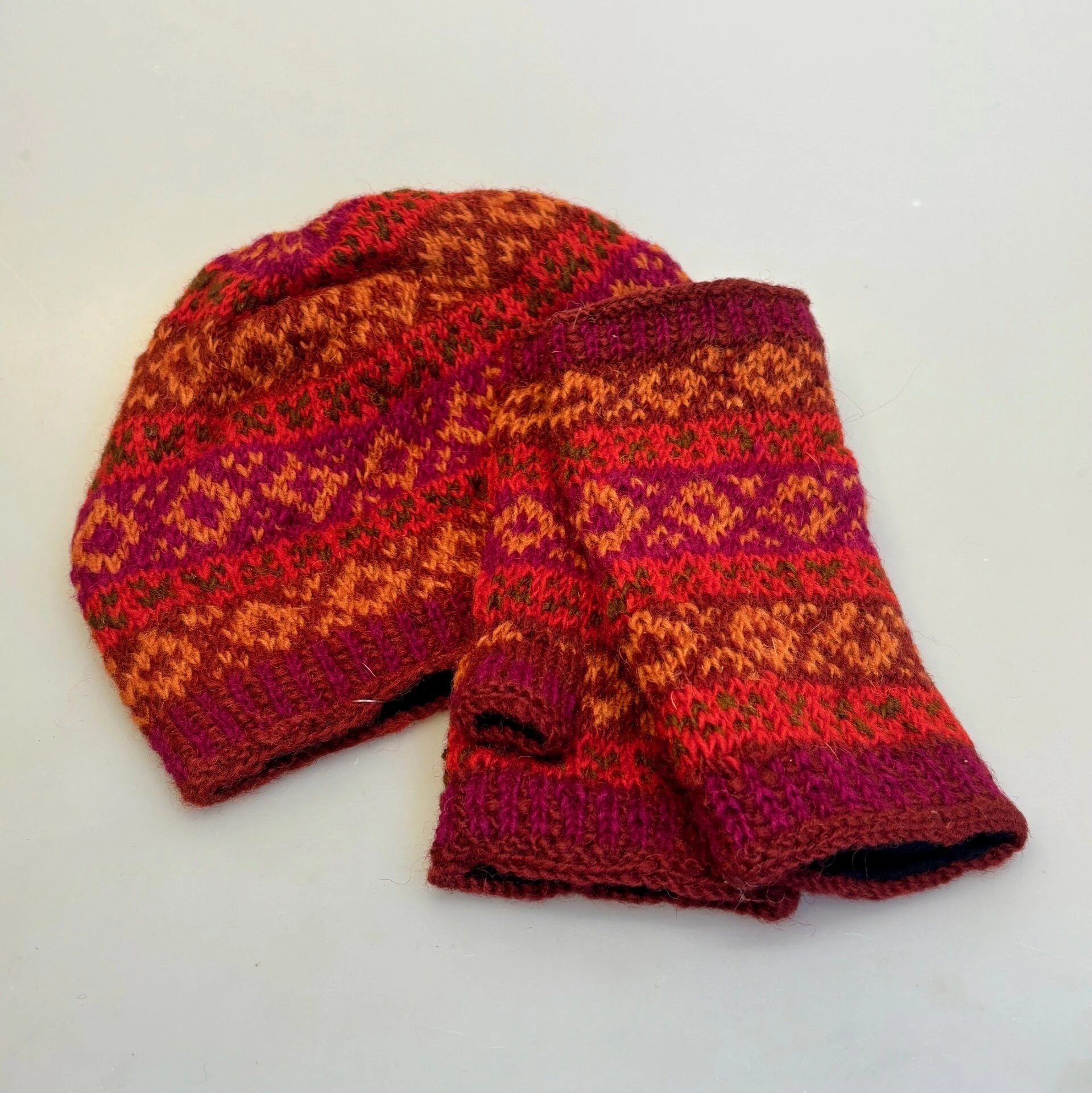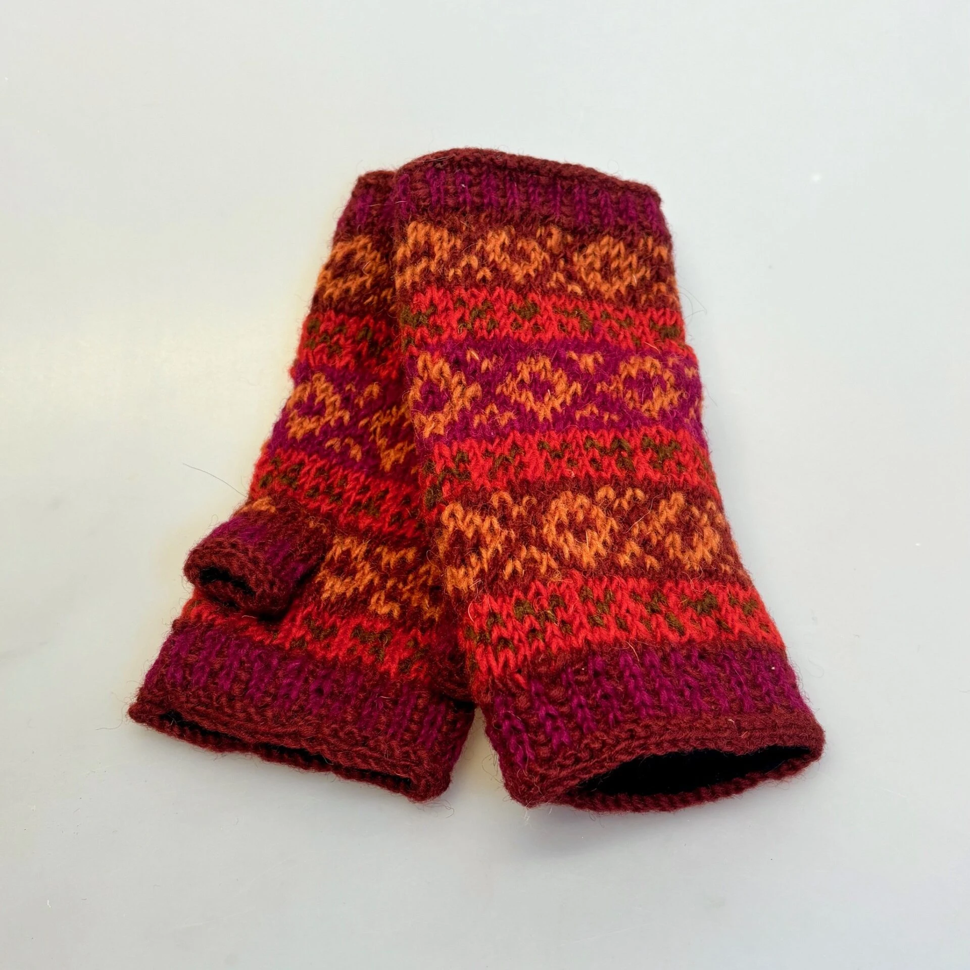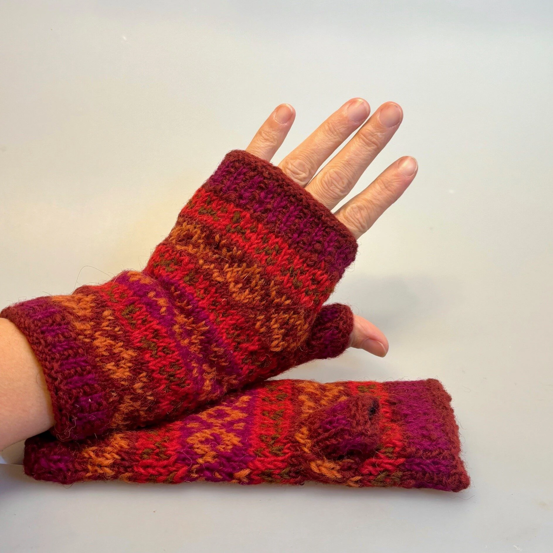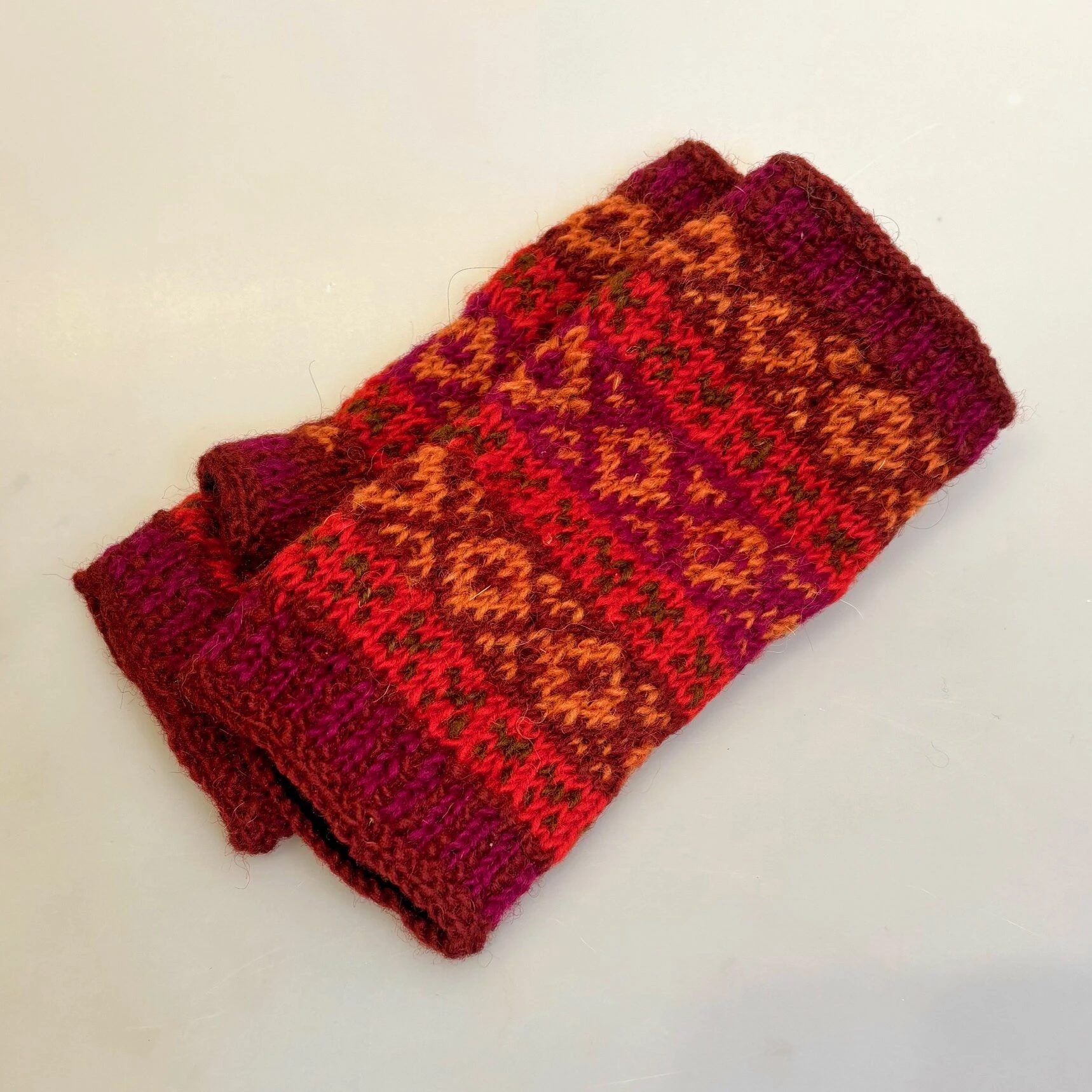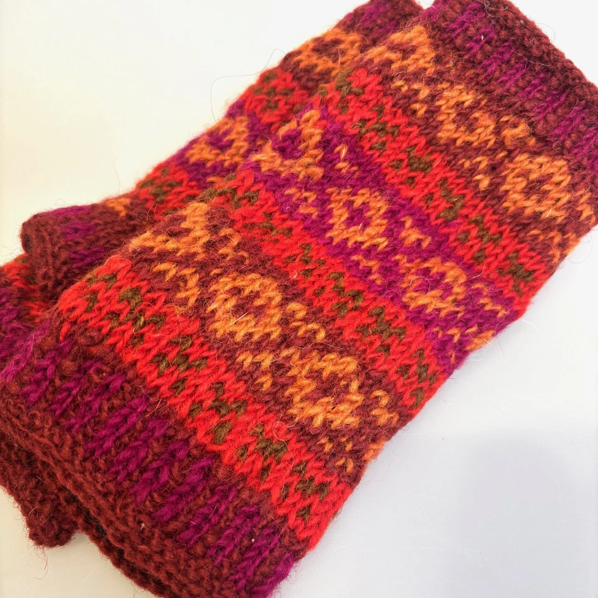 Disse lækre pulsvarmere er håndstrikkede af ren uld. De er strikket med et mønster, der består af flotte mønsterborter, der danner et flot og interessant stribemønster. Farverne er nøje afstemt, i matchende toner fra samme farveskala.