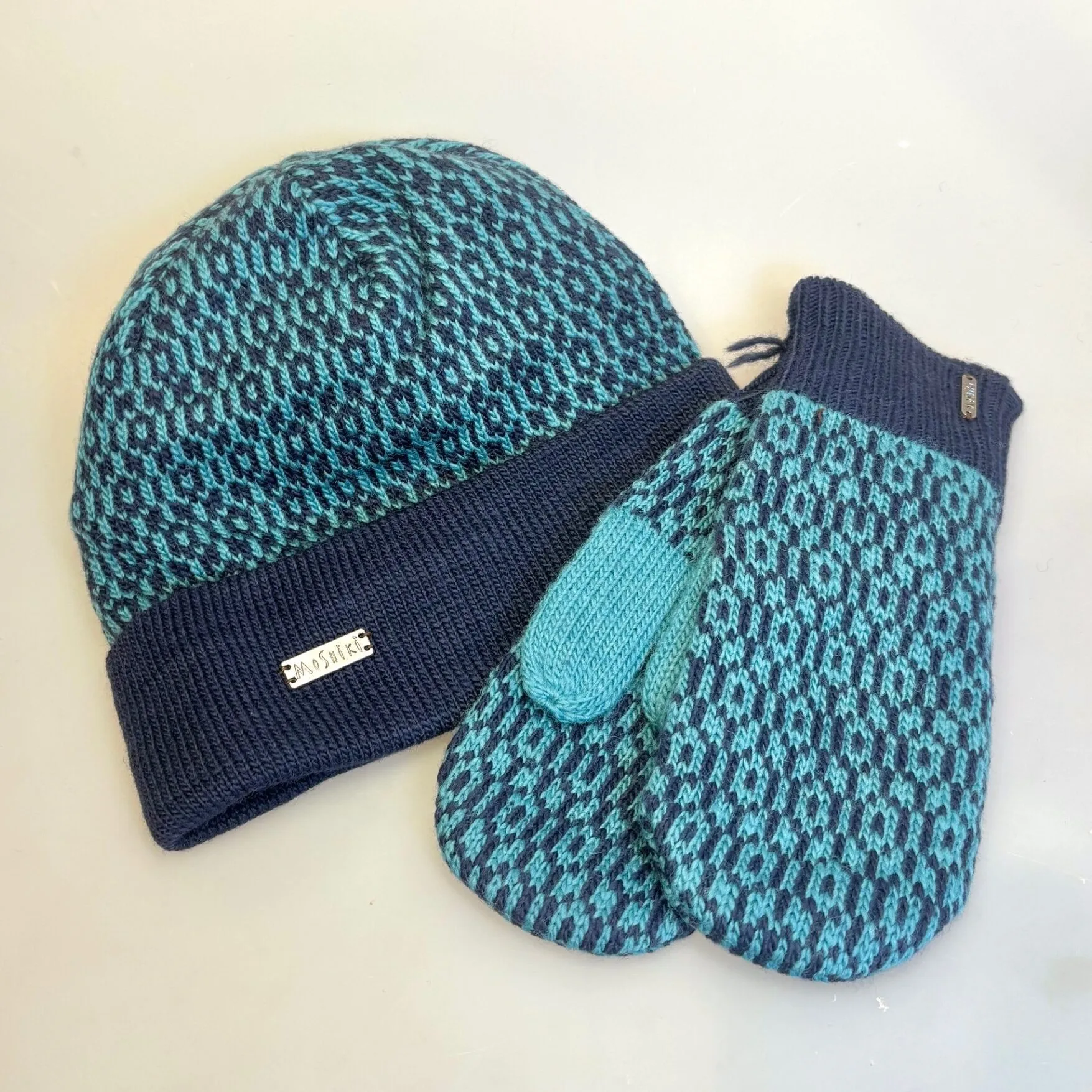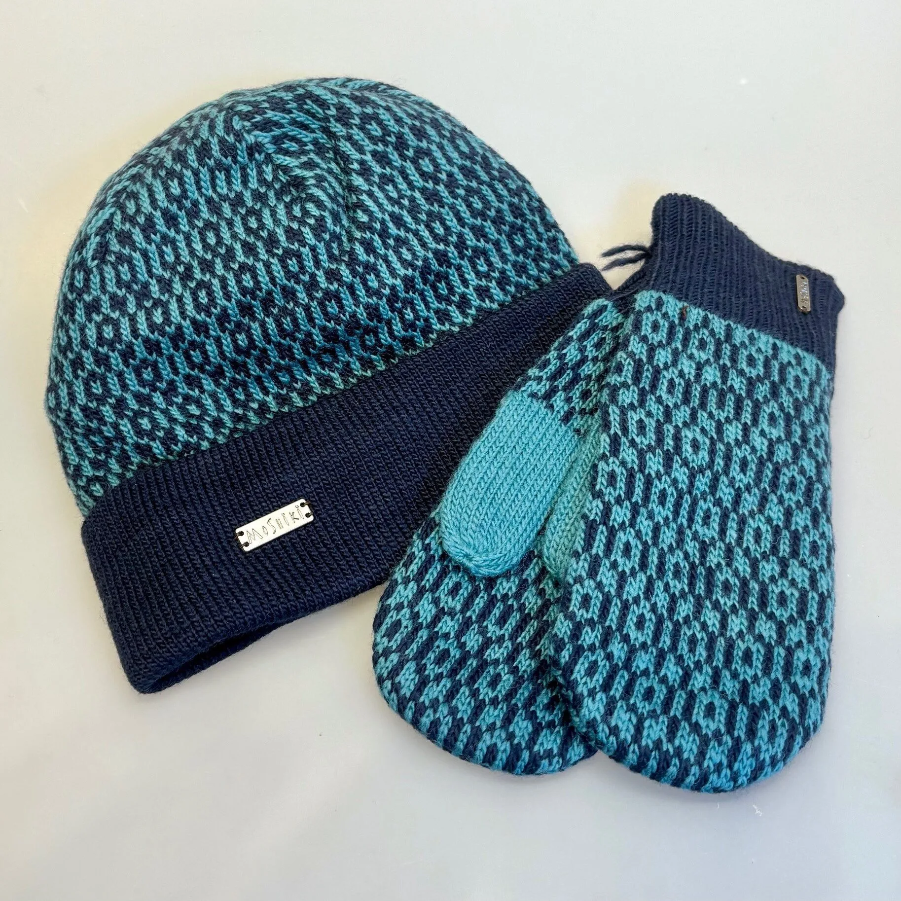Smarte lette uldne vanter i ren blød uld. Lufferne er glatstrikkede i hånden. Modellen er enkel og har en god længde, med en ensfarvet mørkeblå ribkant, der varmer godt op ad håndled og arm. Bundfarven er en klassisk mørkeblå med et flot grafisk kubemønster i en lysere petroleumsblå. En både elegant og moderne vante.