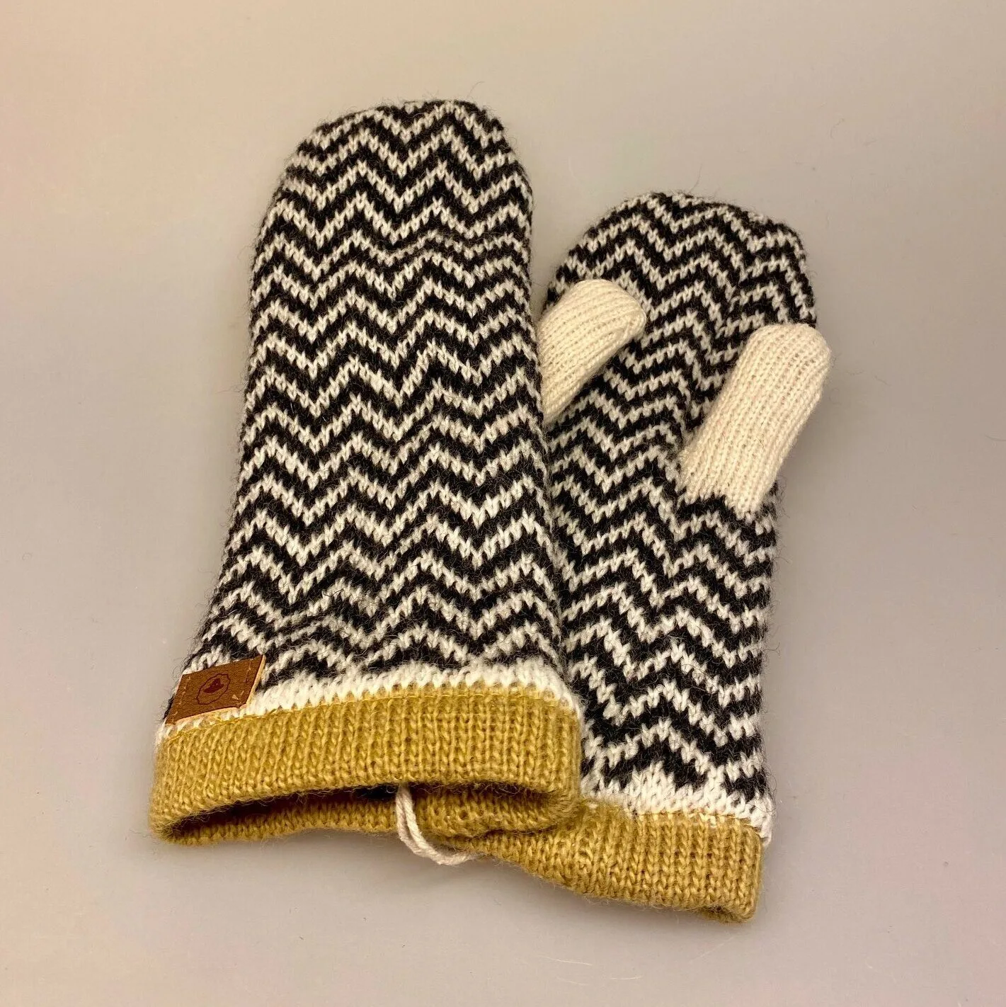 Smarte uldne luffer i ren blød merinould. Vanterne er glatstrikkede med fint og elegant zig-zag mønster i koksgrå og natur. De afsluttes med en frisk detaljer, i form af en lys karrygul strikket kant.