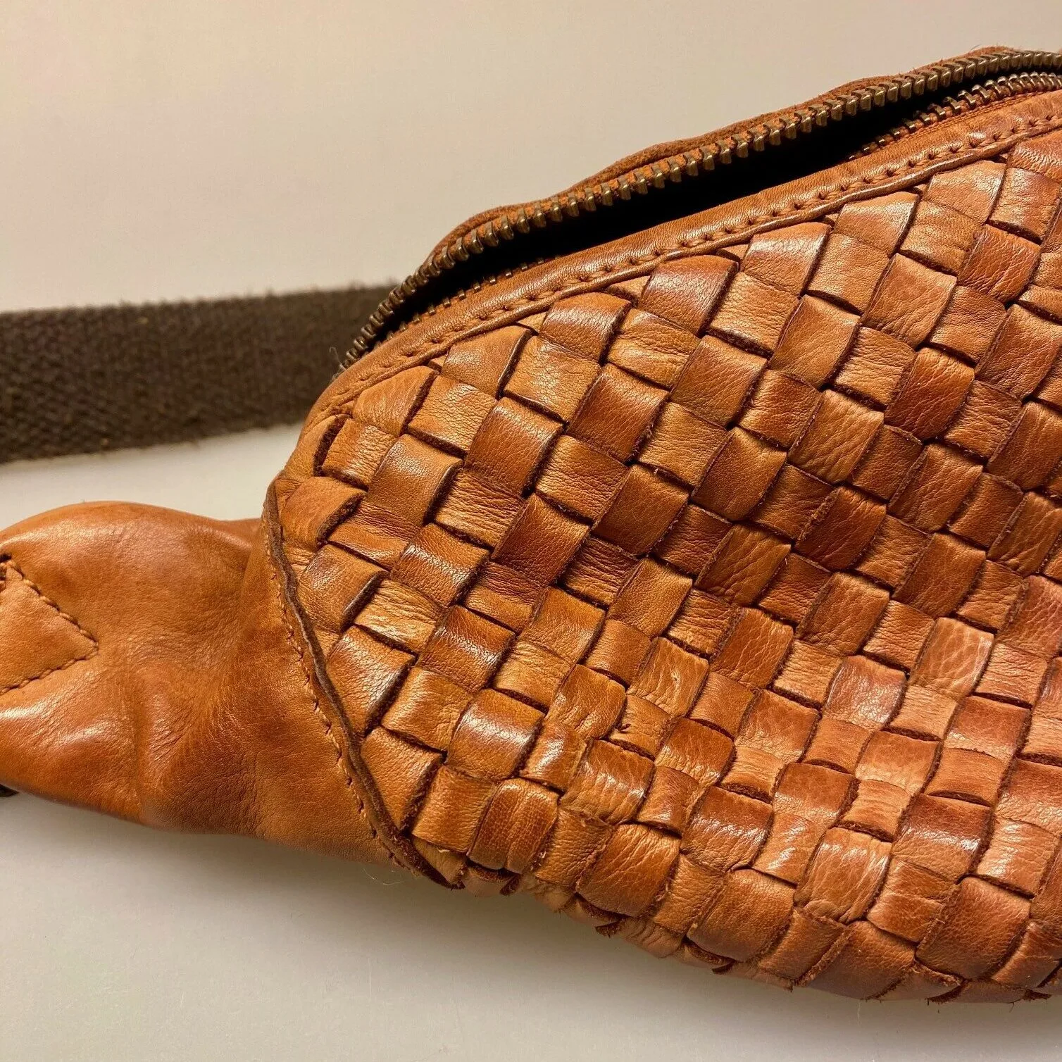 Lækker bæltetaske i kraftigt flettet skind.