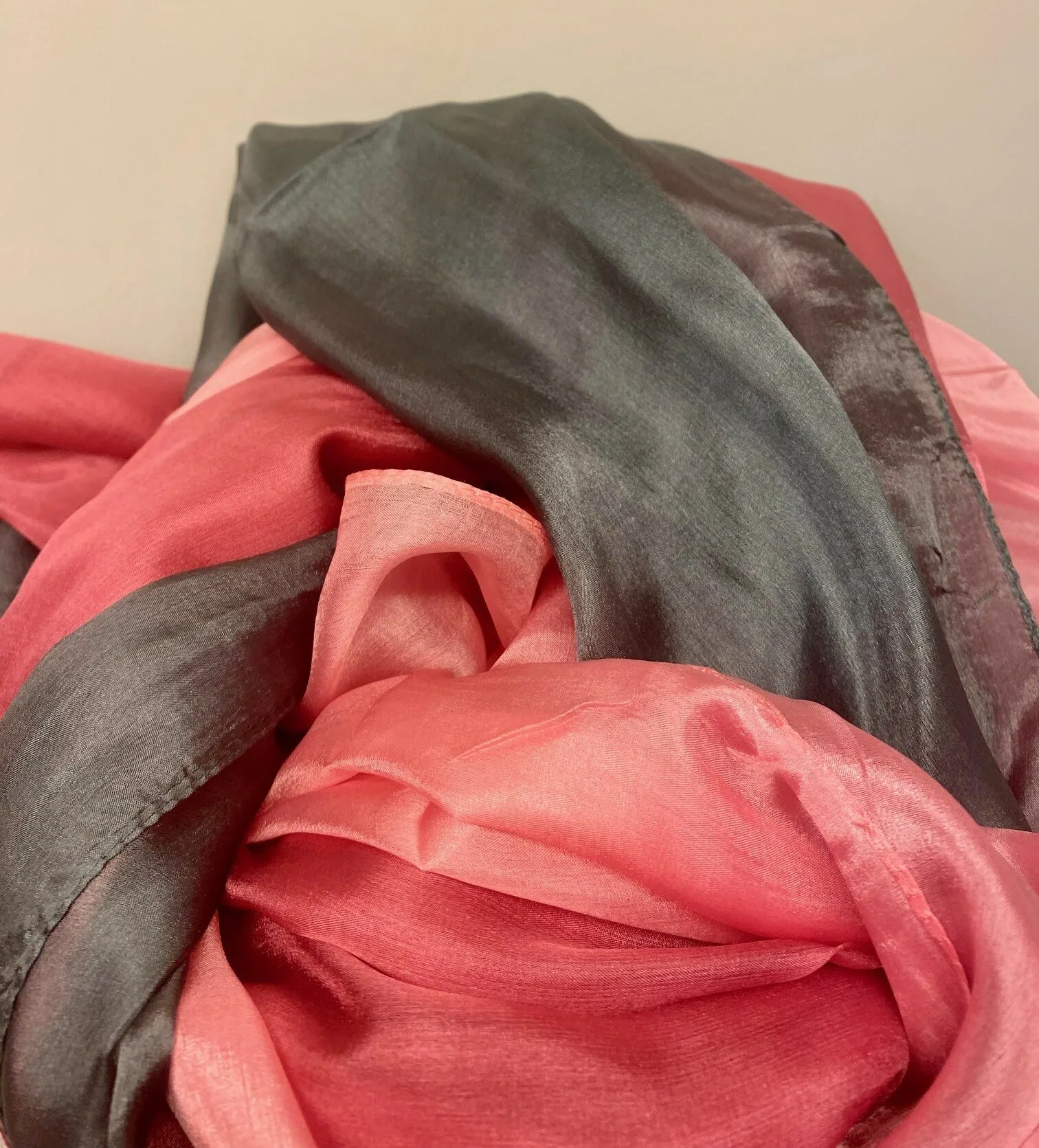 Smukt og anvendeligt tørklæde i ren silke. Tørklædet er lavet af let pongé vævet silke og har fine stukne kanter med pyntesøm. Silken er koloreret med farveforløb tone-i-tone, så hvert tørklæde har flere fine toner.