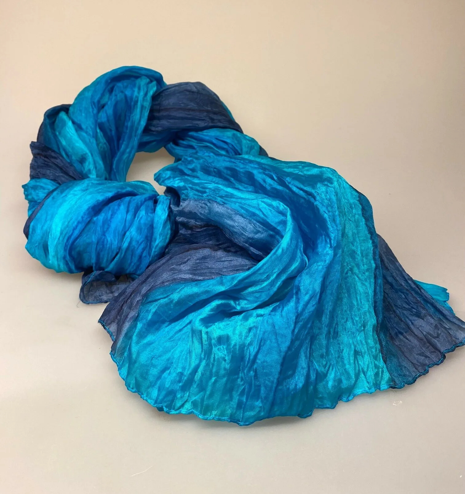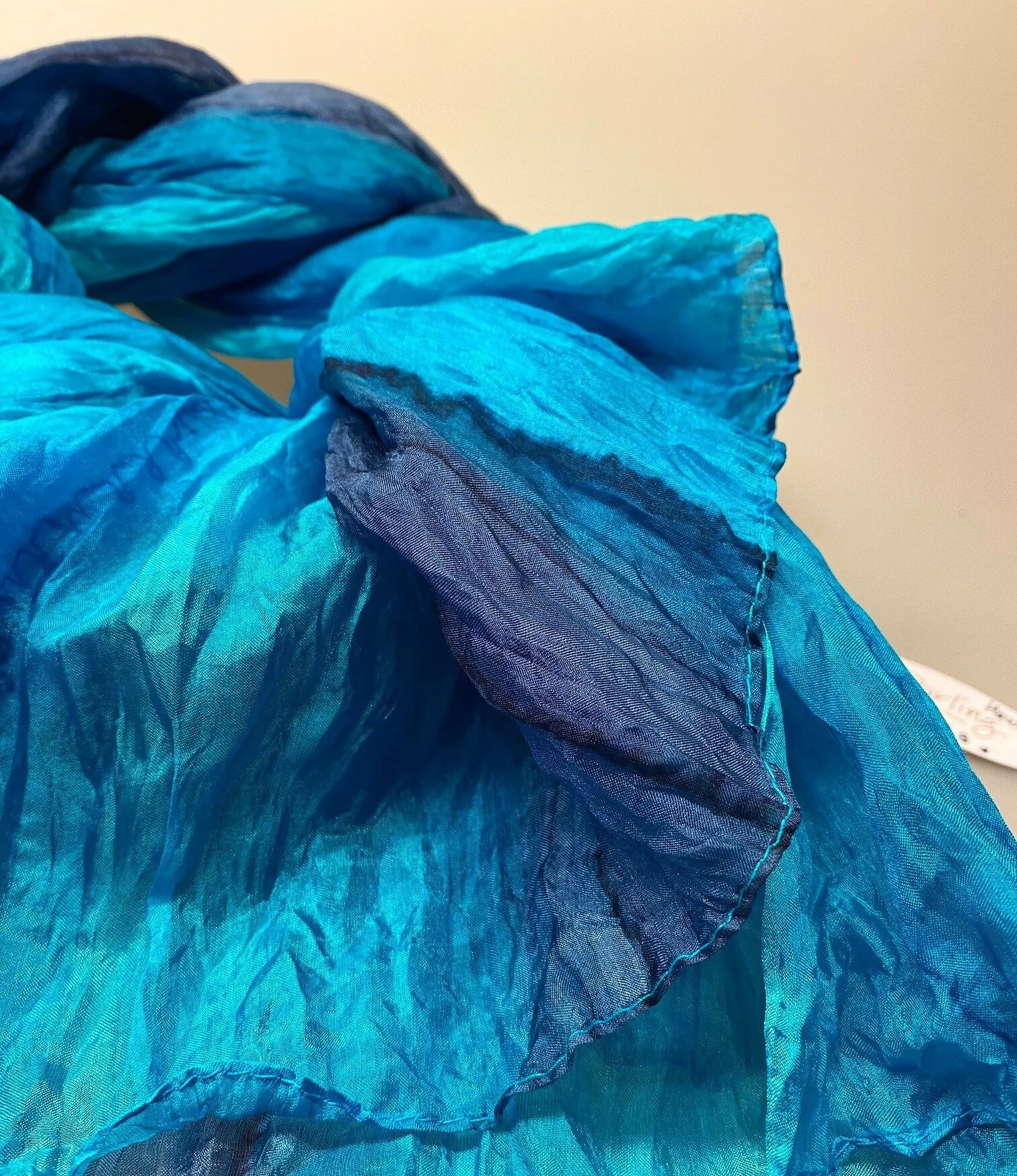 Lækkert twistet silketørklæde i blå og turkise nuancer.