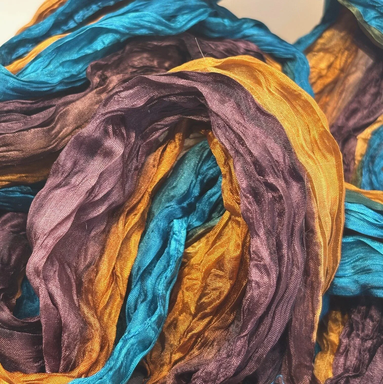 Lækkert silketørklæde i fineste pongee silke med håndstukne kanter. Silken er glatvævet, sprød og let blank. Det elegante materiale får et sporty twist i kraft af den snoede effekt. Silken er koloreret i nuancer, der toner smukt over i hinanden.