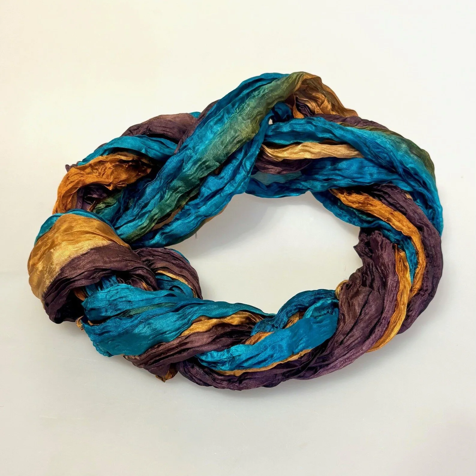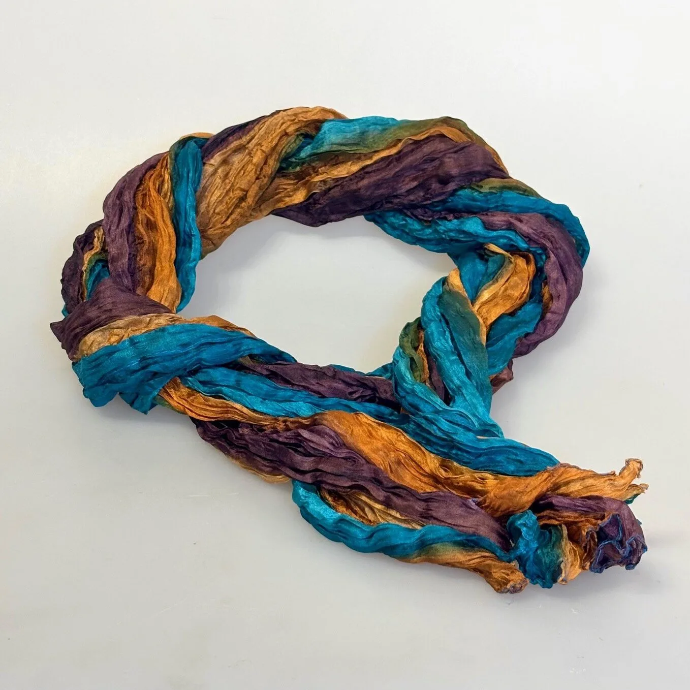 Lækkert lille twistet silketørklæde i petrol og brune nuancer.