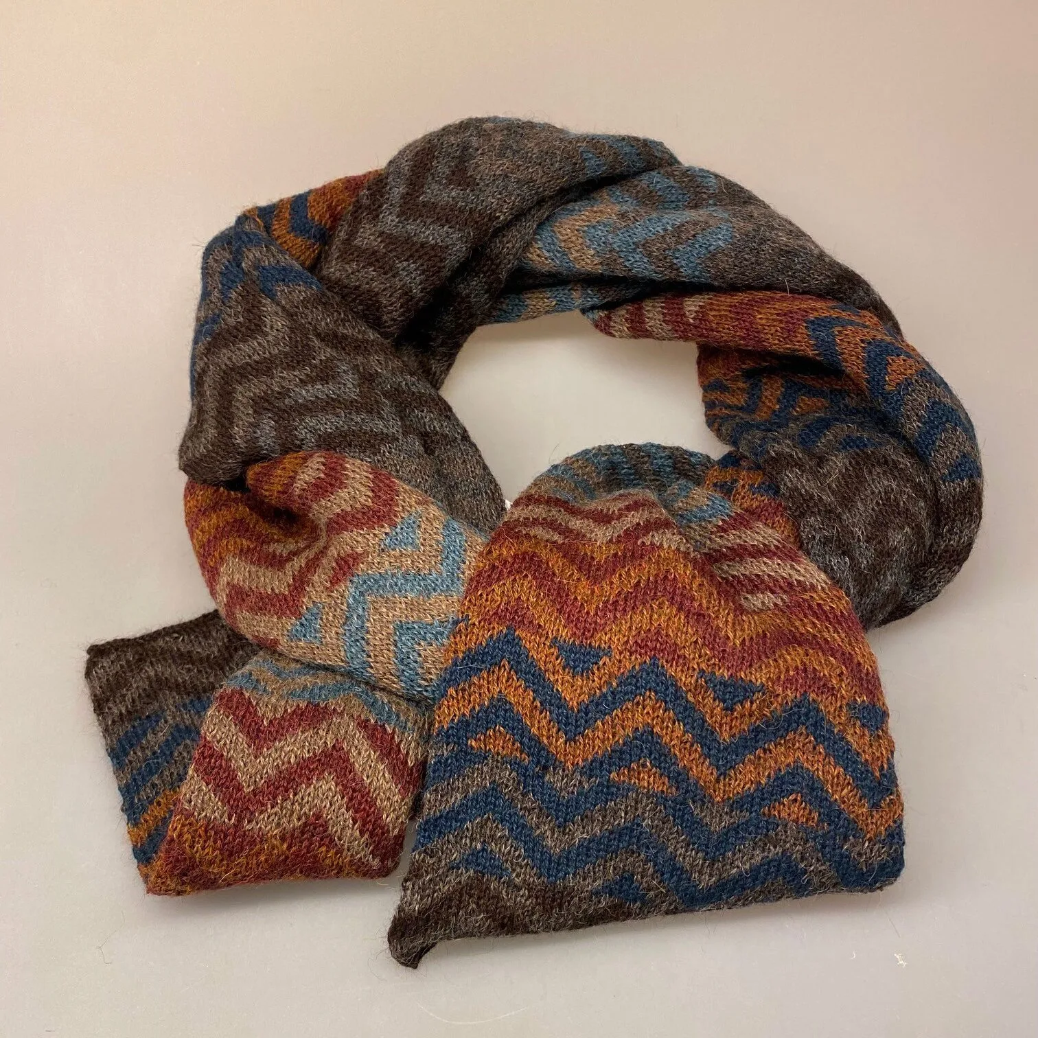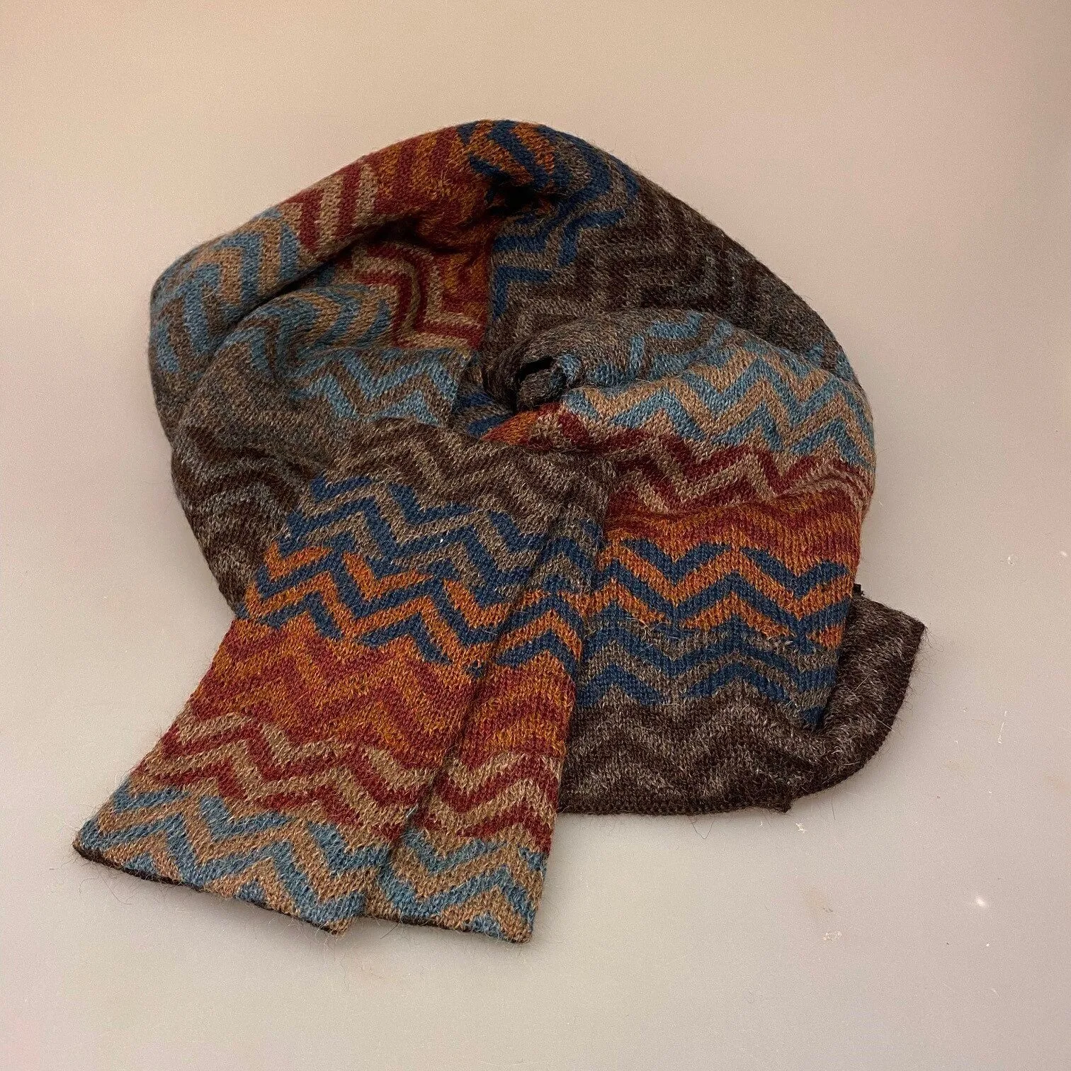 Dette flotte tørklæde er let og lunt og strikket af alpaka-garn i den bedste kvalitet. Tørklædet er gennemført lavet, fint forarbejdet og som en ekstra luksus er det strikket dobbelt. Mønsteret her er strikket i et moderne grafisk zigzag mønster, der består af 5 to farvede felter, der tilsammen giver det flotteste farveforløb.