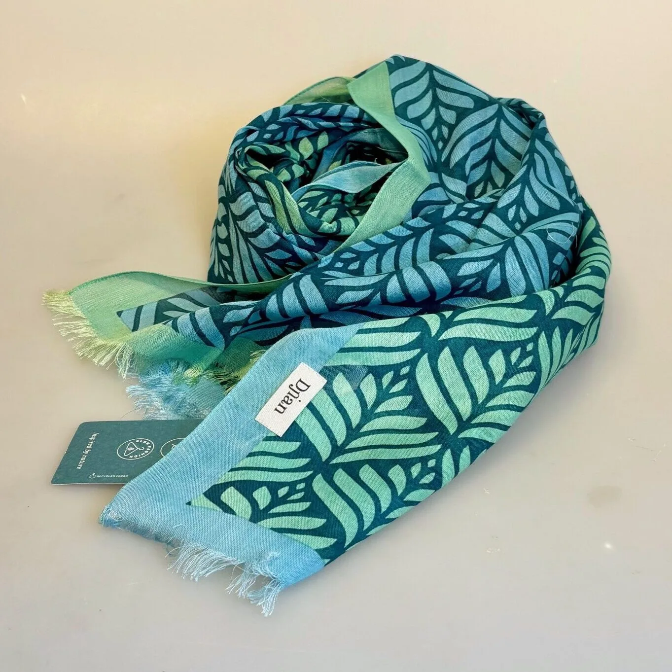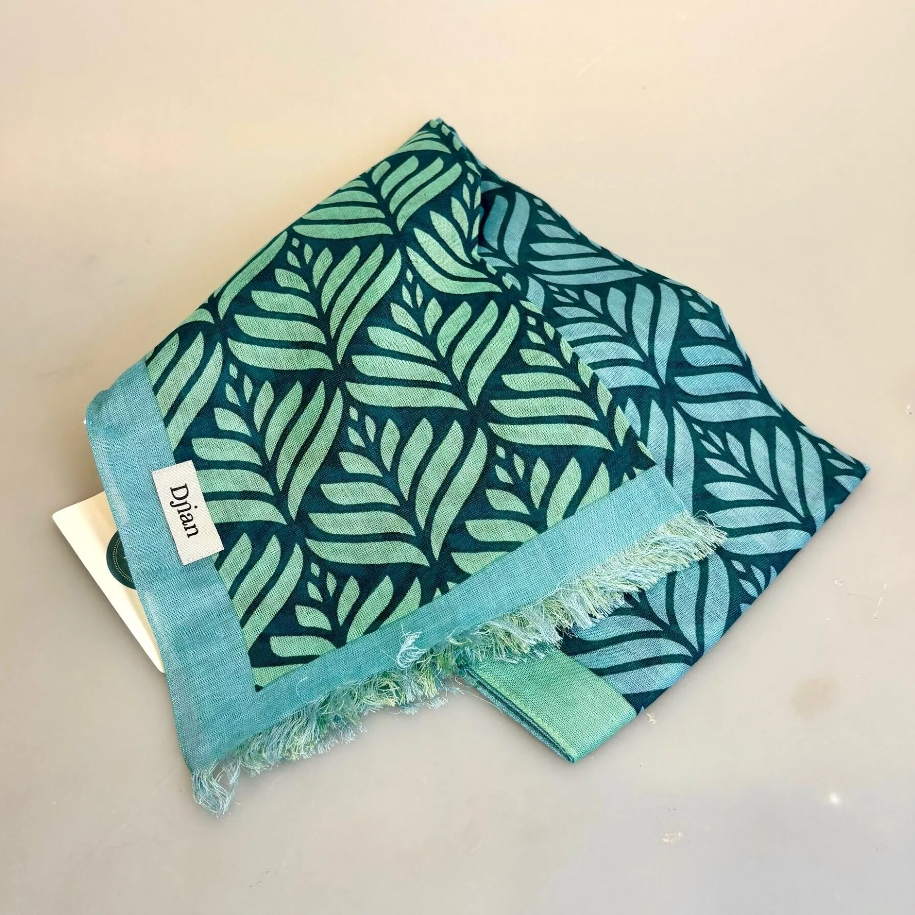 Skønt stort tørklæde i blød øko bomuld. Tørklædet er trykt med de smukkeste lyse grønne og blå farver. Tørklædets mønster er et grafisk mønster af blade eller stiliserede lotusblomster. Bundfarven er petrolgrøn og det trykte motiv er i felter, der fremtræder som farveforløb, hhv. lyseblå og lysegrønne. Det aflange tørklæde er elegant indrammet af en matchende bort hele vejen rundt i mønsterets to farver. Enderne har en lille fin frynsekant som afslutning.