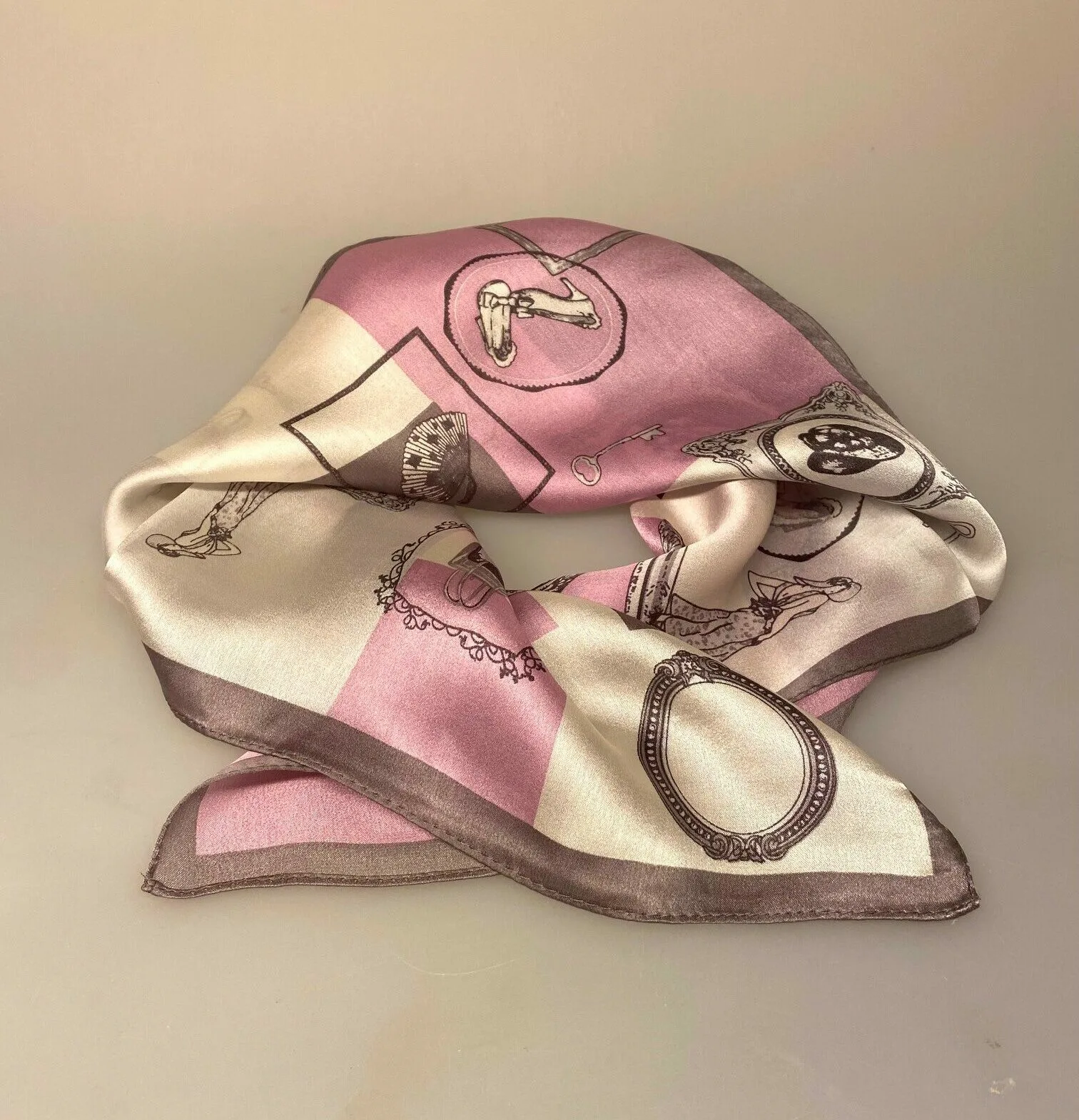 Tørklædet her er lavet af fed luksuriøs silkesatin og har fin rullet kant og stukne kanter. Den lækre silke har det fineste motiv af accessories indrammet i fine felter og rammer. I smukke ornamenterede sølvgrå rammer er nøgler, hatte, sko og vifter m.m. Bunden består af et grafisk mønster, i form af felter i rosa, varm grå og cremehvid. Diskrete og delikate farver, der ikke larmer og passer til det meste.