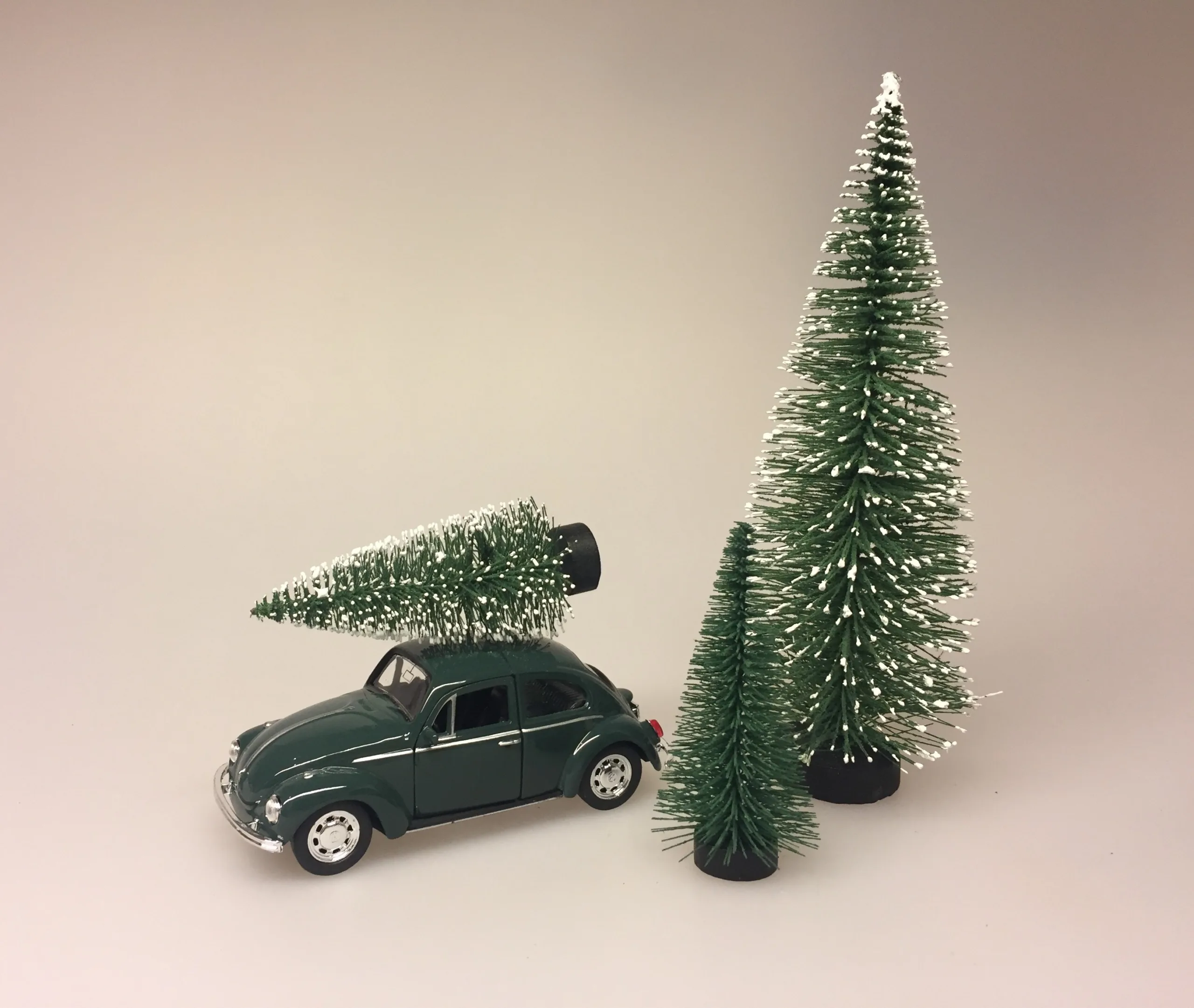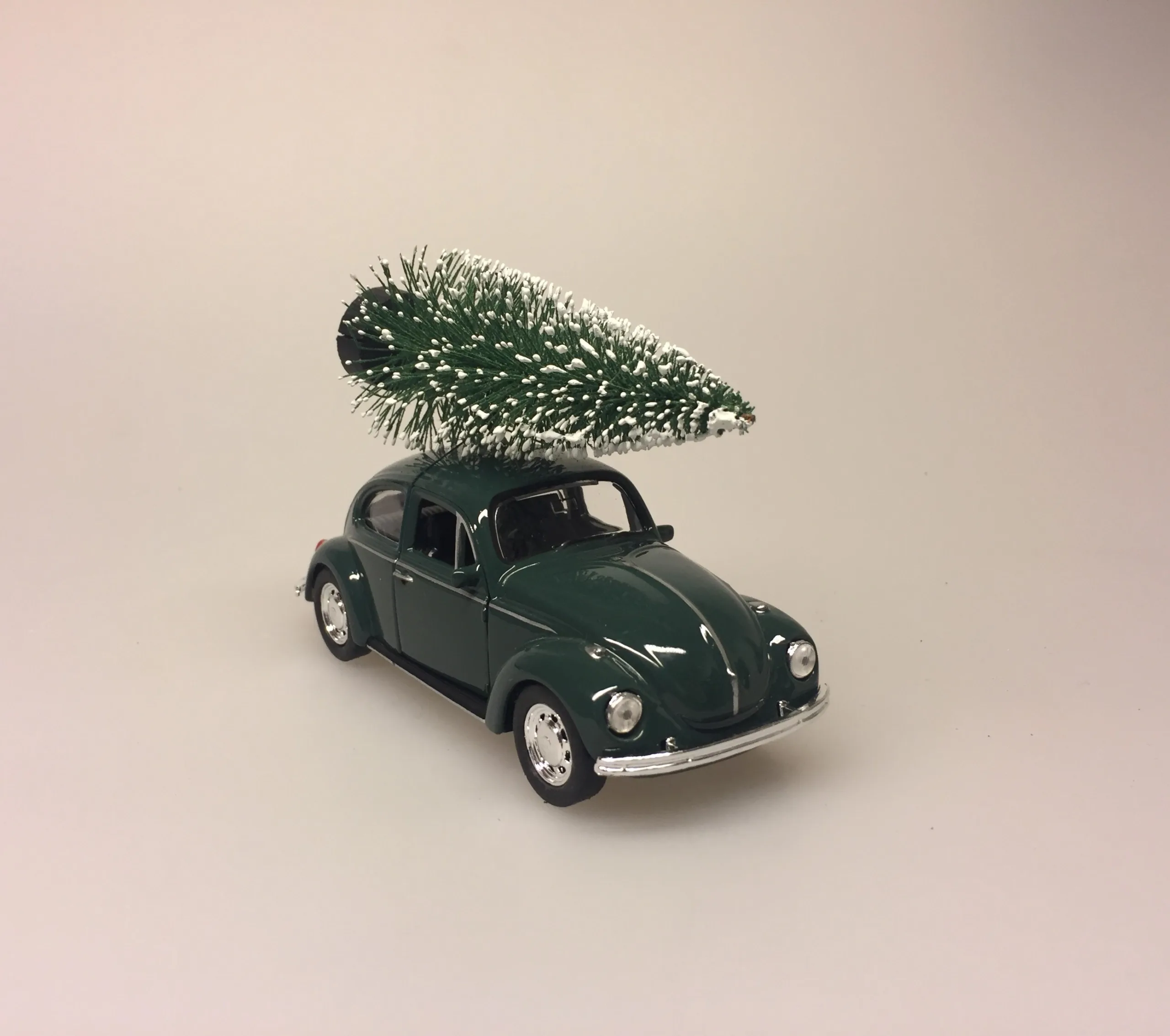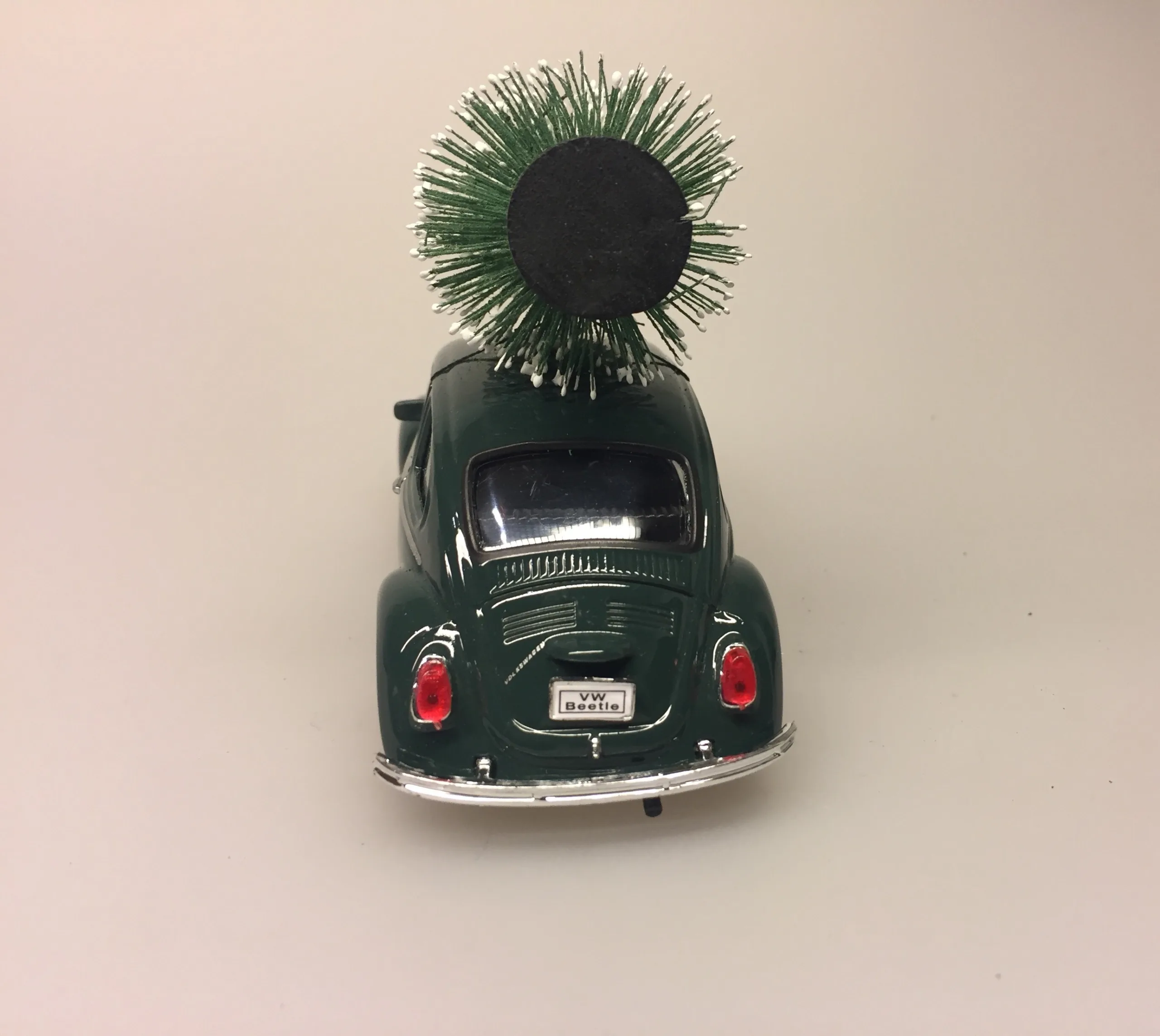 Folkevogn VW i lakeret metal. Aftageligt juletræ på taget.