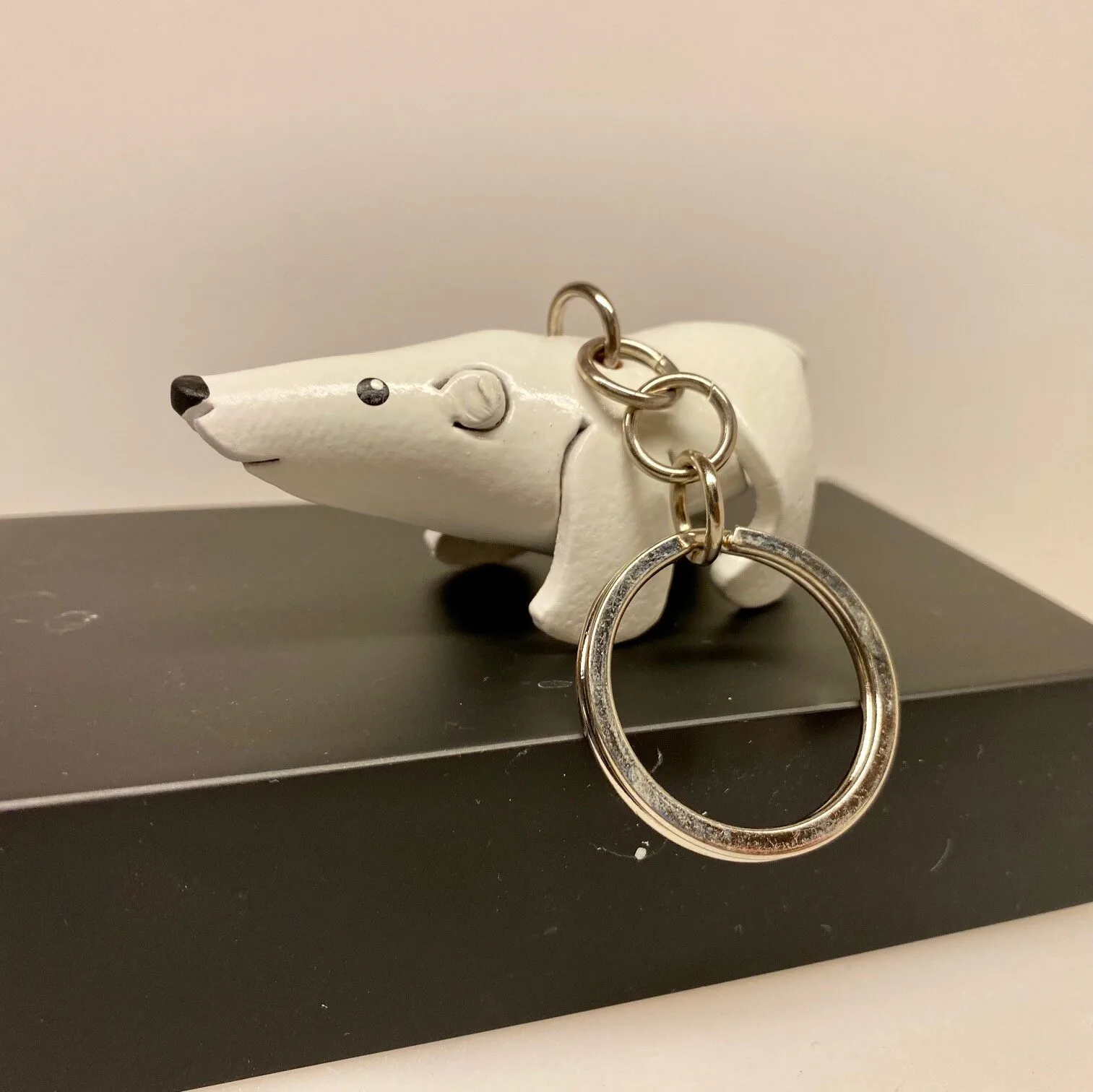 Nøglering med sød isbjørn, formet ud af kernelæder i et stykke.