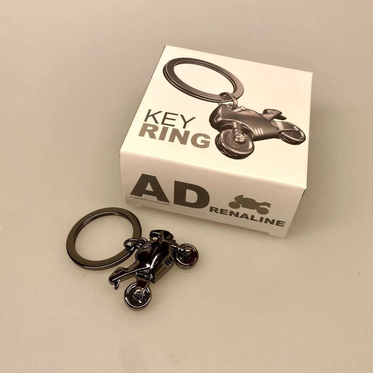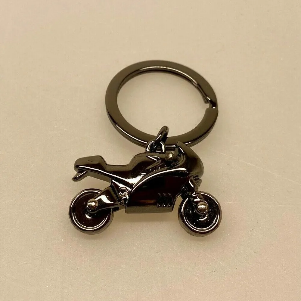Nøglering i flot design og lækkert udført. På en klassisk spaltring til nøgler, i blank mørk-eloxeret metal, er monteret en lille kraftig motorcykel. Motorcyklen fremstår tredimensionel med fine detaljer, trods det stramme stilige design. Hjulene er f.eks. bevægelige og kan dreje rundt.