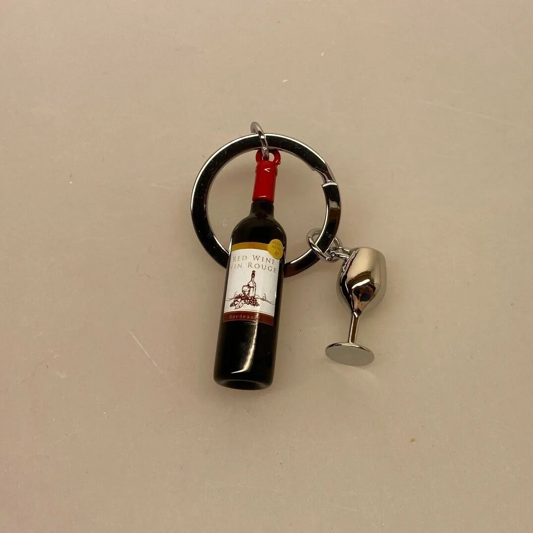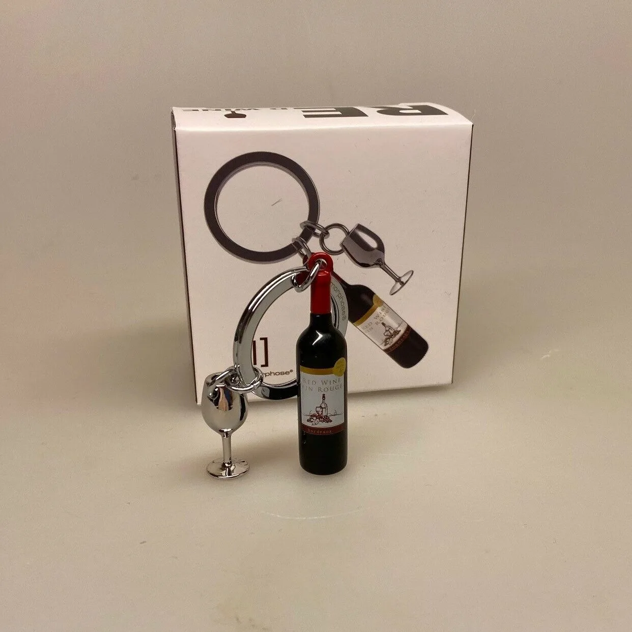 Flot nøglering med rødvinsflaske og -glas. Lækker kvalitet.