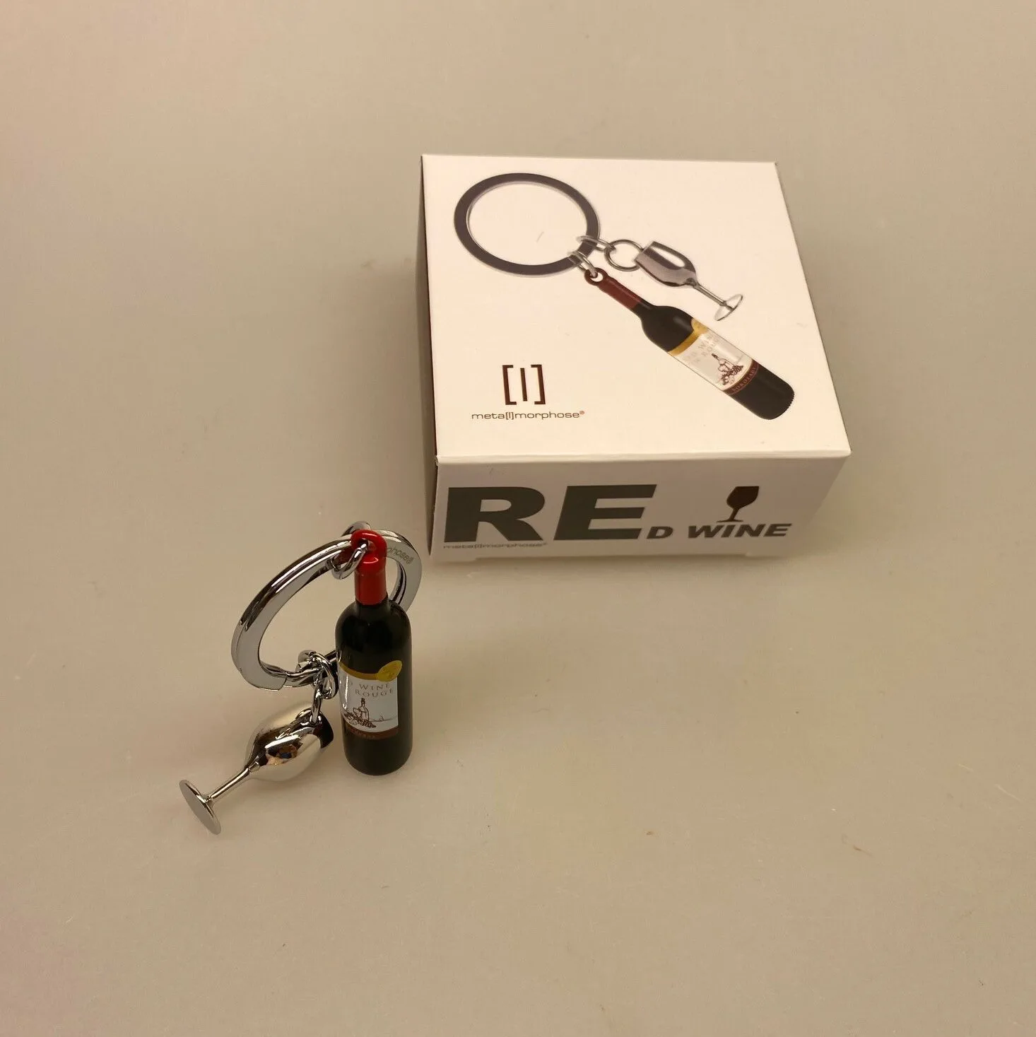 Lækker nøglering med fint og humoristisk vedhæng. Nøgleringen har en kraftig klassisk spaltring i blank sølvfarvet metal til nøglerne. På ringen er monteret to ringe med vedhæng. I det ene hænger en fin lille vinflaske – rødvin med rød banderole og hvid etiket med trykt motiv og Red Wine – Vin Rouge. Det andet vedhæng er et sølvfarvet rødvinsglas med stilk.