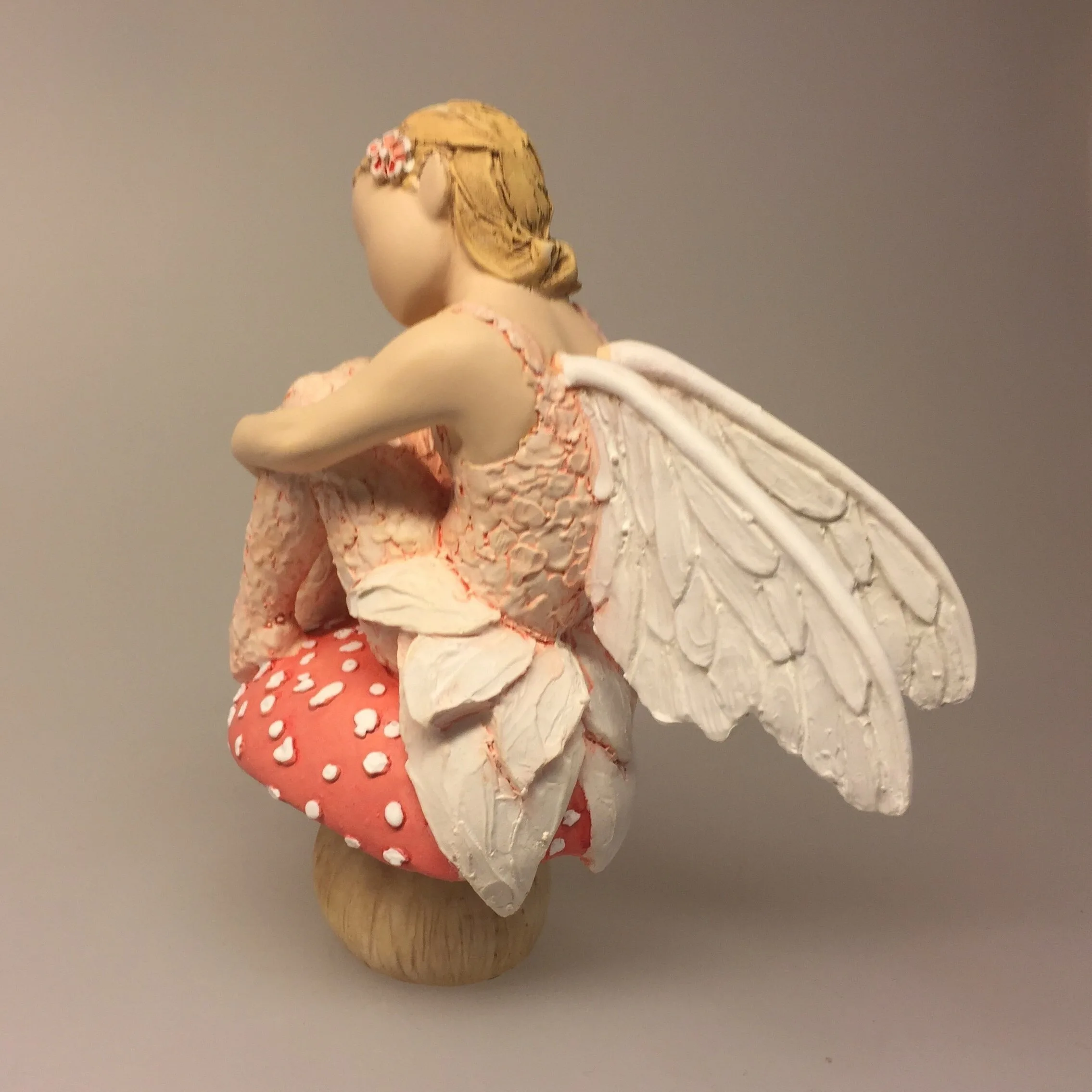 Yndig lille figur, der forestiller en Fe med lette alfevinger, der sidder på en fluesvamp.