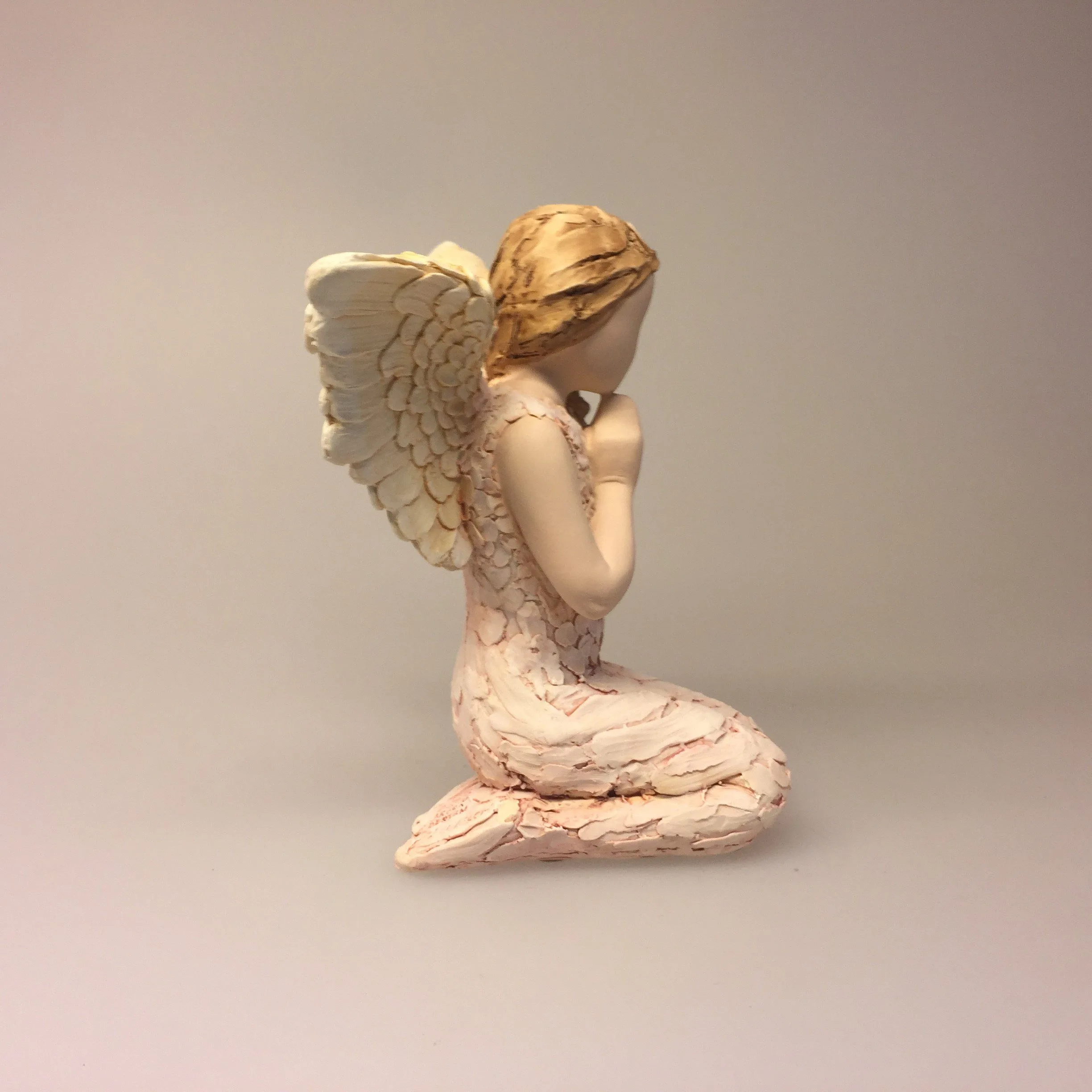 Englen er klædt i en svagt rosa kjole og har store smukke detaljerede englevinger i hvide og gyldne farver. Hun sidder med benene trukket ind under sig og foldede hænder foran sig.