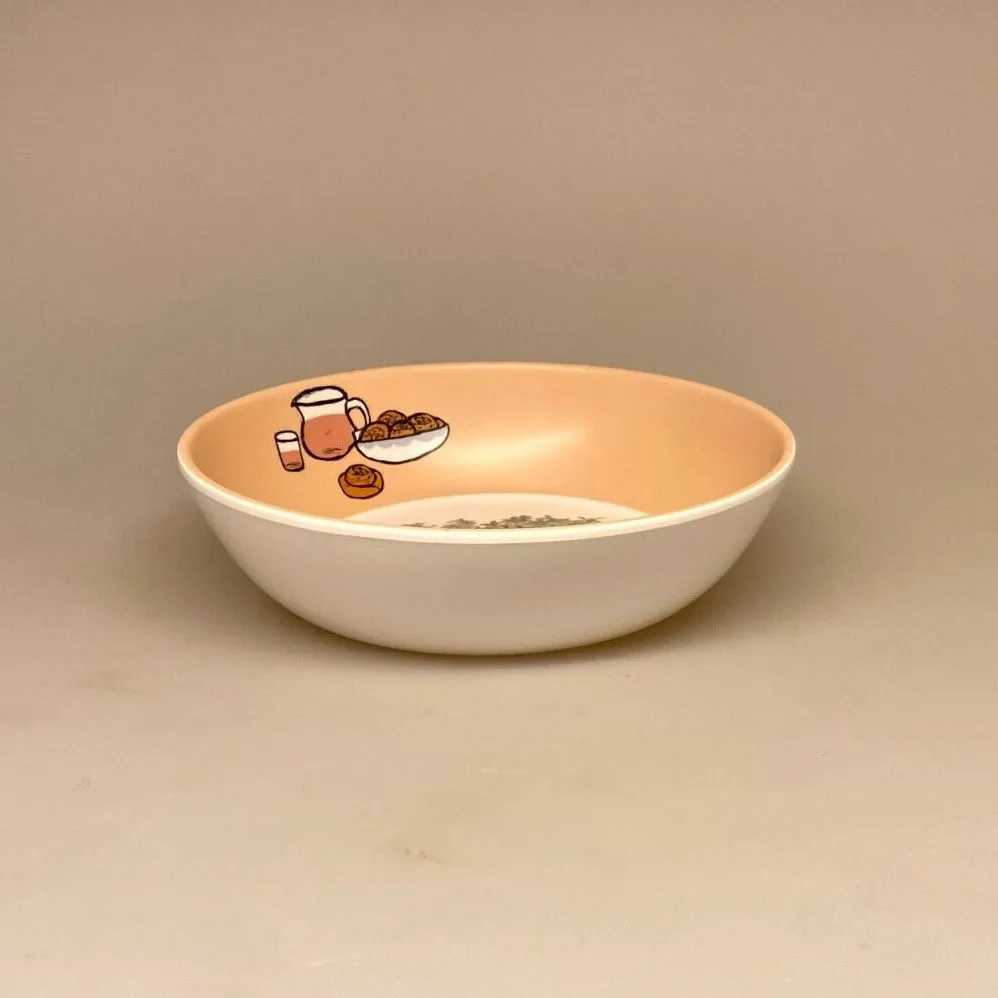 Skålen her er udført af praktisk melamin og er dekoreret med et kært motiver tegnet af den fantastiske Ilon Wikland. Den dybe tallerken er hvid med beige kant og motivet er fire af byens unger, der leger udenfor med saft og boller. Skålen kan bruges til at spise af eller til servering. Motivet passer både til drenge, piger og til voksne, der holder af Astrid Lindgrens skønne historier.