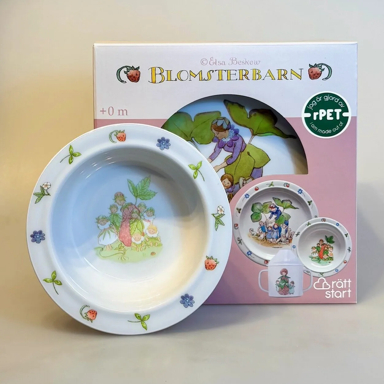Den flade og dybe tallerken og kruset kan købes som enkelt dele. De fås også samlet som sæt med tre dele, smukt pakket i en præsentabel gaveæske af karton, dekoreret med motiver fra Elsa Beskows eventyr.