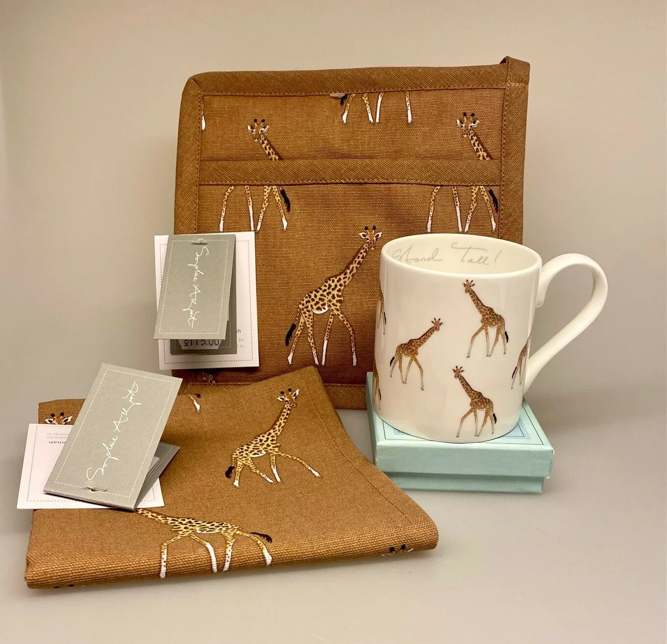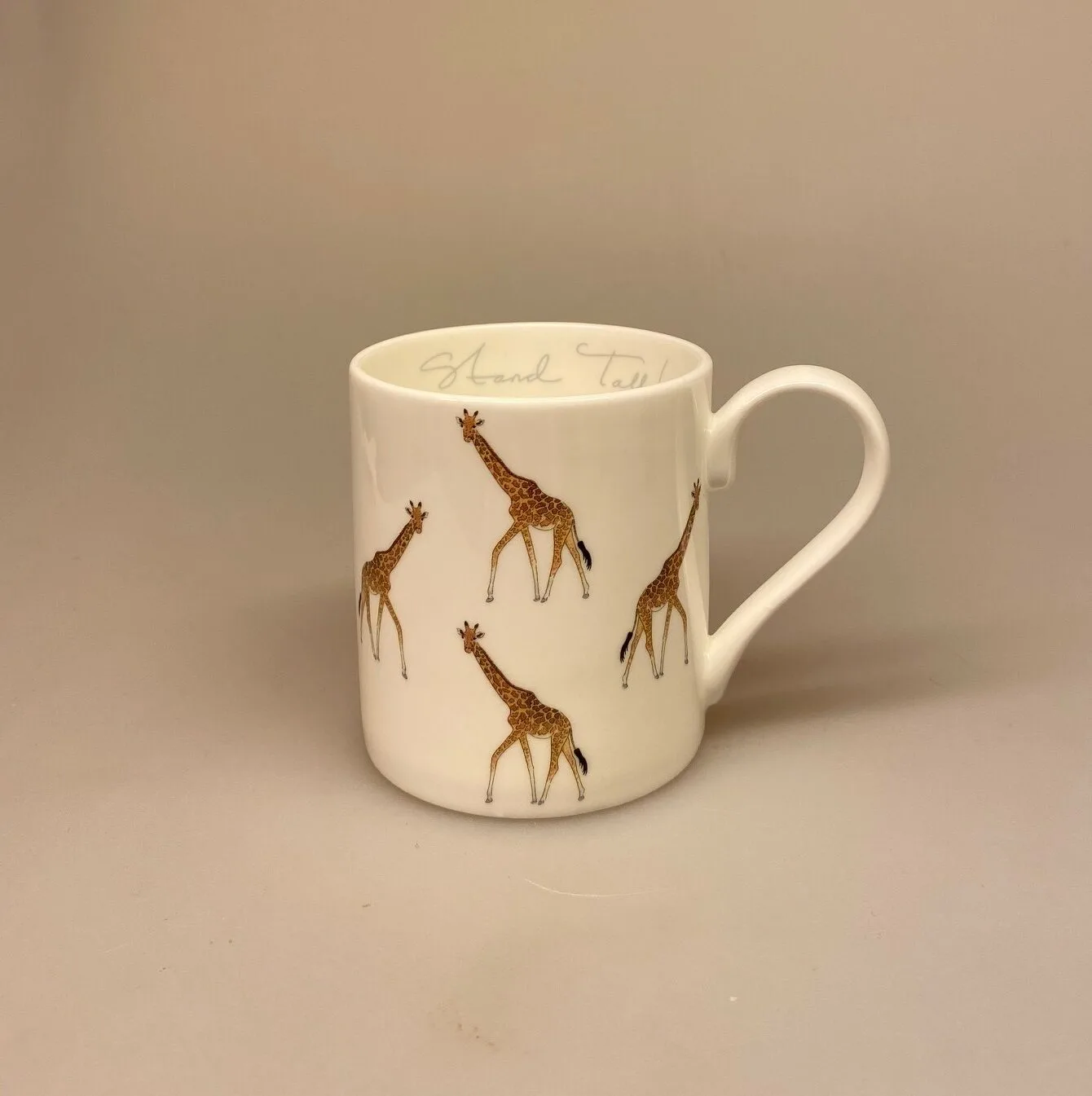 Koppen har titlen “Stand Tall” – ret ryggen og gør dig høj og stolt, som en giraf. På kruset vandrer små elegante giraffer med gyldent plettet skind.