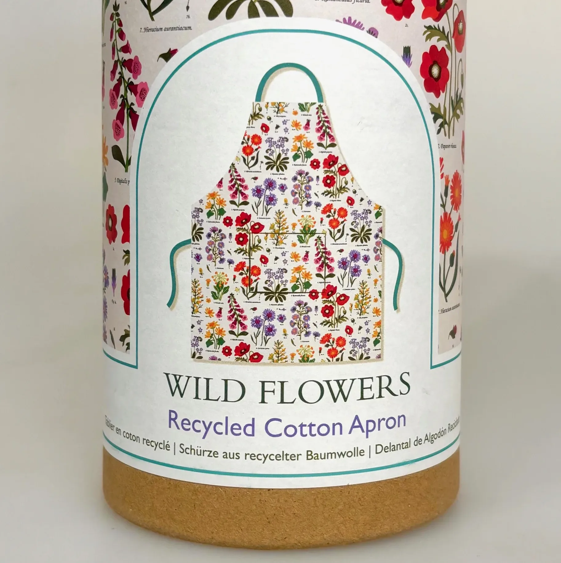 Skønt forklæde i ren bomuld med det fineste klare tryk af vilde blomster. Bundfarven er naturhvid og danner en smuk, ren baggrund for det flotte tryk. Motivet er forskellige smukke vilde blomster, som vi kender dem fra naturen. Røde valmuer, orange Morgenfruer, Lilla Digitalis, samt blå asters og Forglemmigej med flere. Yndige vilde blomster fra eng, grøftekant og den vilde have. Nederst står blomsternes navne på latin,