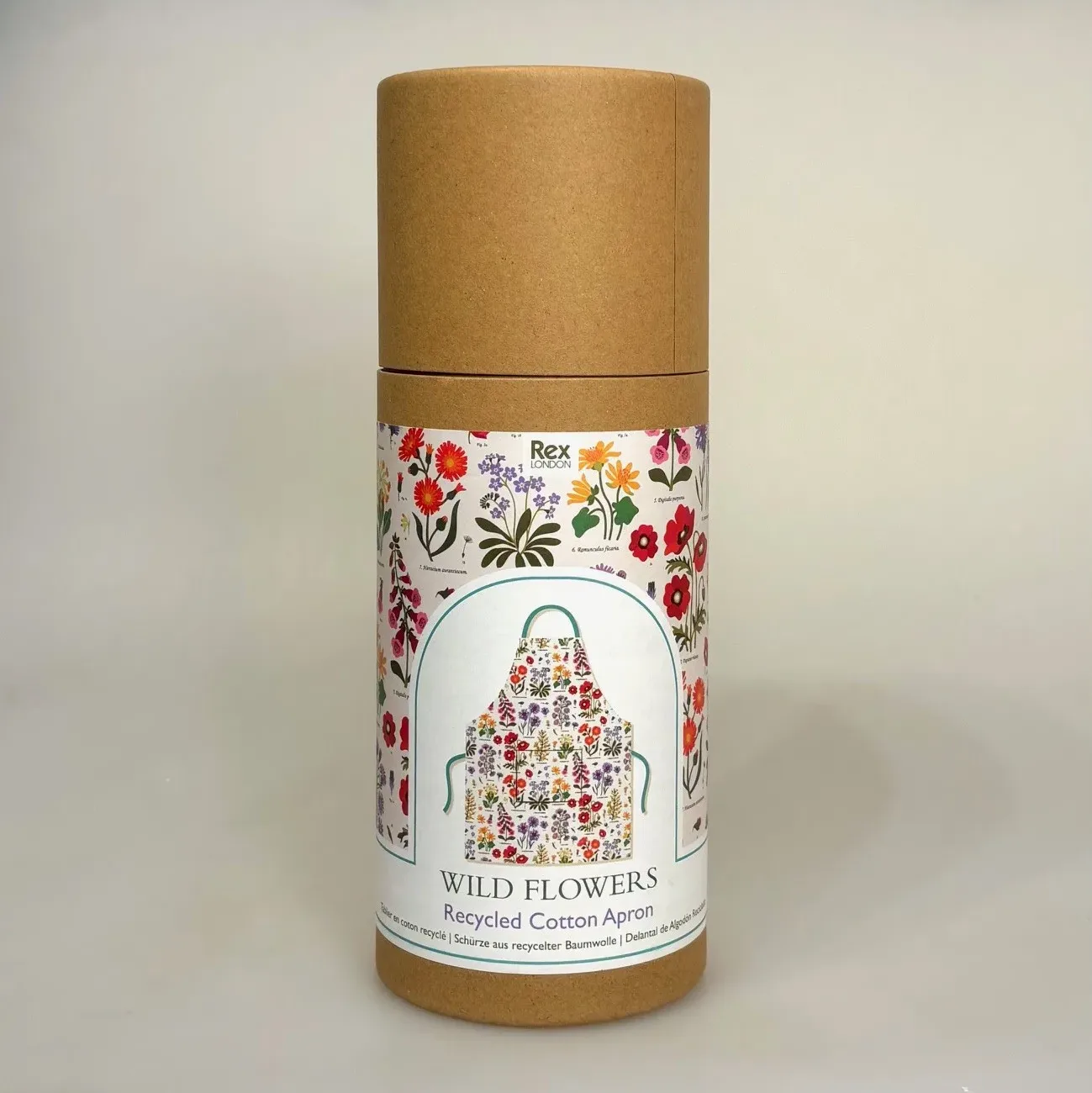 Det flotte forklæde er sjovt og fint emballeret i en cylinderformet æske.