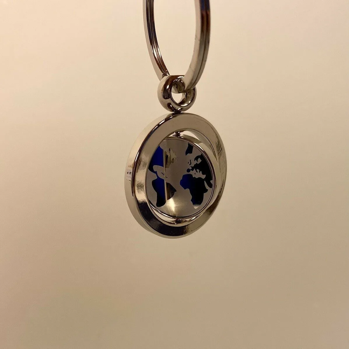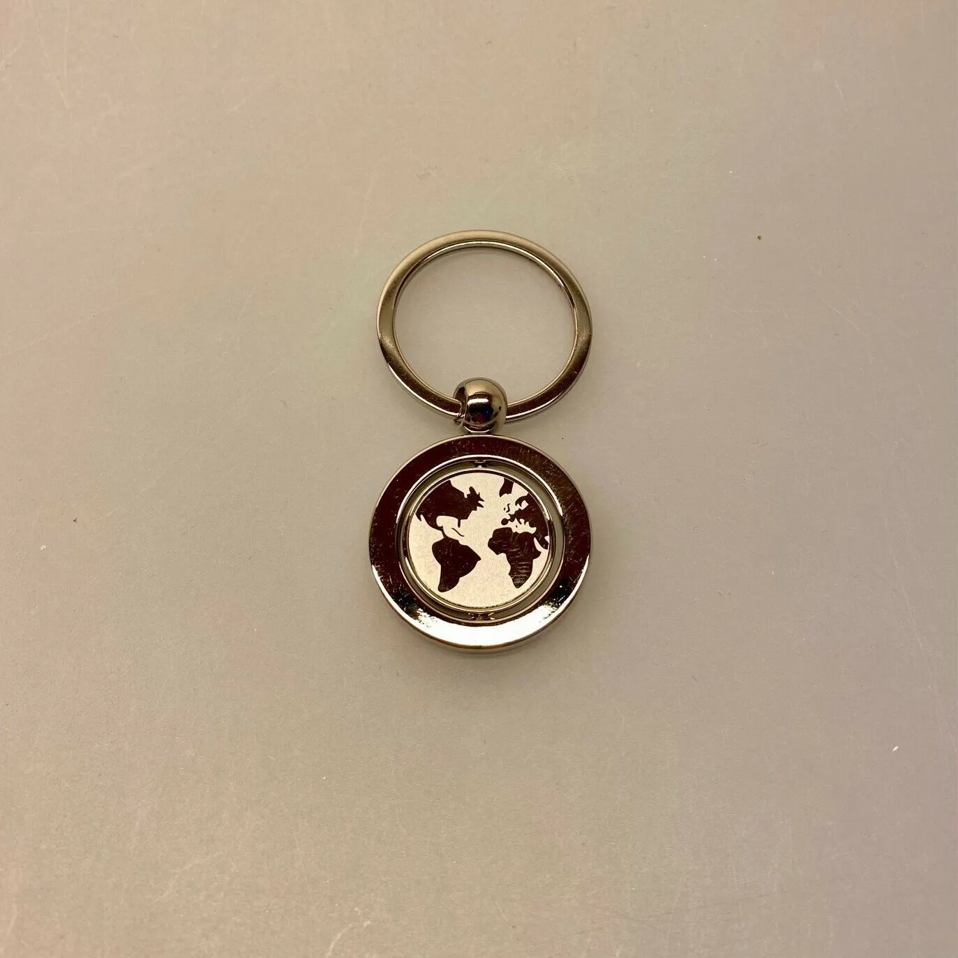 Den elegante nøglering har en klassisk kraftig spaltring med blank sølvfarvet finish. På denne er monteret et vedhæng – en rund blank skive, der omslutter en mindre flad skive. Denne kan rotere og er blank på den ene side, medens den anden viser en flad globus med verden graveret på mat baggrund. Flot og lækkert design med cool udtryk.