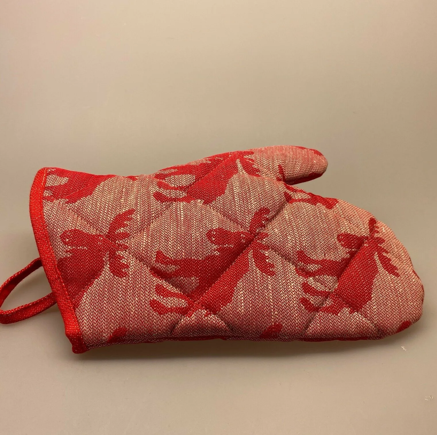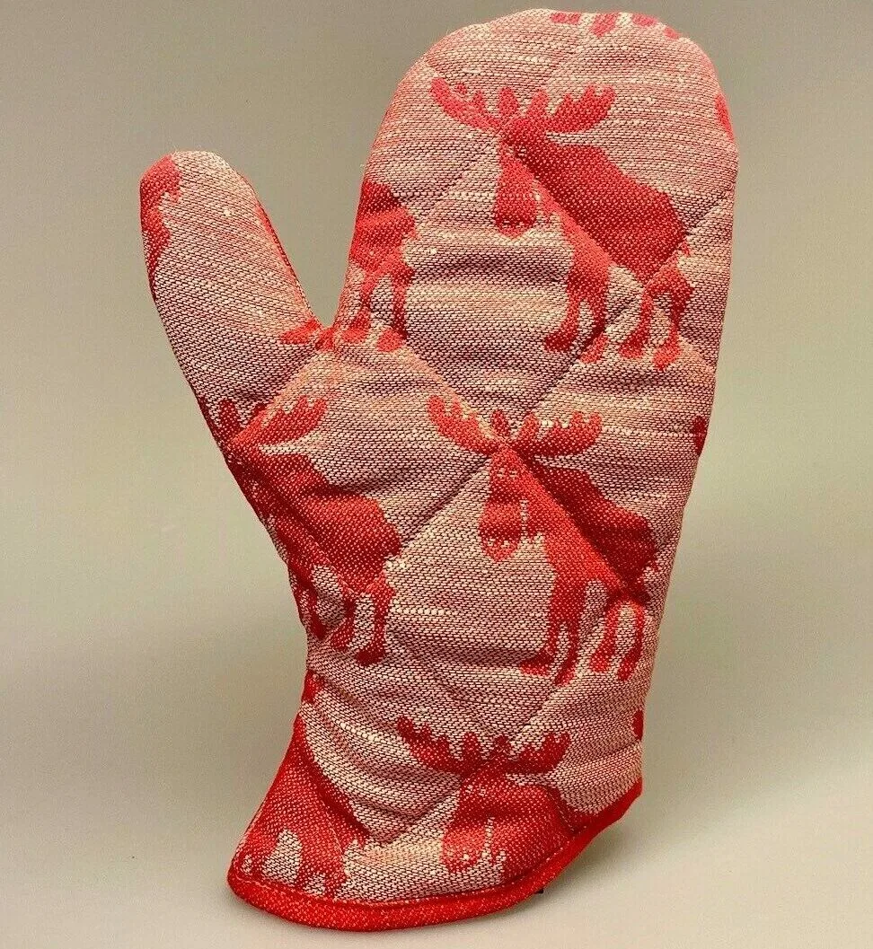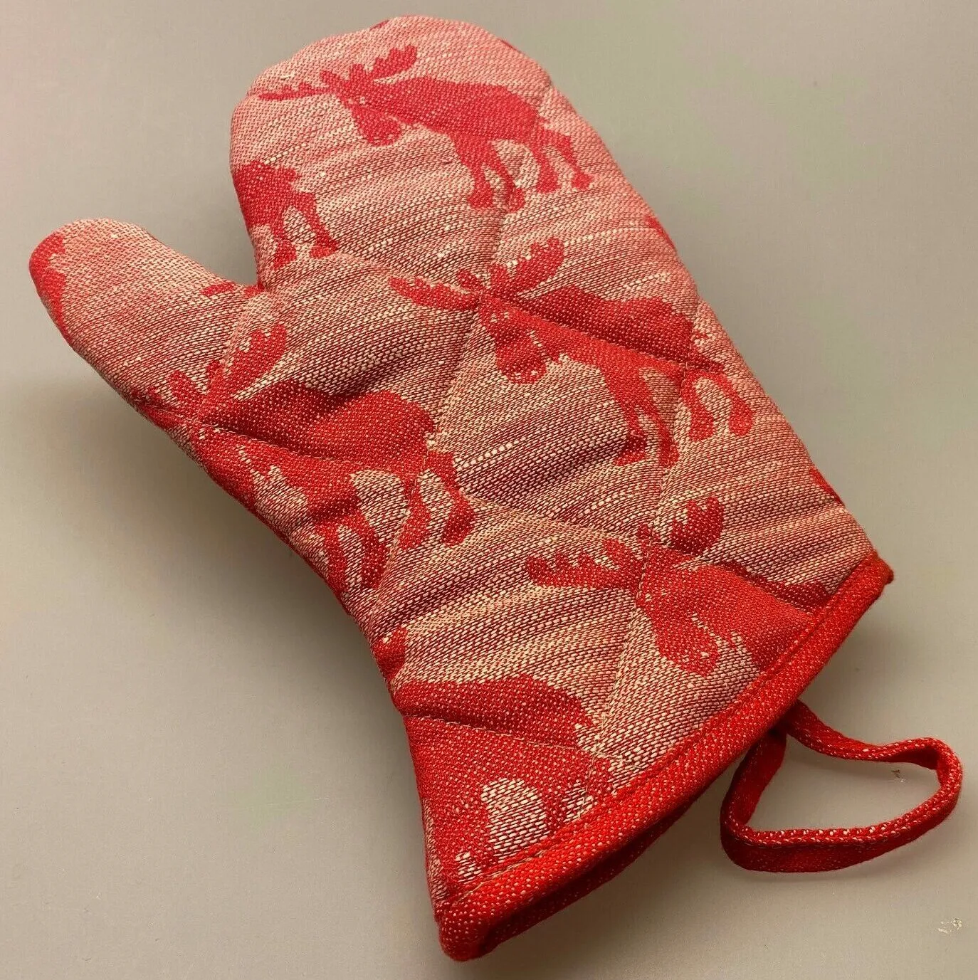 Flot grillhandske i Hør/bomuld med enkelt mønster af elge, vævet i rød og natur.