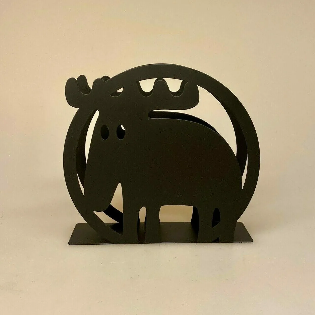 Holderen er konstrueret som to elge i silhuet, omkranset af en bue, så den er ens fra begge sider. Metalholderen er fin til servietter, da den er rummelig og har en god tyngde.