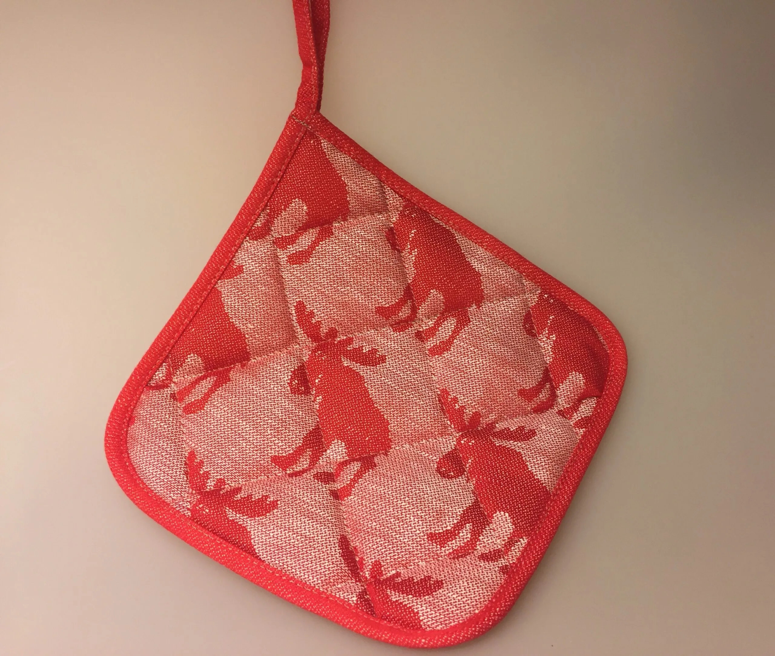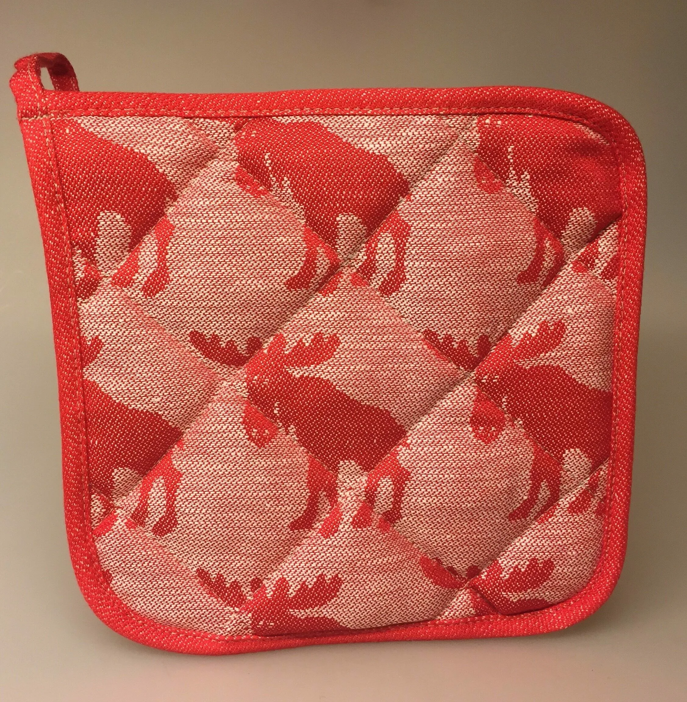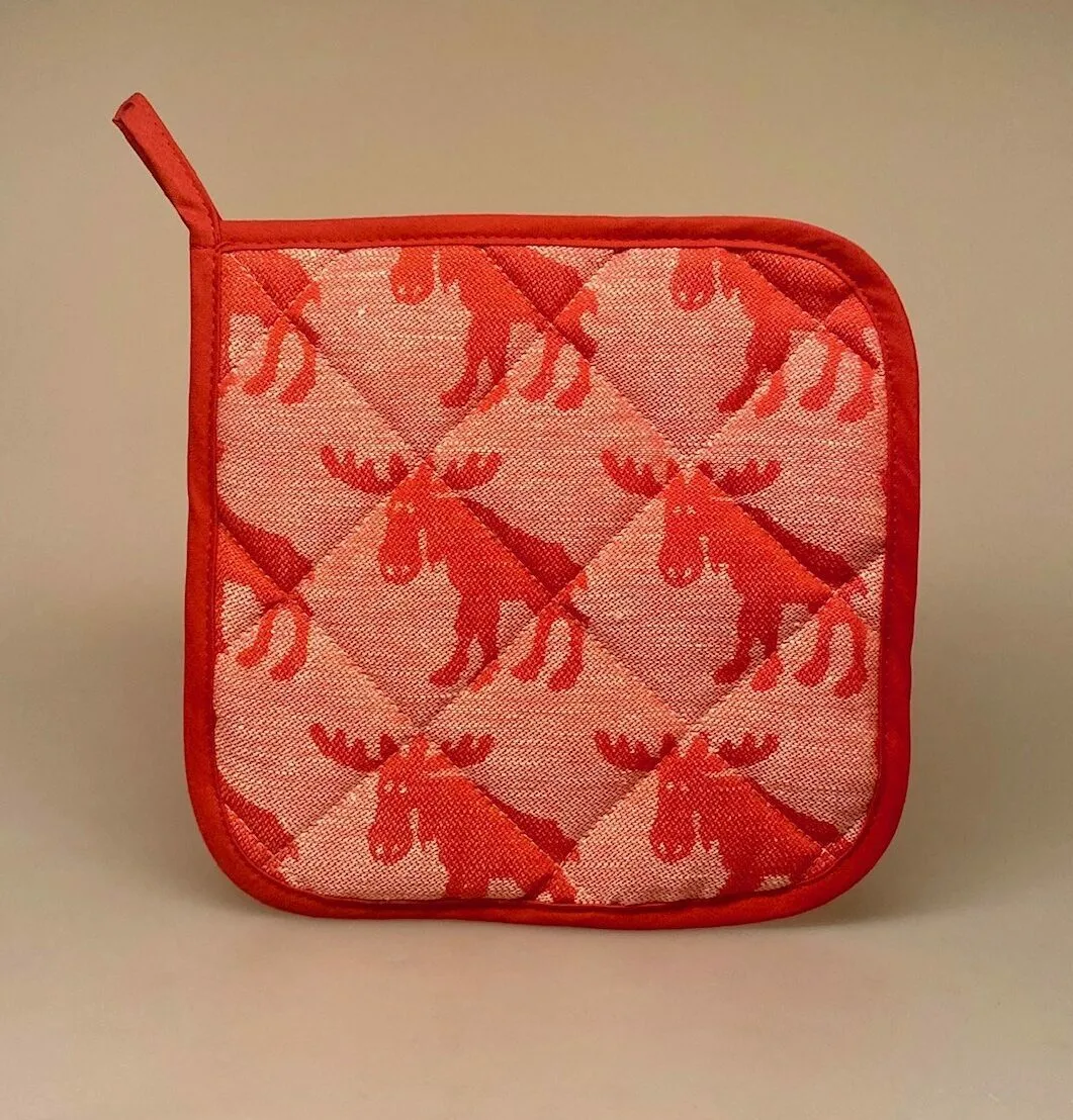 Grydelappen er vævet i en lækker blanding af hør og bomuld. Motivet er mønstervævet og forestiller elge – elsdyr i røde og grå toner.