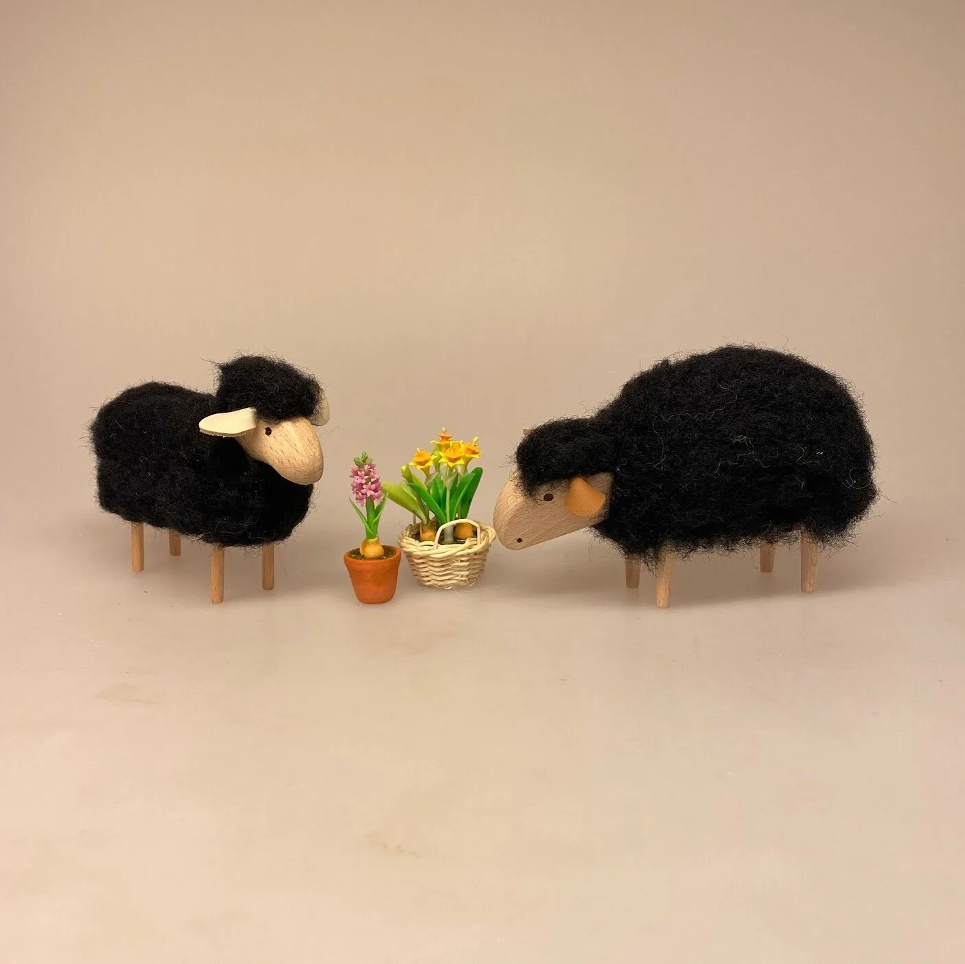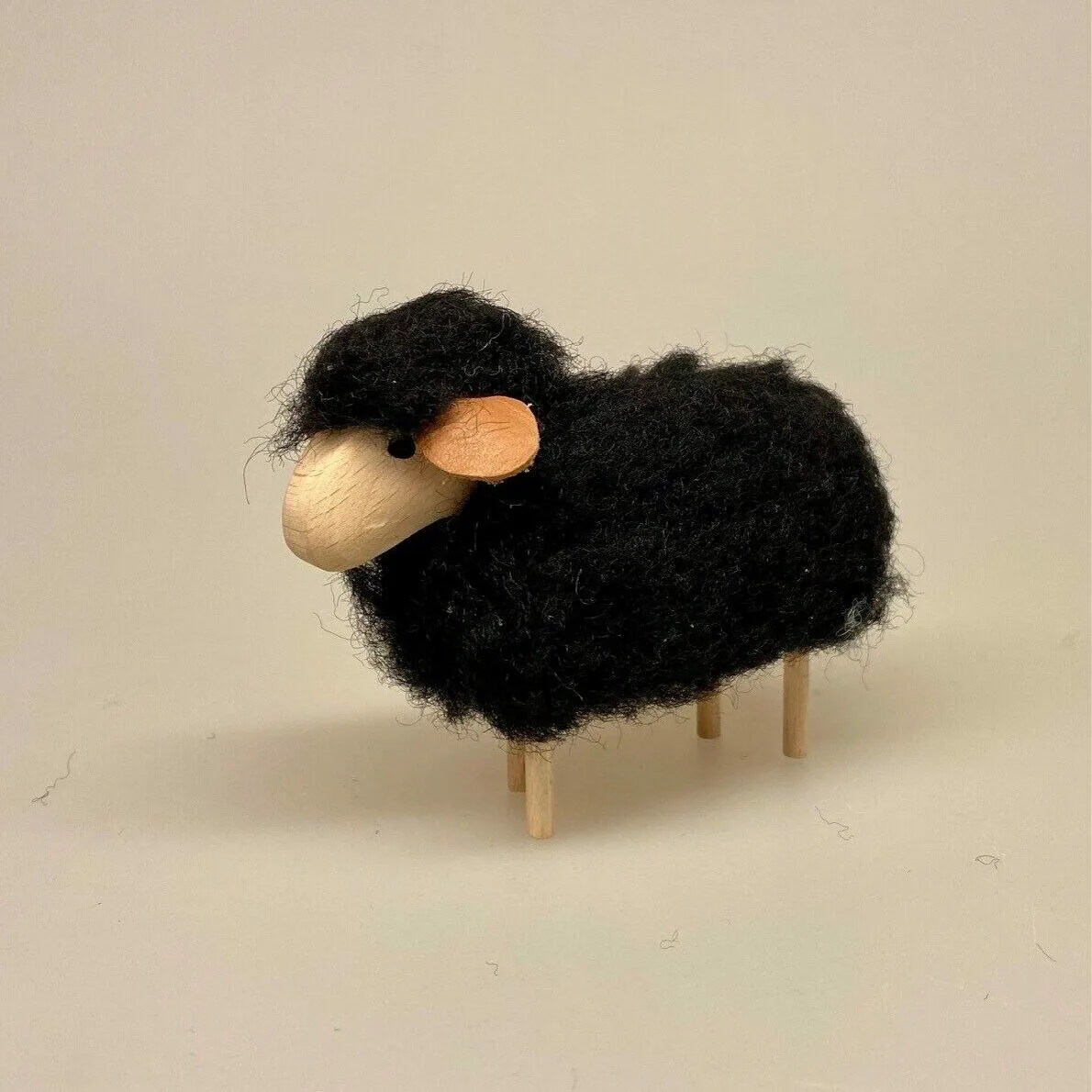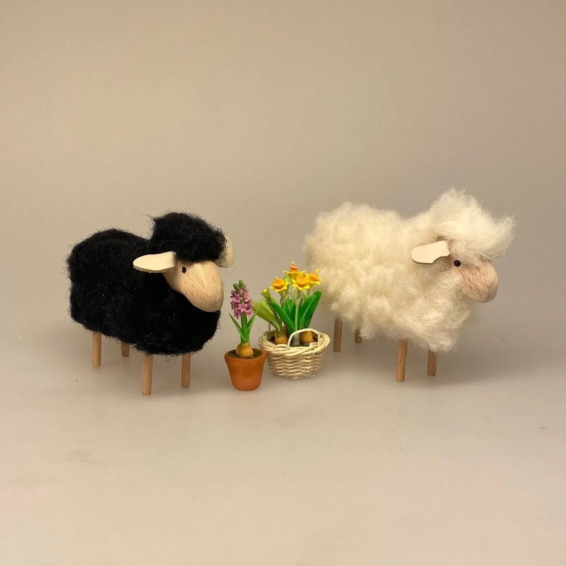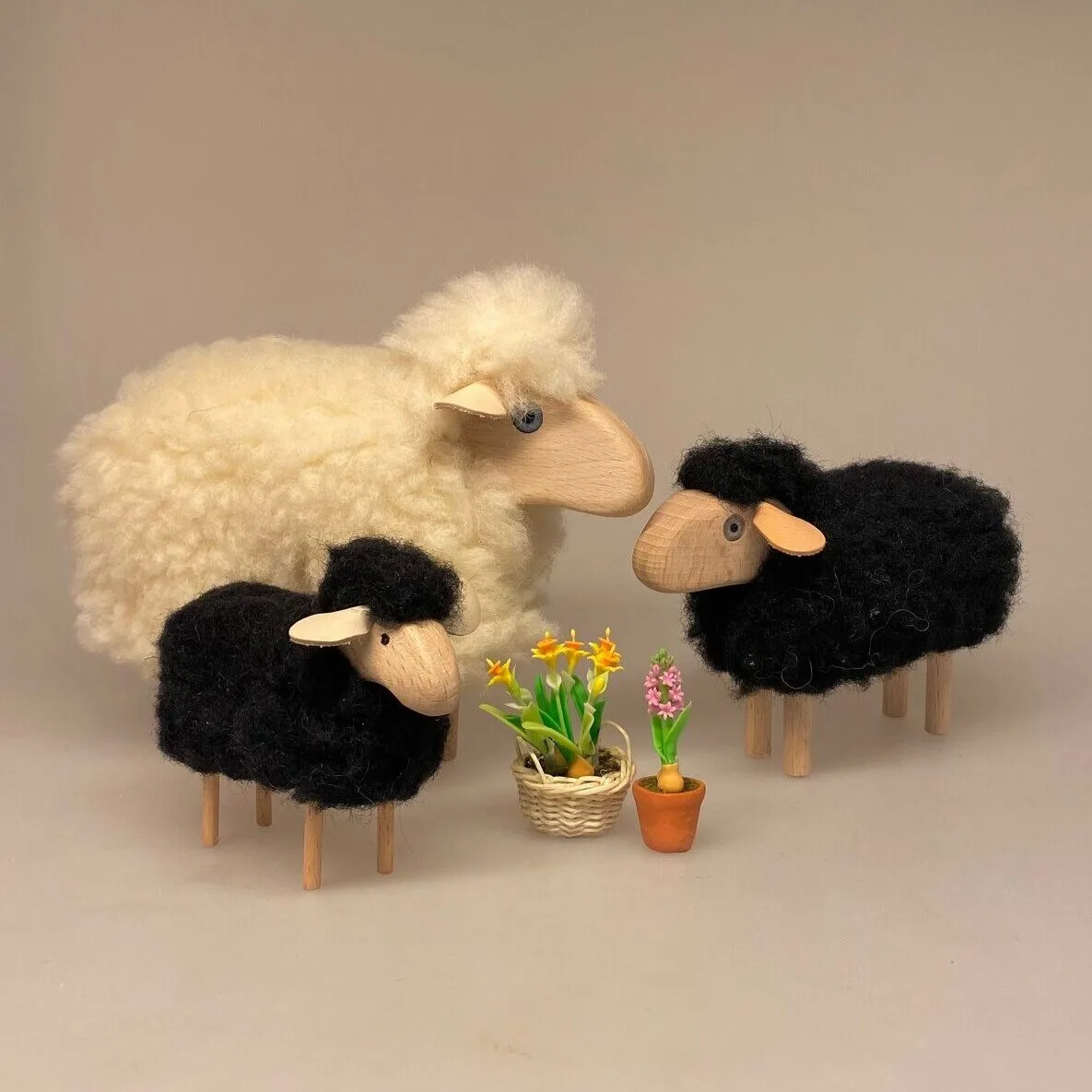 Fårene er omhyggeligt lavet i hånden. Materialerne er fint i tråd med den danske tradition for træfigurer og den rene nordiske stil, med lyse træsorter og naturlig uld i sort og hvid.