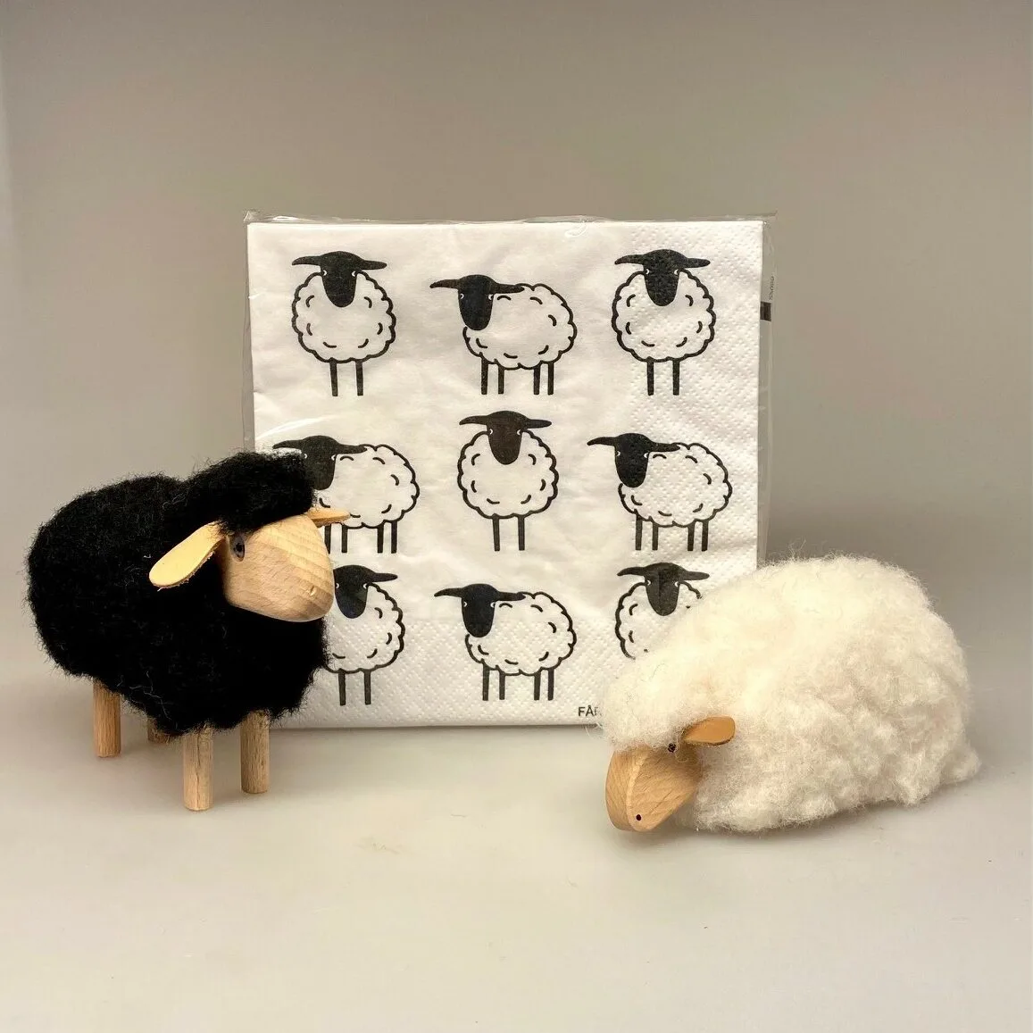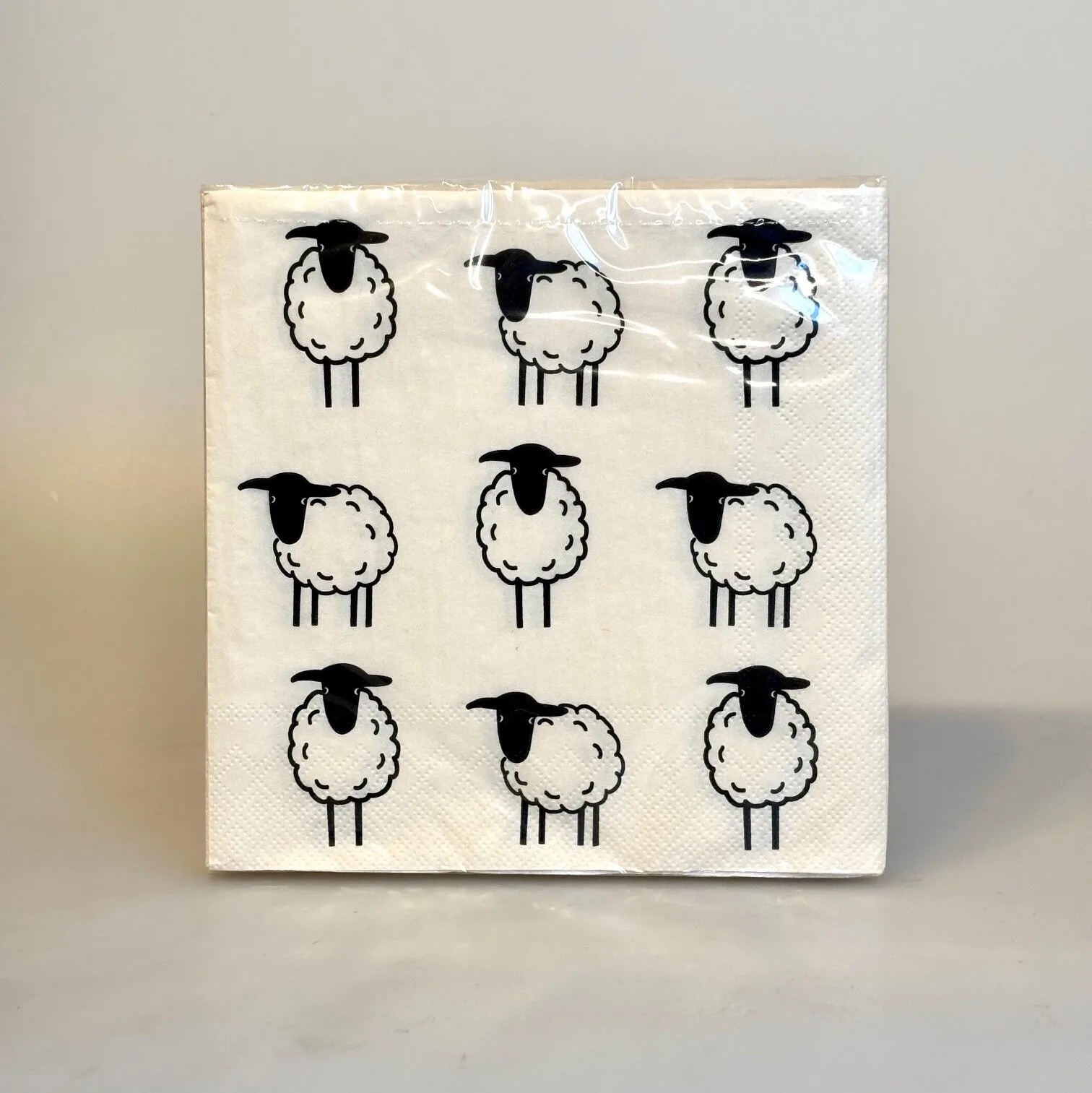 Servietter i pakke med 20 stk papirservietter i god kvalitet. Størrelsen er den klassiske frokoststørrelse, som er den mest brugte, da den passer til det hele. Servietterne er naturhvide og motivet er silhuetter af stiliserede små får. Nogle står med siden til, andre lige frem. Servietter er ofte det ekstra pift, når man dækker bord.