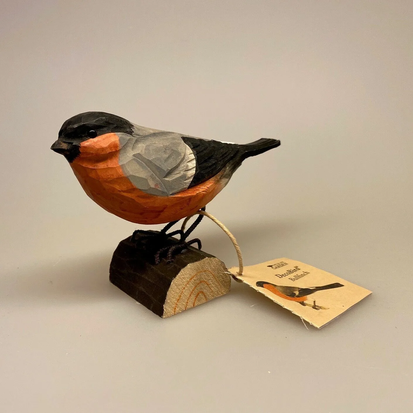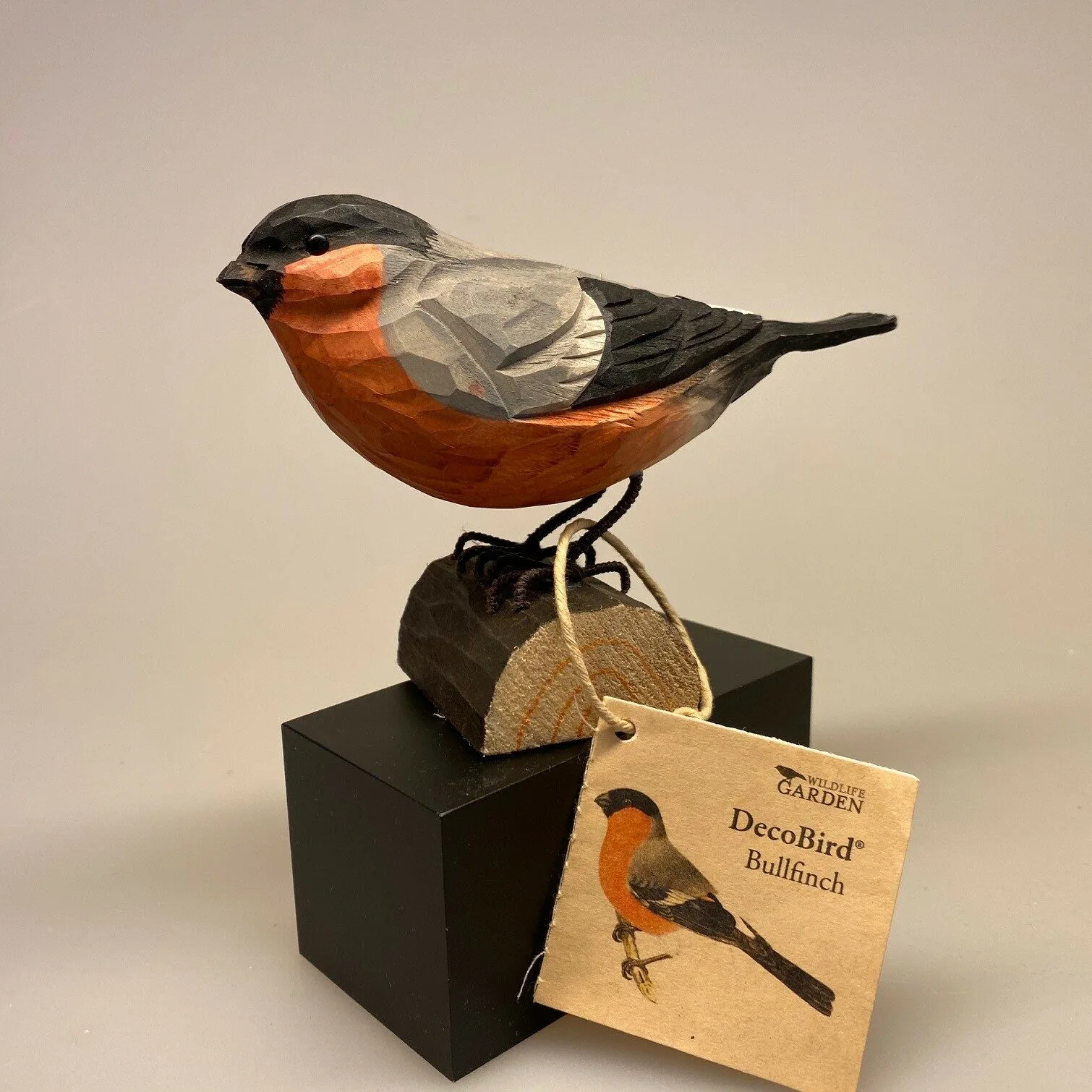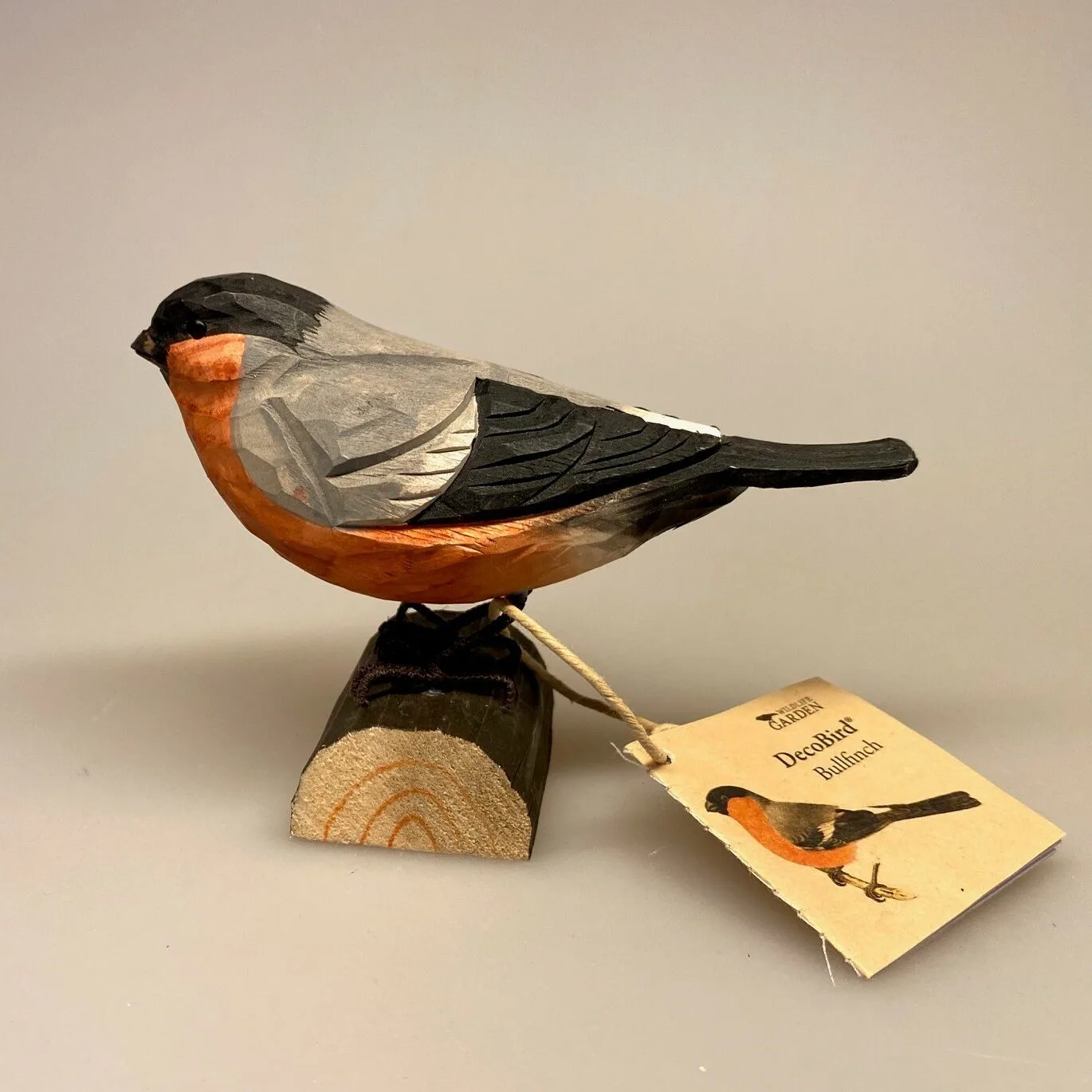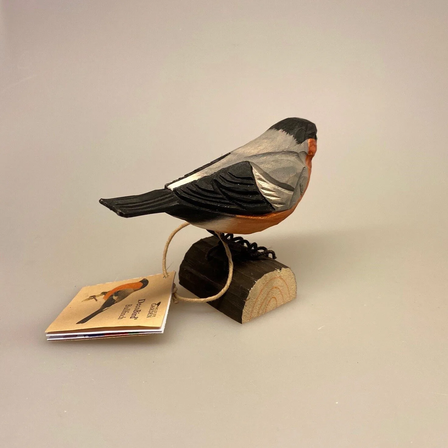 Fine fugle, som vi kender dem fra naturen, håndsnittet af træ og håndmalet i de rette farver og i naturlig størrelse. Her den flotte farvestrålende Dompap med den røde bug, den sorte kalot og den hvide gump.