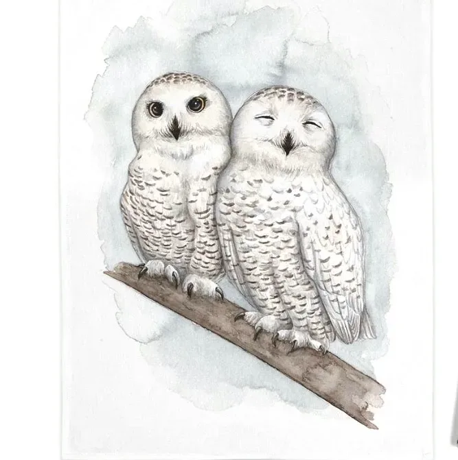 Motivet er her to skønne ugler. De kære fugle er trykt på en fin lys snehvid baggrund. De to sneugler sidder tæt sammen på en gren. Den ene har lukkede øjne og den anden kigger betuttet med sine søde store øjne.