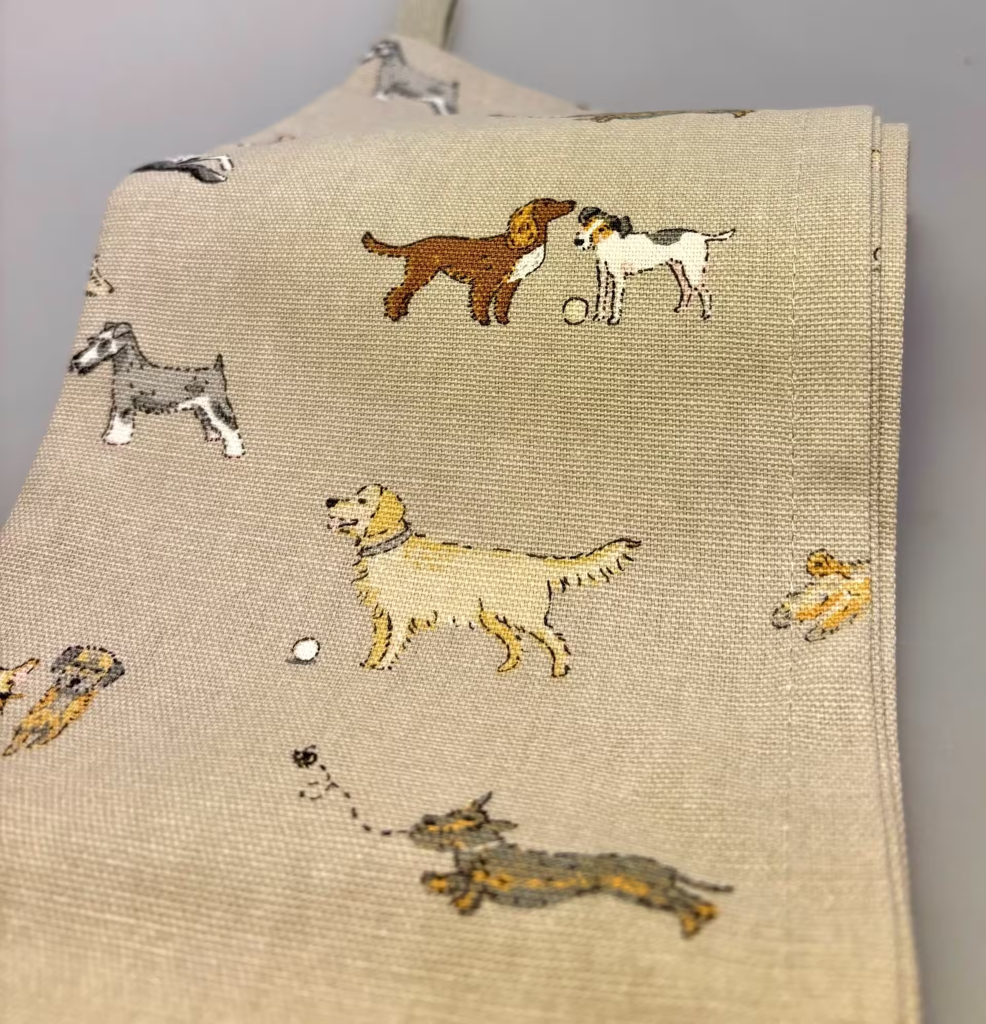 Skønt viskestykke i bomuld med det fineste mønster af forskellige hunde – ruhåret gravhunde, golden retriever, spaniels og corgi’er. Mynder, ulvehunde, schnauzere og dansk svenske gårdhunde eller jack russel terriere. Cocker eller amerikansk cocker spaniels, cairn terrier og søde doodles.
