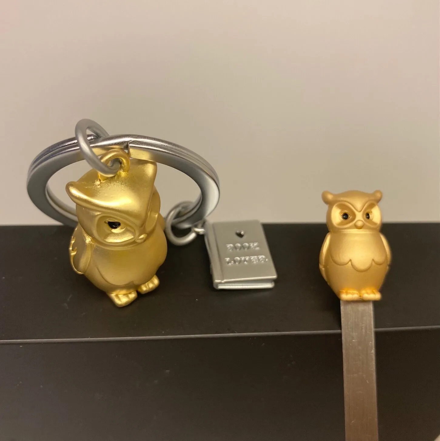 Nøglering med mat guldugle og sølv bog.