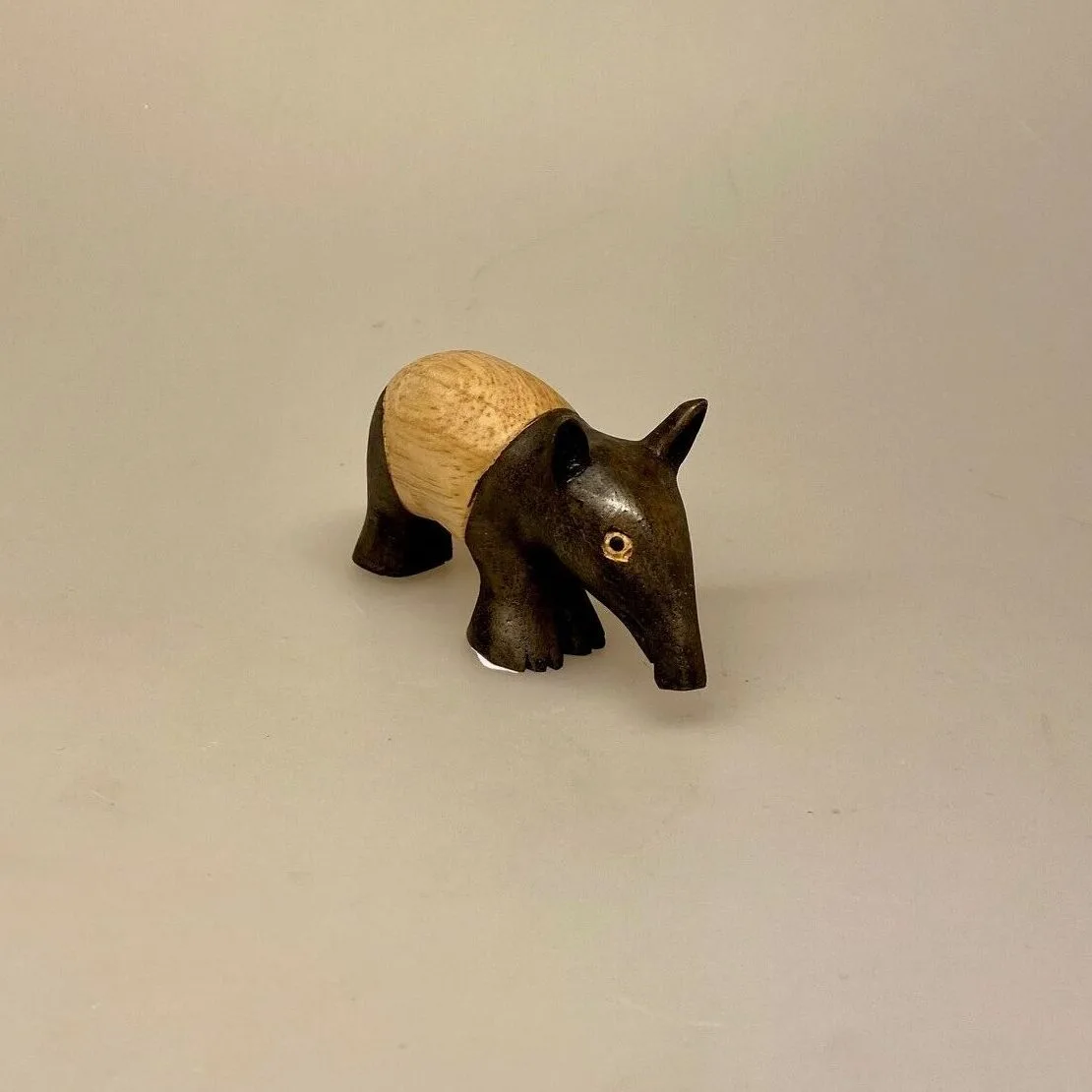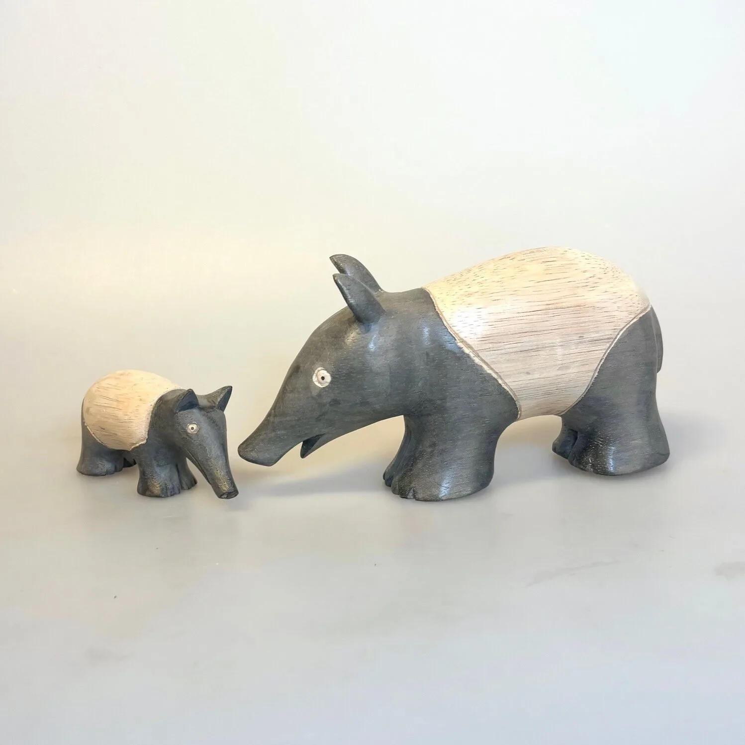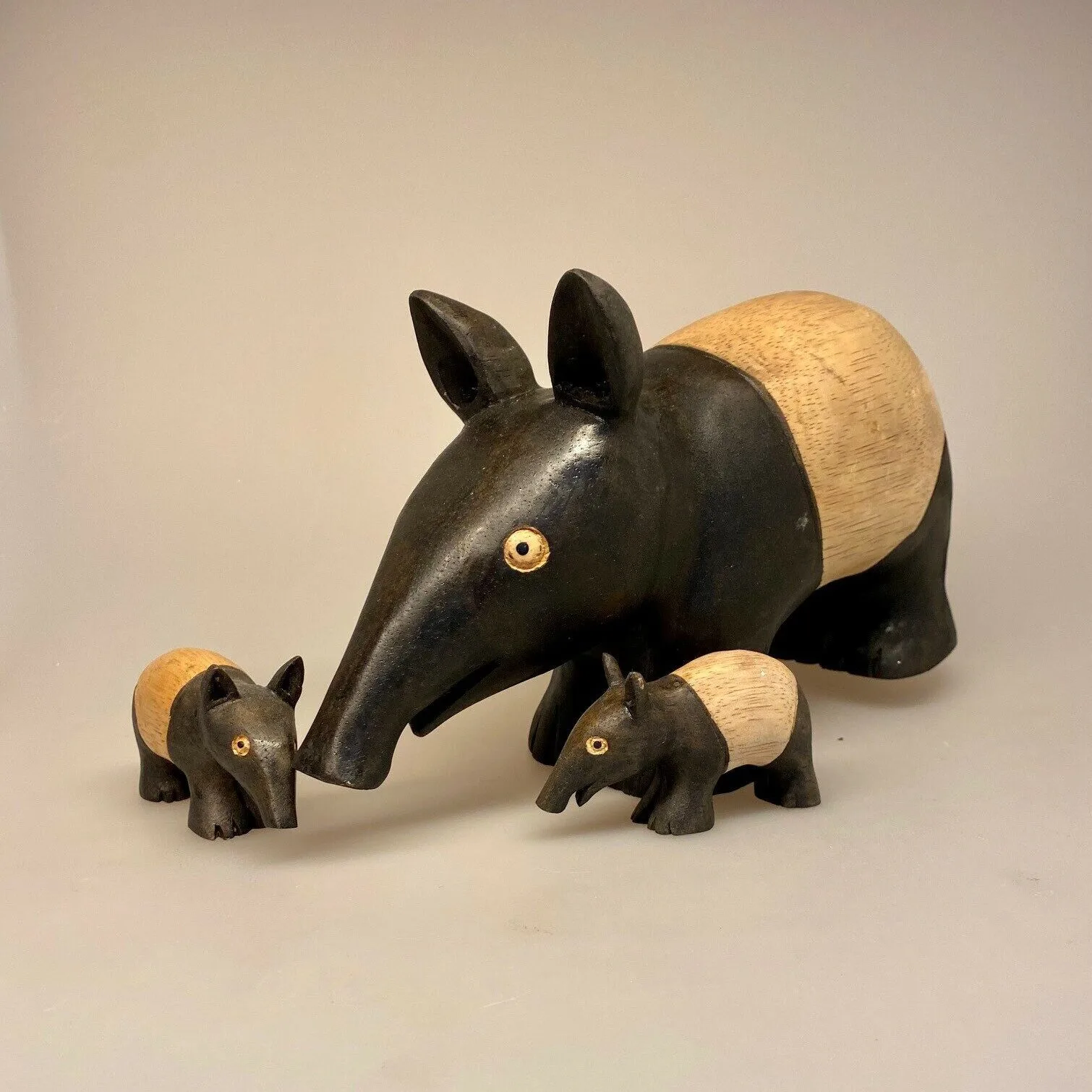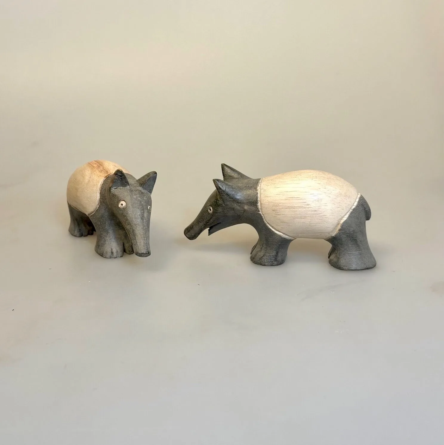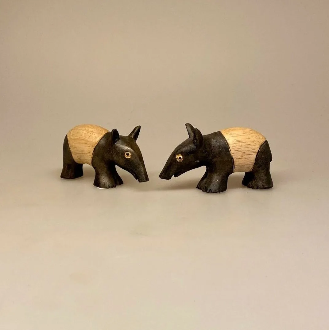 Skøn lille figur håndsnittet af træ og indfarvet i de rette farver. Hver enkelt tapirfigur er skåret ud i hånden og derefter malet, således at Tapirens karakteristiske farveaftegninger i mørk og lys ser rigtigt ud.