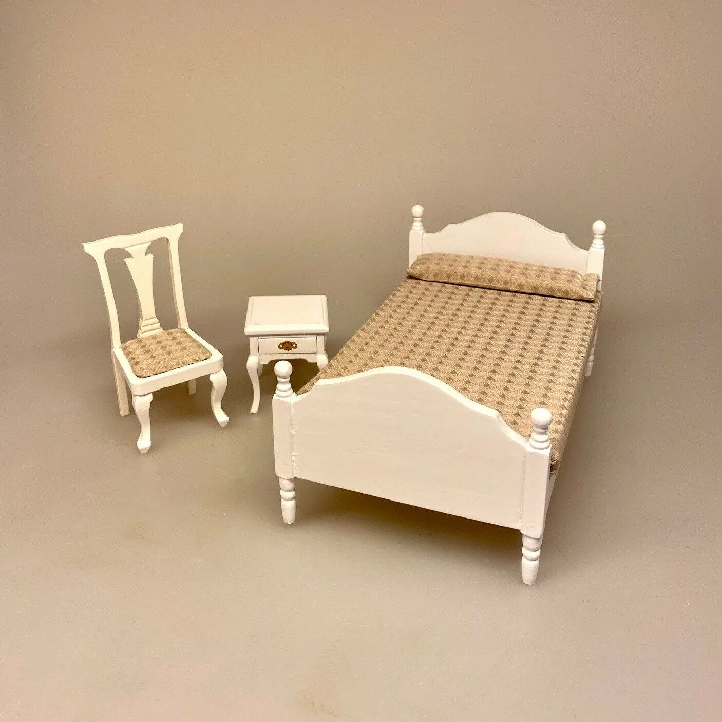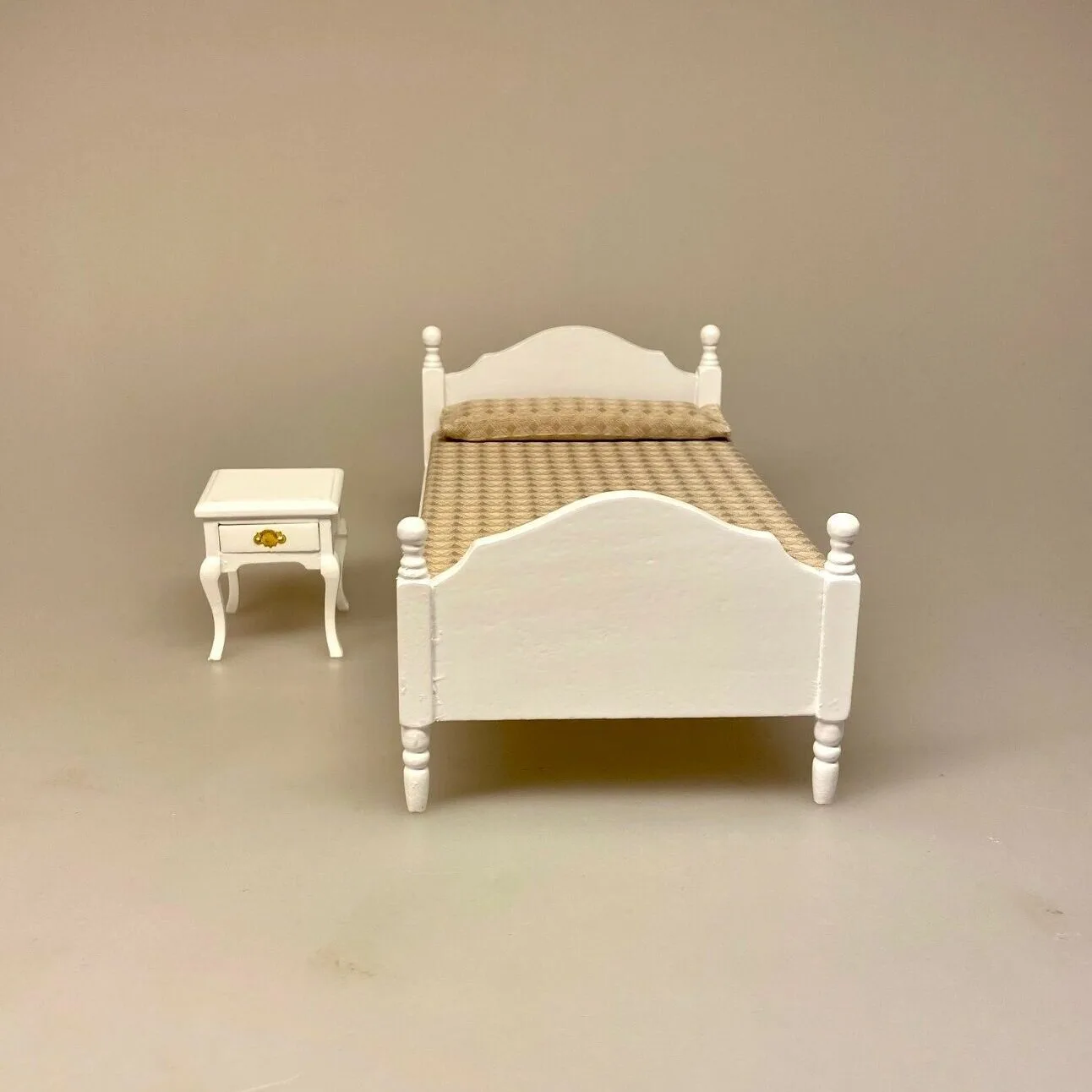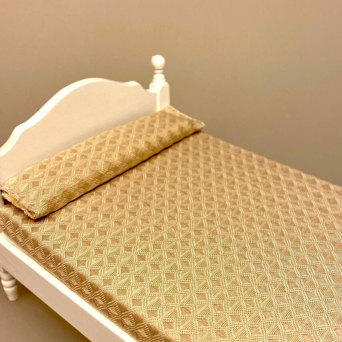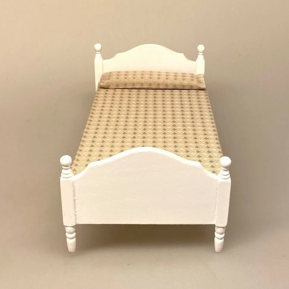Herlig håndlavet seng til dukkehuset. Den bløde lille dobbeltseng er lavet i hånden og har flotte detaljer. Møblet er udskåret af træ og hvidmalet. Sengegavlen og fodenden er smukt buede. Benene er drejede og stolperne ligeså med kugler. Sengen er redt og dækket med et fint sengetæppe i smukt bomuldsstof. Stoffet er sandfarvet og mønstervævet med et lille rombemønster.