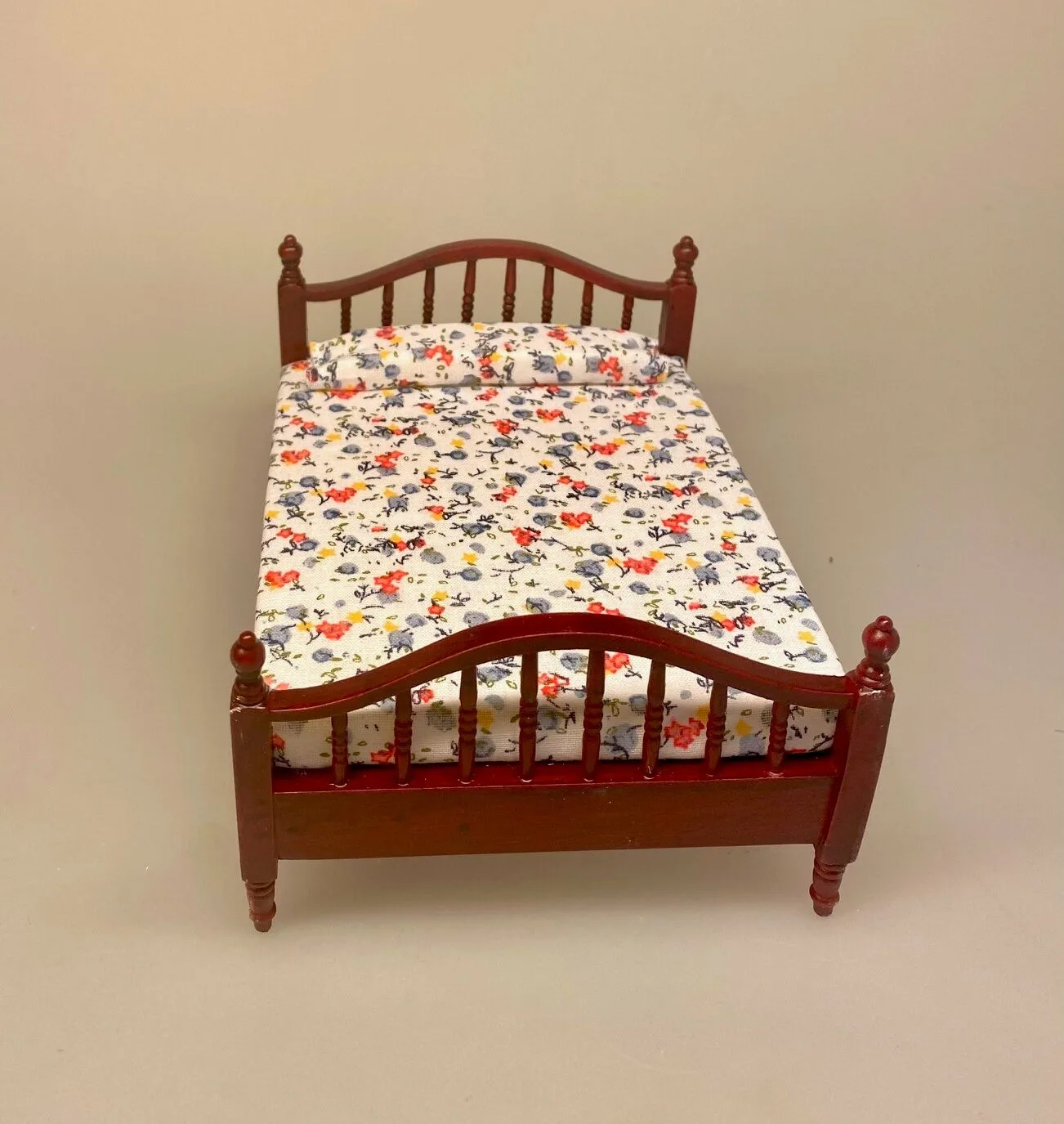 Herlig håndlavet seng til dukkehuset. Den bløde dobbeltseng er lavet i hånden og har flotte detaljer. Møblet er udskåret af mahognibejdset træ. Sengegavlene er høje og flot buede og begge har flotte drejede balustre og stolper med kugler. Sengen er redt og dækket med et fint sengetæppe i bomuldsstof. Stoffet er småmønstret med småbitte blomster i hvidt, rødt og blåt.