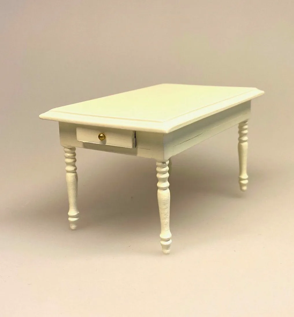 Fint lille håndlavet spisebord af cremefarvet træ. Spisebordet her er enkelt og anvendeligt. Det er et rektangulært bord af træ i dukkehus størrelse. Bordpladen har en fin kant og de runde drejede ben har flot rille mønster. I hver ende har bordet en skuffe, der kan trækkes ud. Bordet er lavet af træ, som er malet flødefarvet.