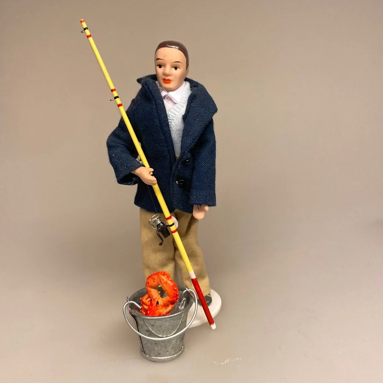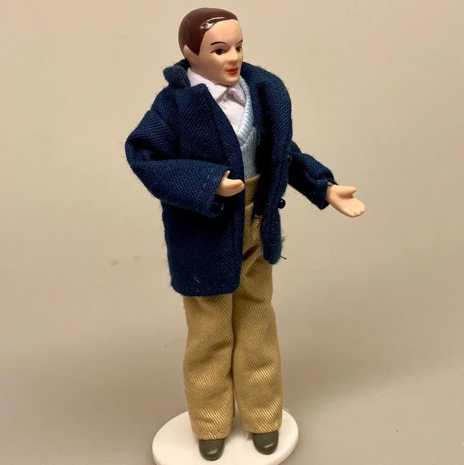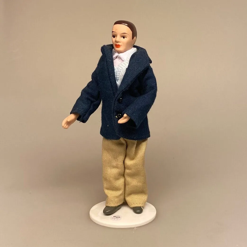 Fin dukke til dukkehuset. Manden her er iført sandfarvede lærredsbukser, hvid skjorte og lyseblå vest, under en marineblå jakke. På fødderne har han grå sko. Han har et venligt ansigt og tætklippet mørkt hår.