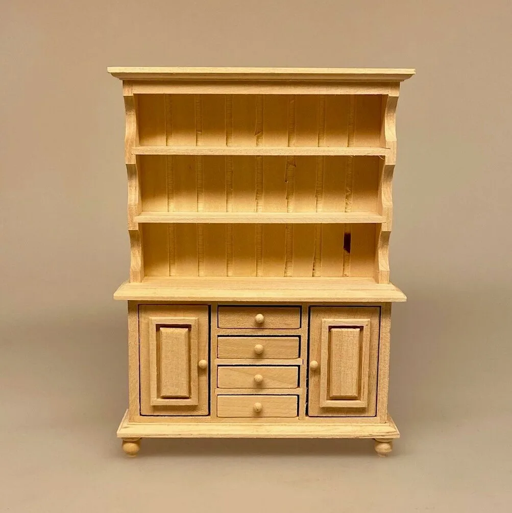 Det fine miniature møbel her er håndlavet af træ. Den natur farvede buffet er enkel, men udført med elegante detaljer. Øverst er en høj åben reol med tre hylder, fine paneler som bagvæg og lige top med tag. Under bordpladen er en række med fire skuffer i midten, hver flankeret af et skab med flot profilering. Skuffer og skabe har små drejede træknopper og kan åbnes og fyldes med ting.