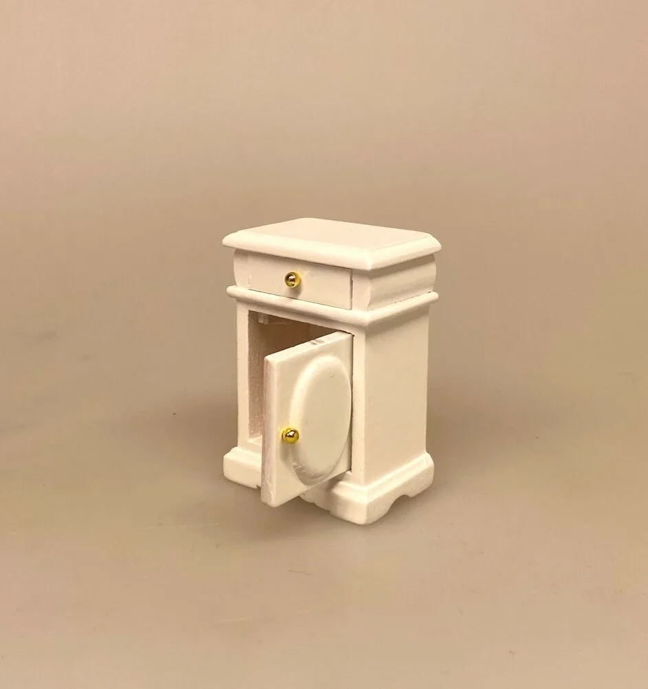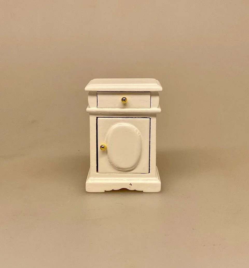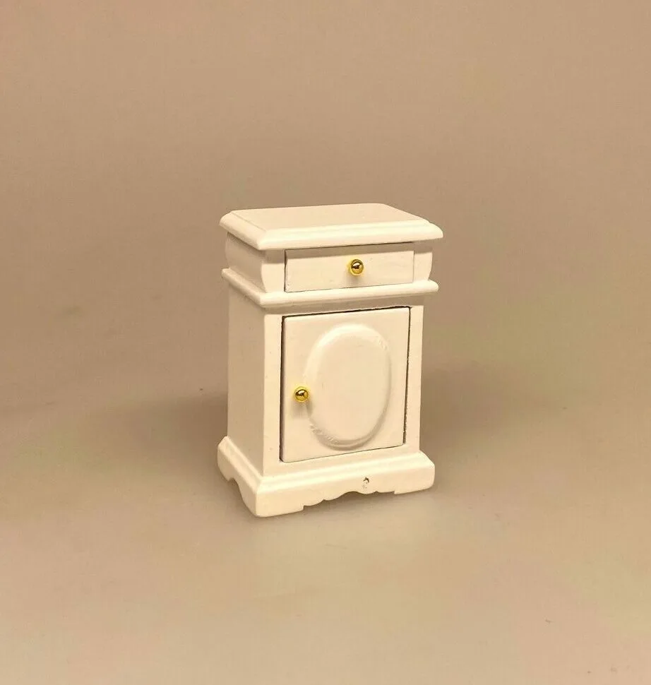 Møblet er flot udført i træ, som er hvidmalet. Det lille skab har en skabslåge med udskåret oval og herover en skuffe. Begge med runde gyldne greb. Det lille servantemøbel er perfekt i soveværelset, entreen eller badeværelset i dukkehuset eller det lille nissehus.