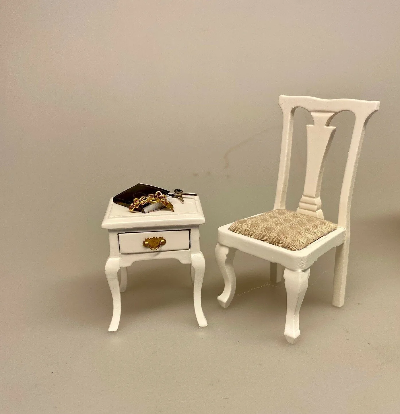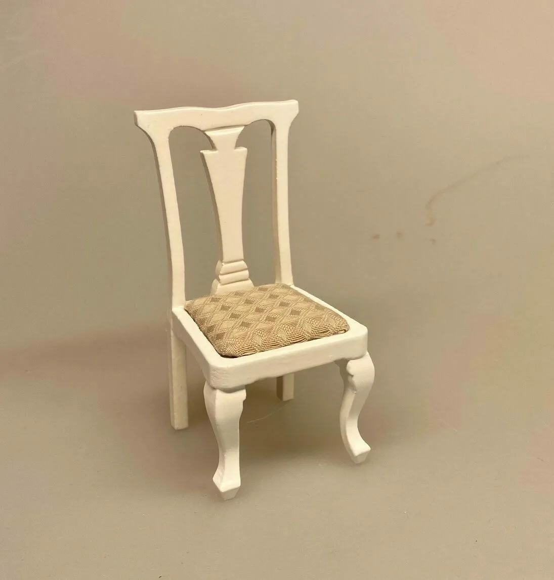Flot stol håndlavet af træ til dukkehuset. Stolen er lavet i hånden af hvidmalet træ, med flotte detaljer. Stolens ryg er udskåret med midterstykke, vingeformet top. Stolebenene er enkle bagerst og smukt buede ben forrest. Sædet er polstret med jacquardvævet sandfarvet stof.