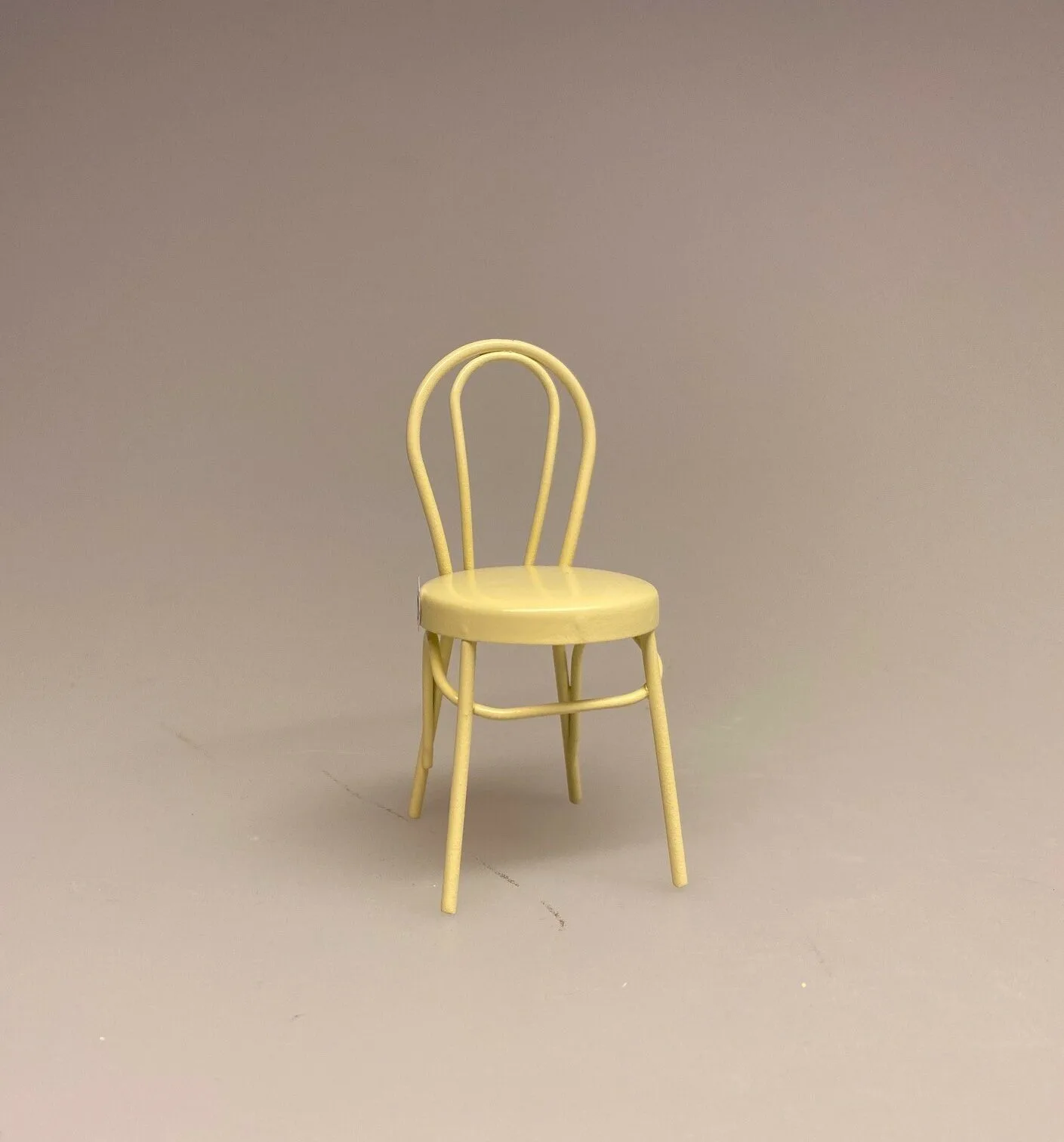Fin lille håndlavet stol af metal. Enkel og anvendelig stol af lakeret metal i dukkehusstørrelse. Stolen er en helt enkel model med rundt sæde, slanke ben og åben oval ryg af dobbelt tråd. Helt i creme.