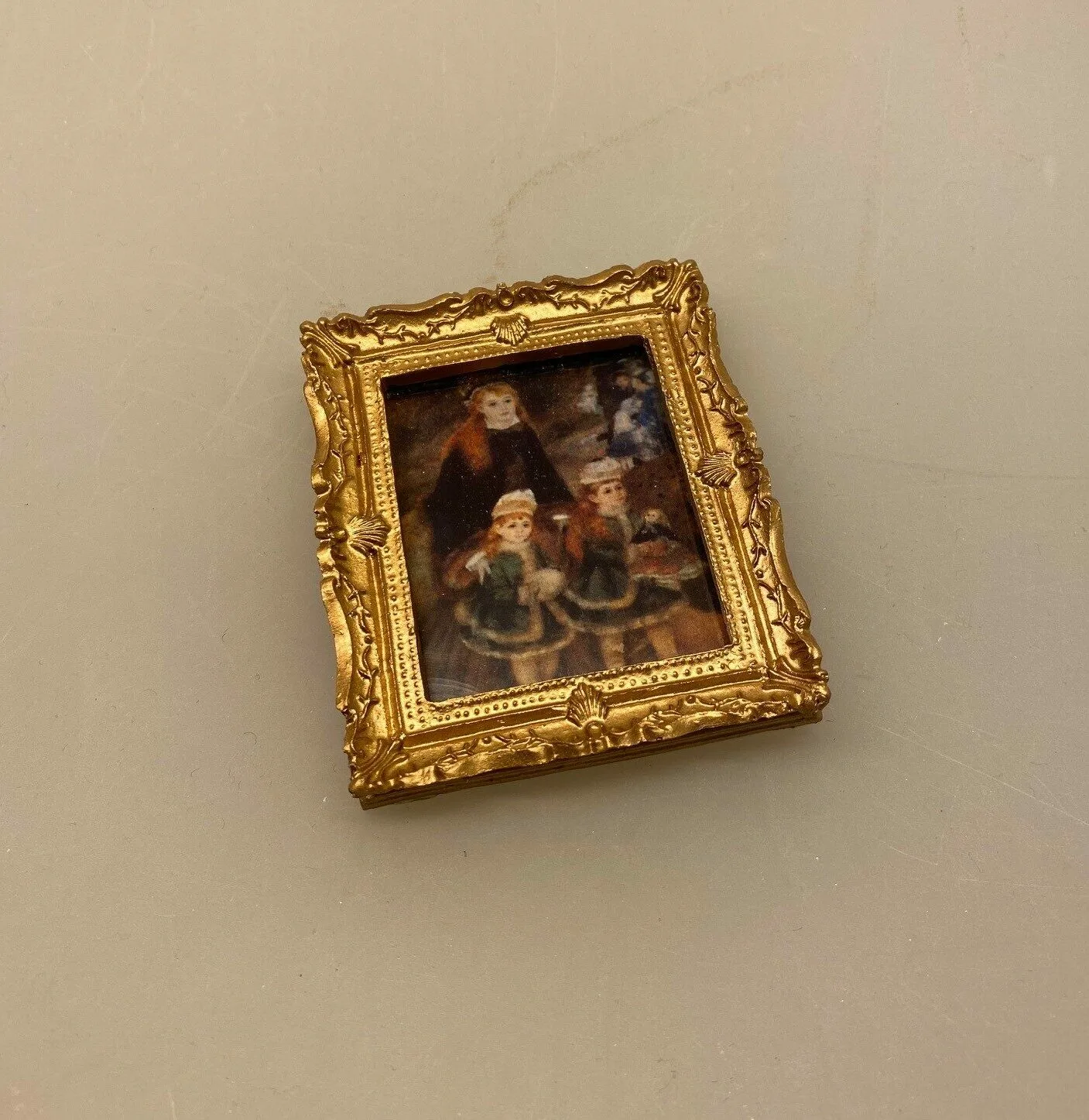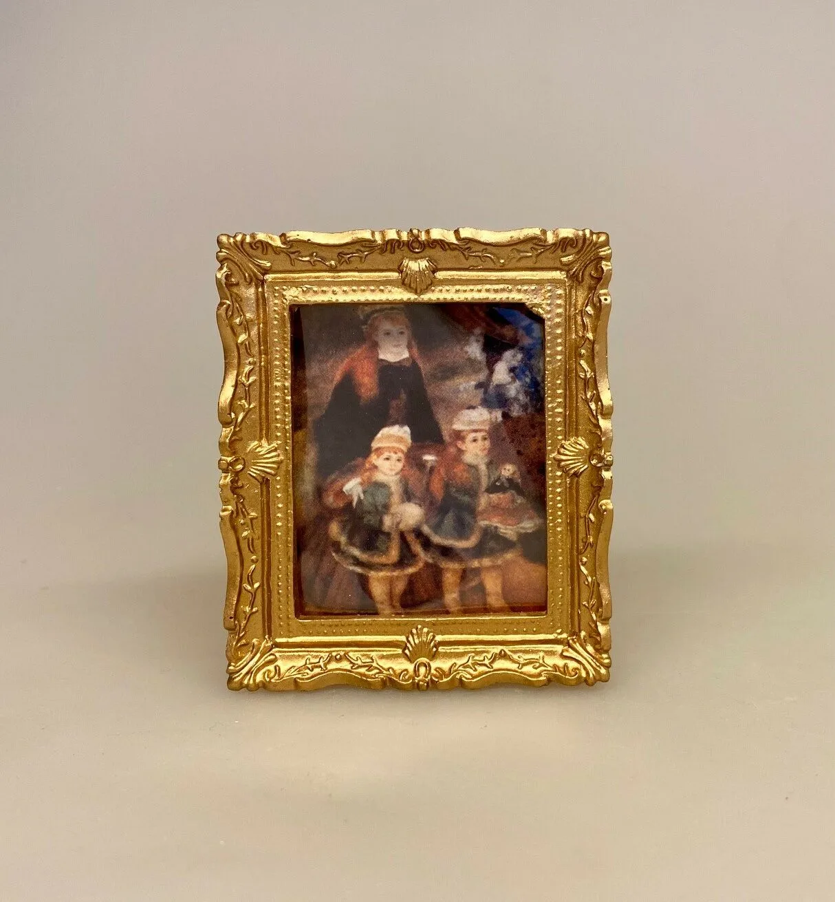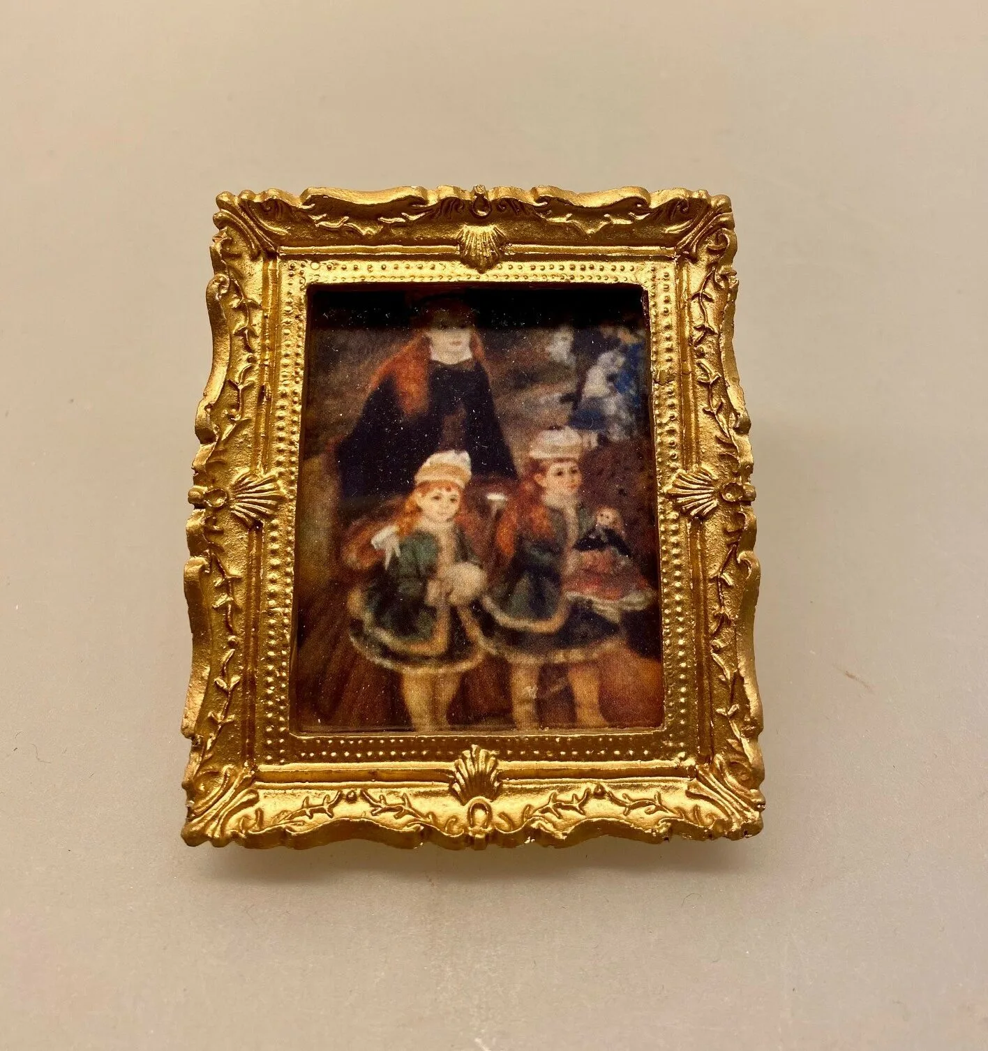 Fint billede i mini størrelse. Det lille maleri er inspireret af den franske maler Pierre Auguste Renoirs værker og forestiller en stor pige, der går tur med to mindre piger. Rammen er rigt udsmykket med udskæringer og har en flot guldfinish.