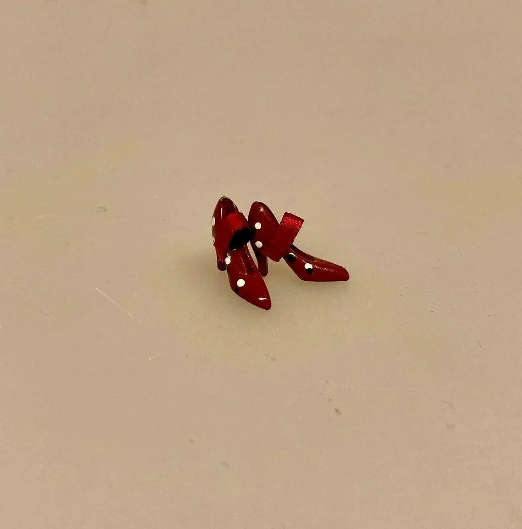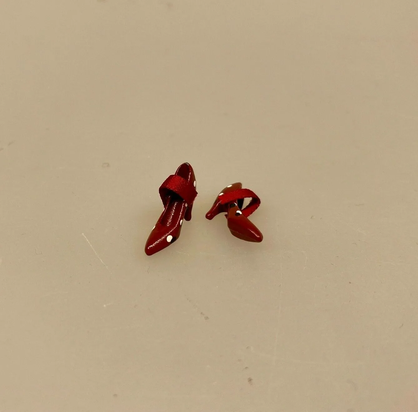Herlige bittesmå sko – dansesko til dukkehusets damer. Elegante bordeaux sko med hæl, hvide prikker og rem. De fine højhælede sko har samme vinrøde farve indvendigt. Skoene kan stå til pynt mange steder i dukkehuset.