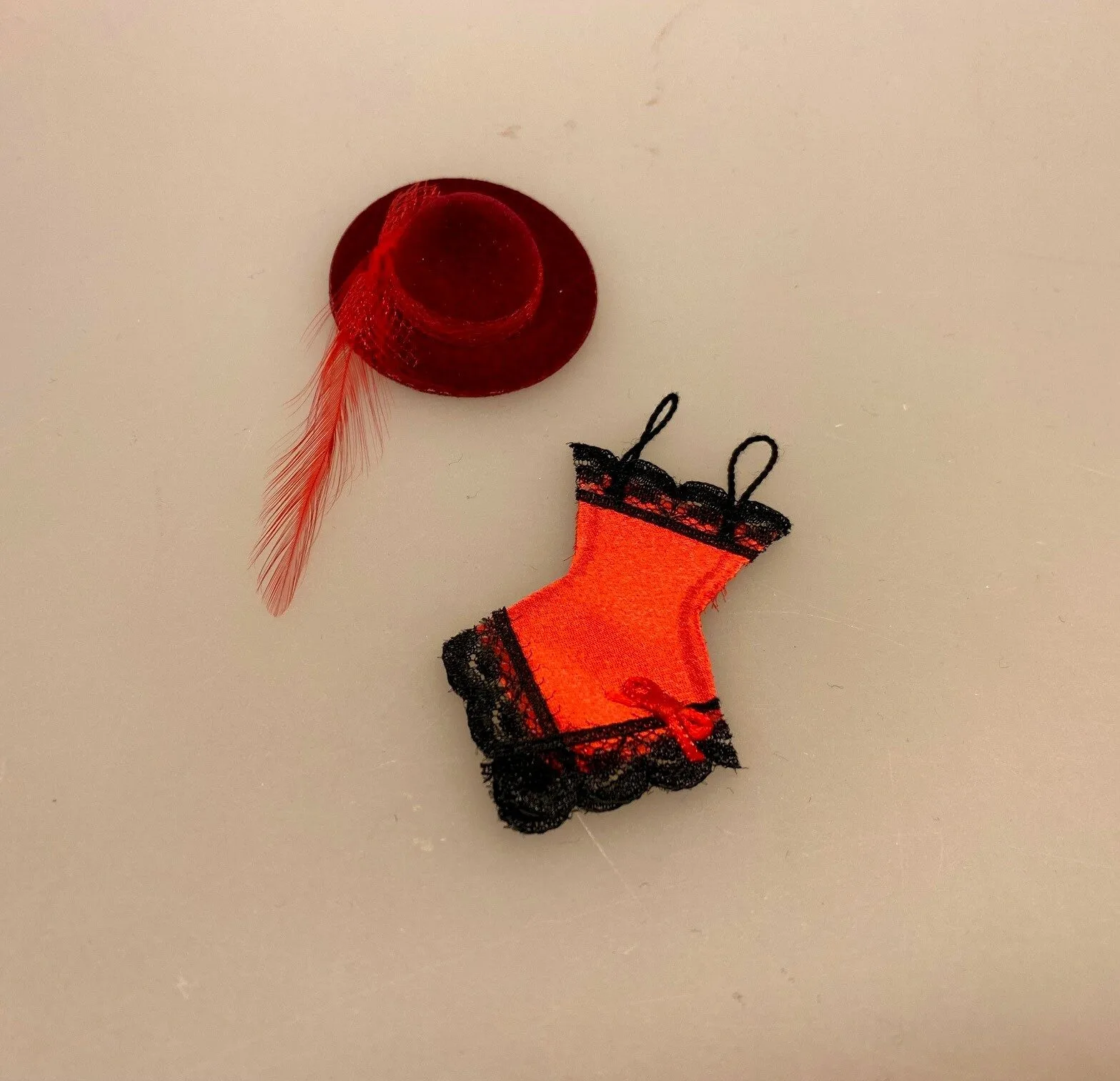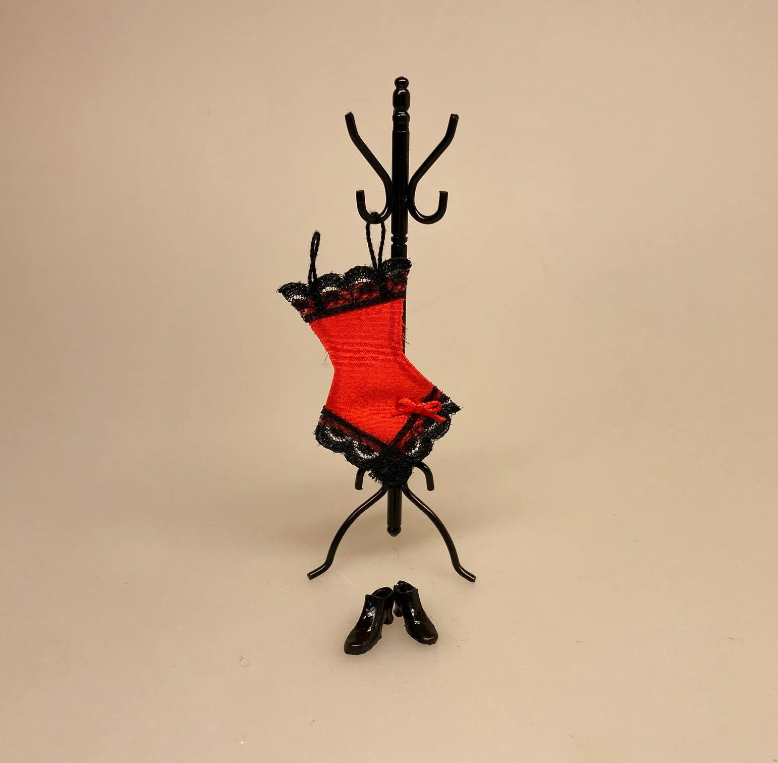 Herligt undertøj til dukkehusets dame. Elegant silke neglige i rød satin med sorte blonder. Undertøjet har tynde sorte stropper, så det kan hænges på en bøjle eller knage.