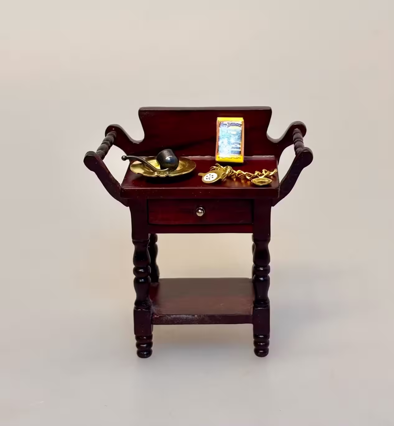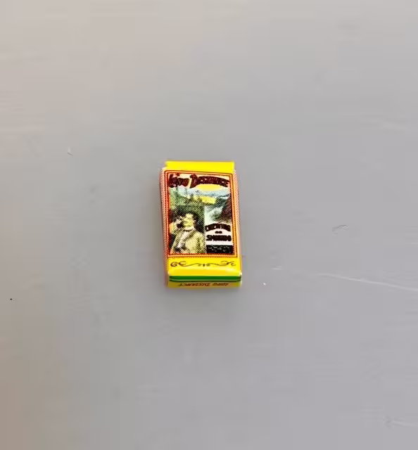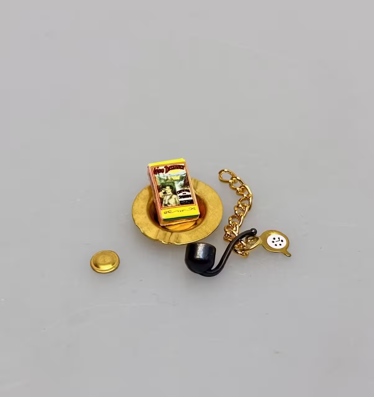 Sæt i miniaturestørrelse her består af en pibe, et gyldent askebæger og et lommeur med kæde, samt en elegant gul pakke med cigaretter. Cigaretpakken er en Long Distance med billeder af en livsnyder med adeligt udseende. Piben af metal er mørk og svunget. Askebægeret af messing er rundt og med fordybninger til cigarer og cigaretter. Desuden medfølger en lille urkæde, samt en glat guldmønt.